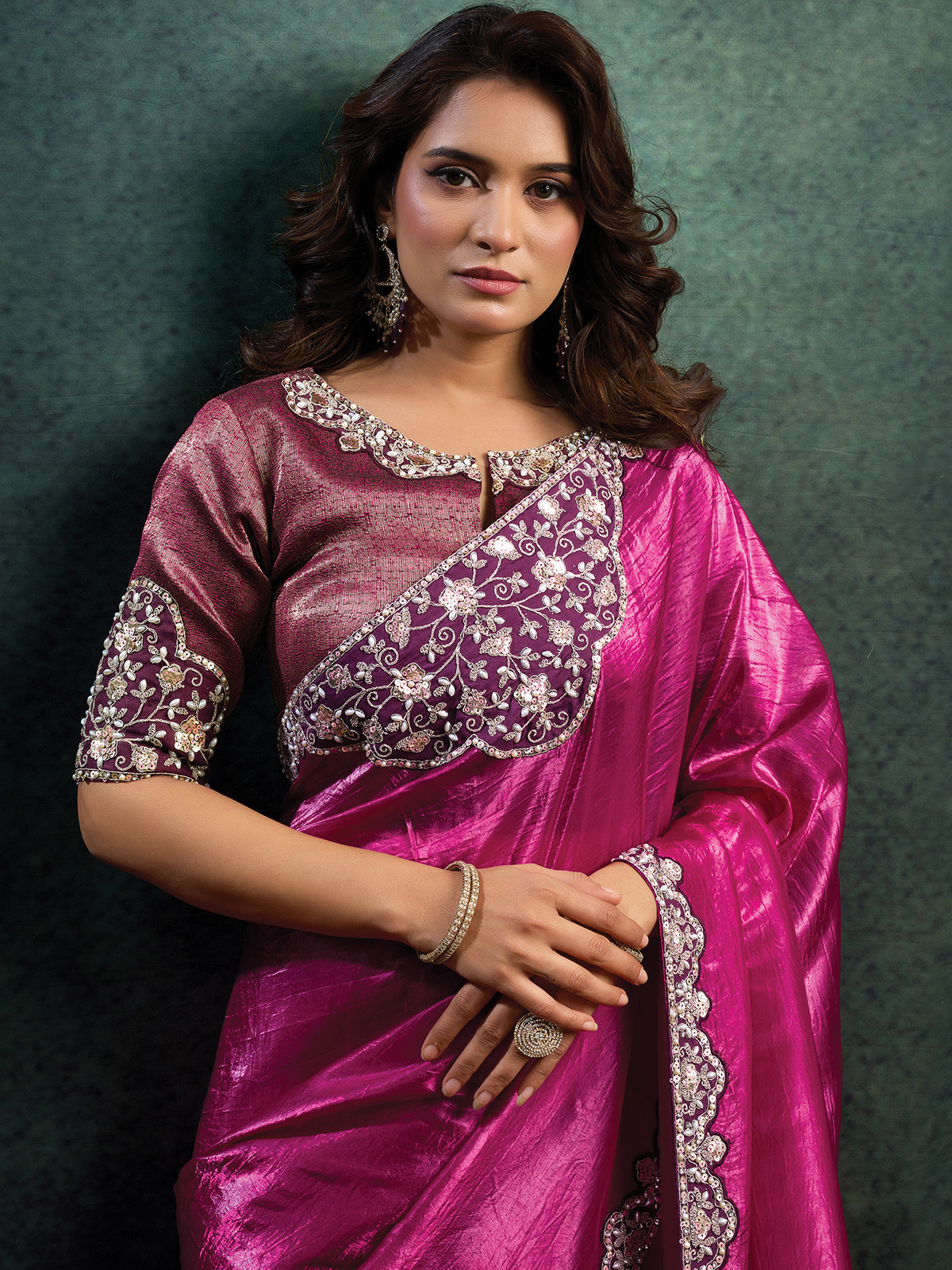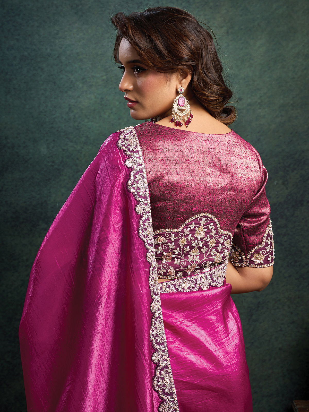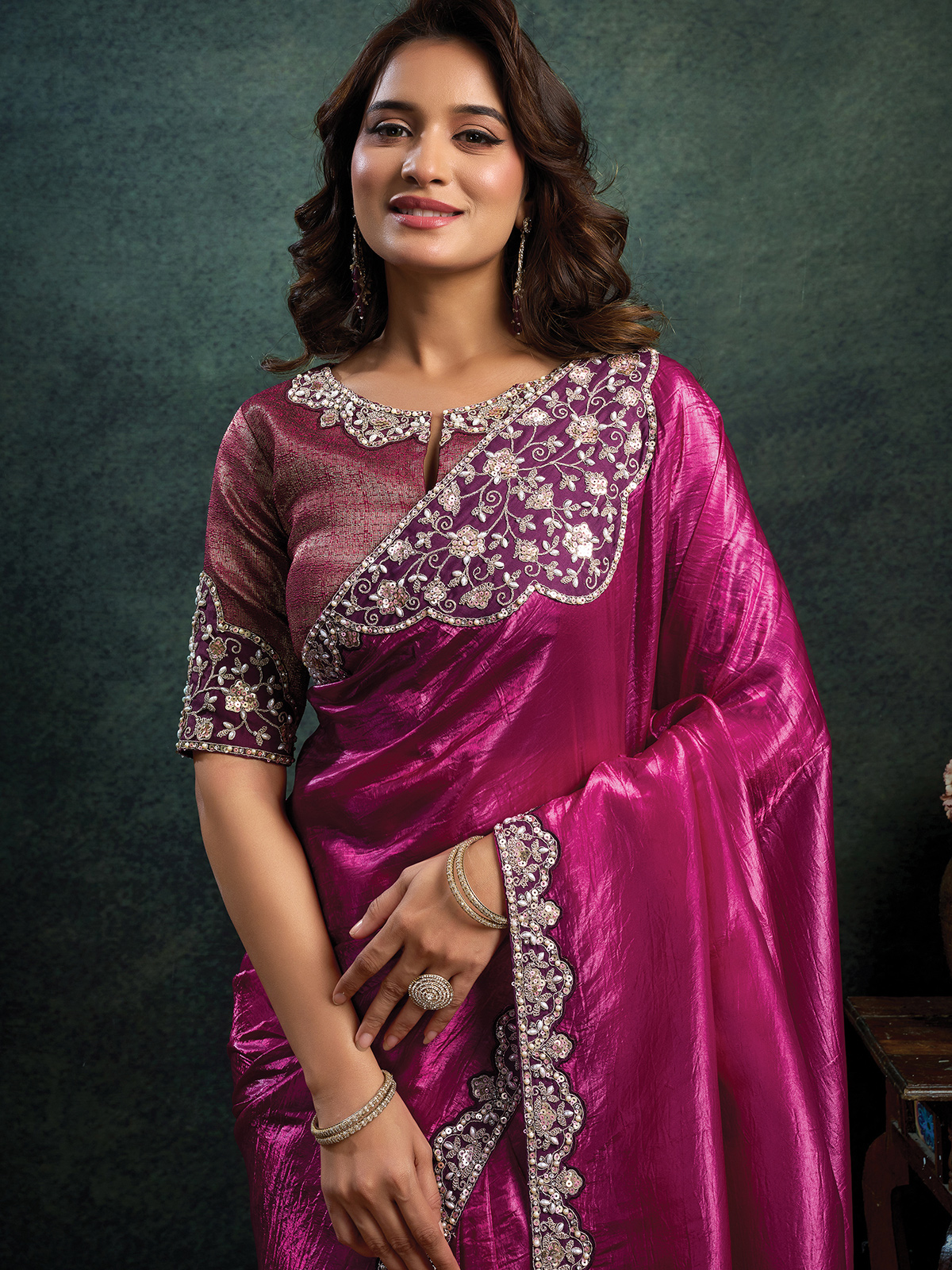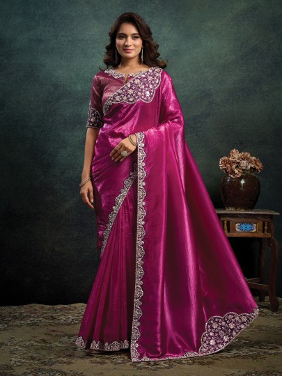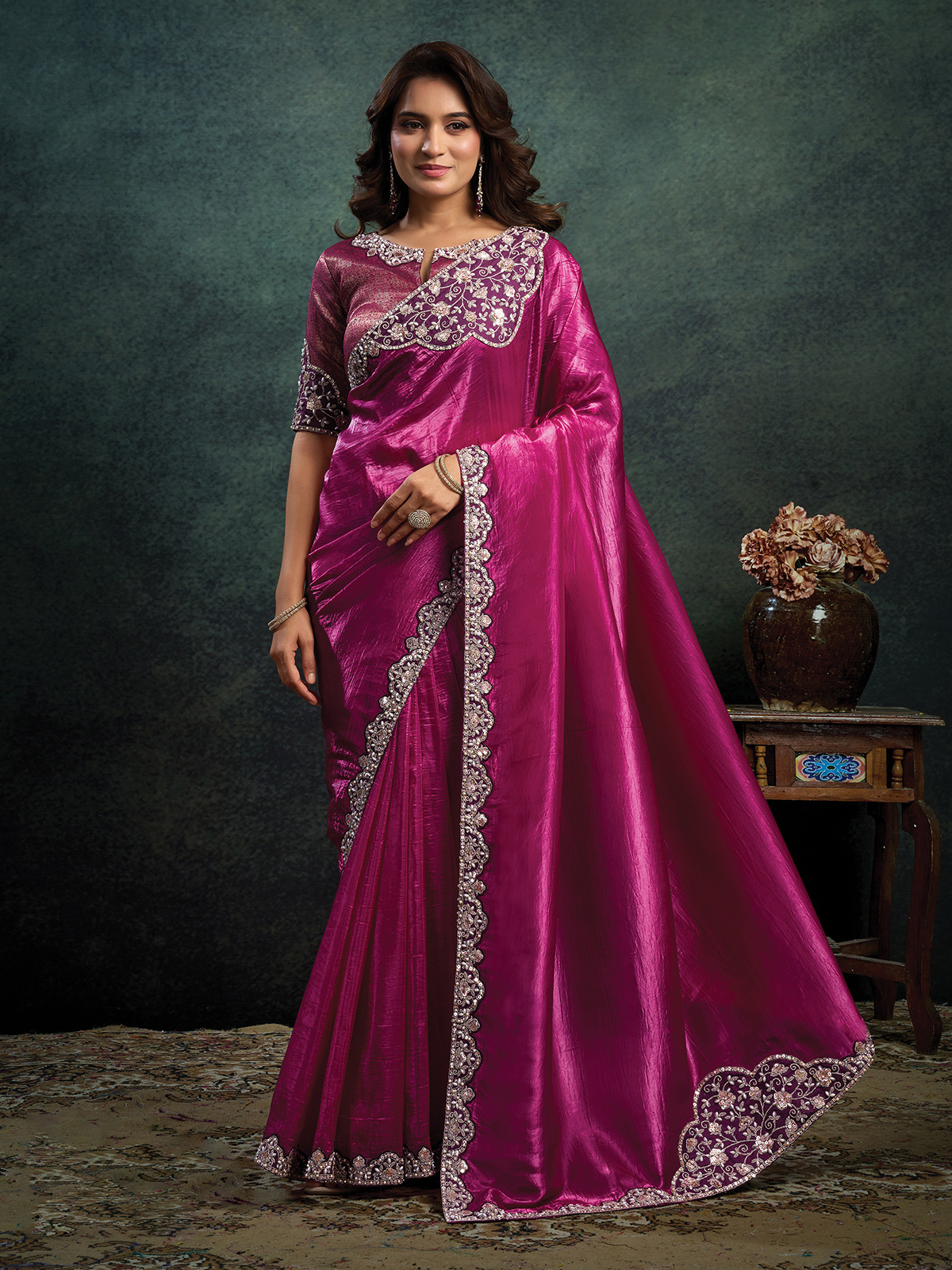 Rendered in vibrant magenta cruss satin silk, this designer saree showcases pearl, sequin, thread and diamond work for striking festive glamour. The glossy fabric enhances its luxurious appeal. Paired with an unstitched blouse piece, it is perfect for weddings, receptions, sangeet and grand celebrations.