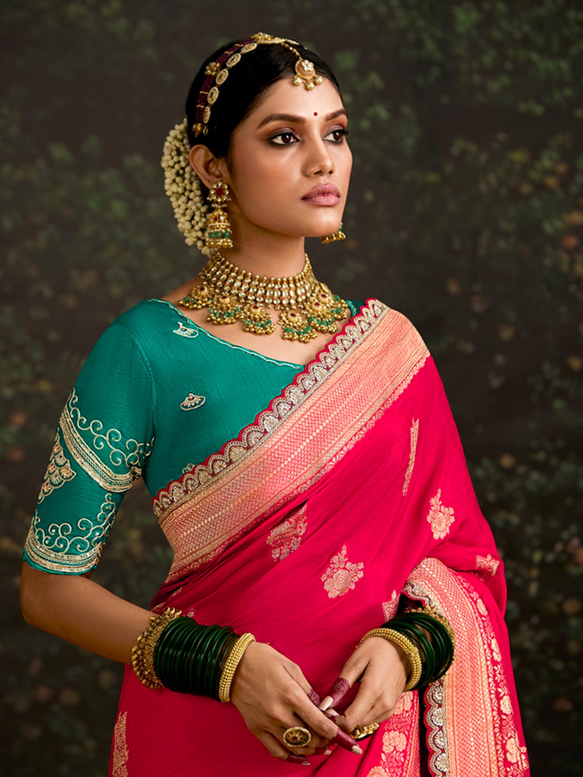 Made for the wedding season, the magenta dola silk saree is beautifully decorated with sequin and zari embellishments. Completed with an aqua blouse piece for a vibrant contrast.