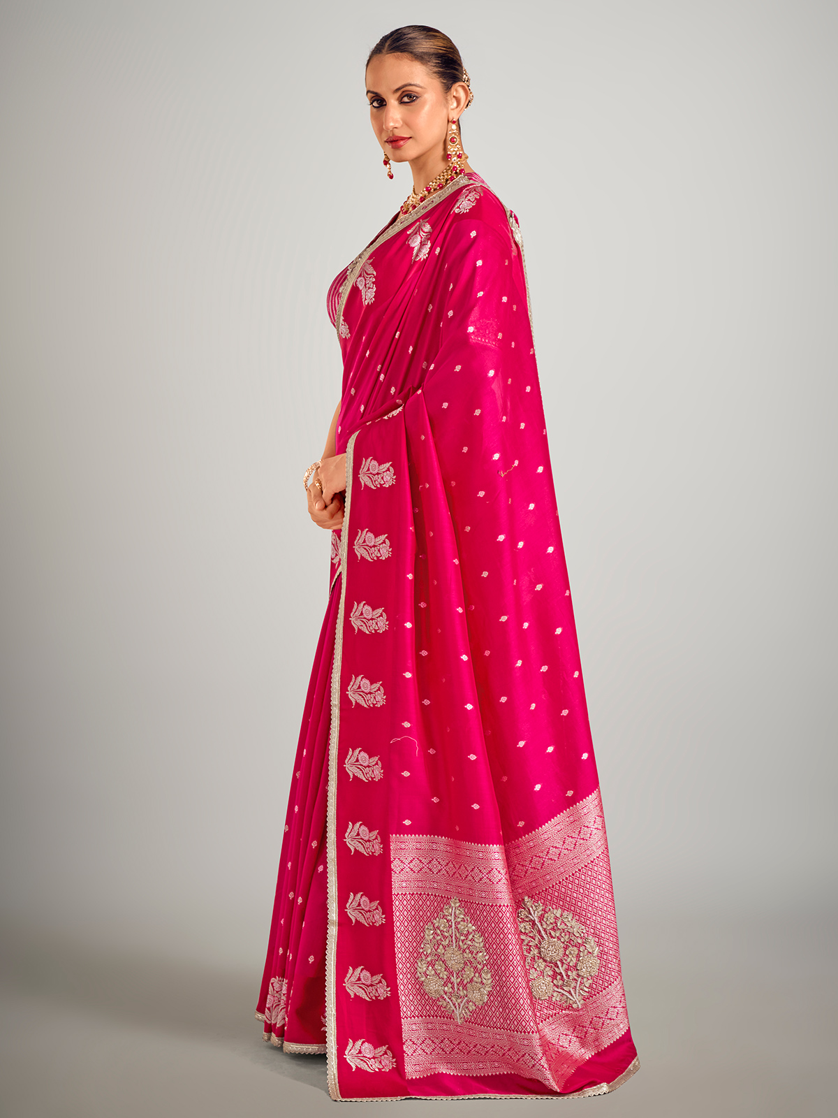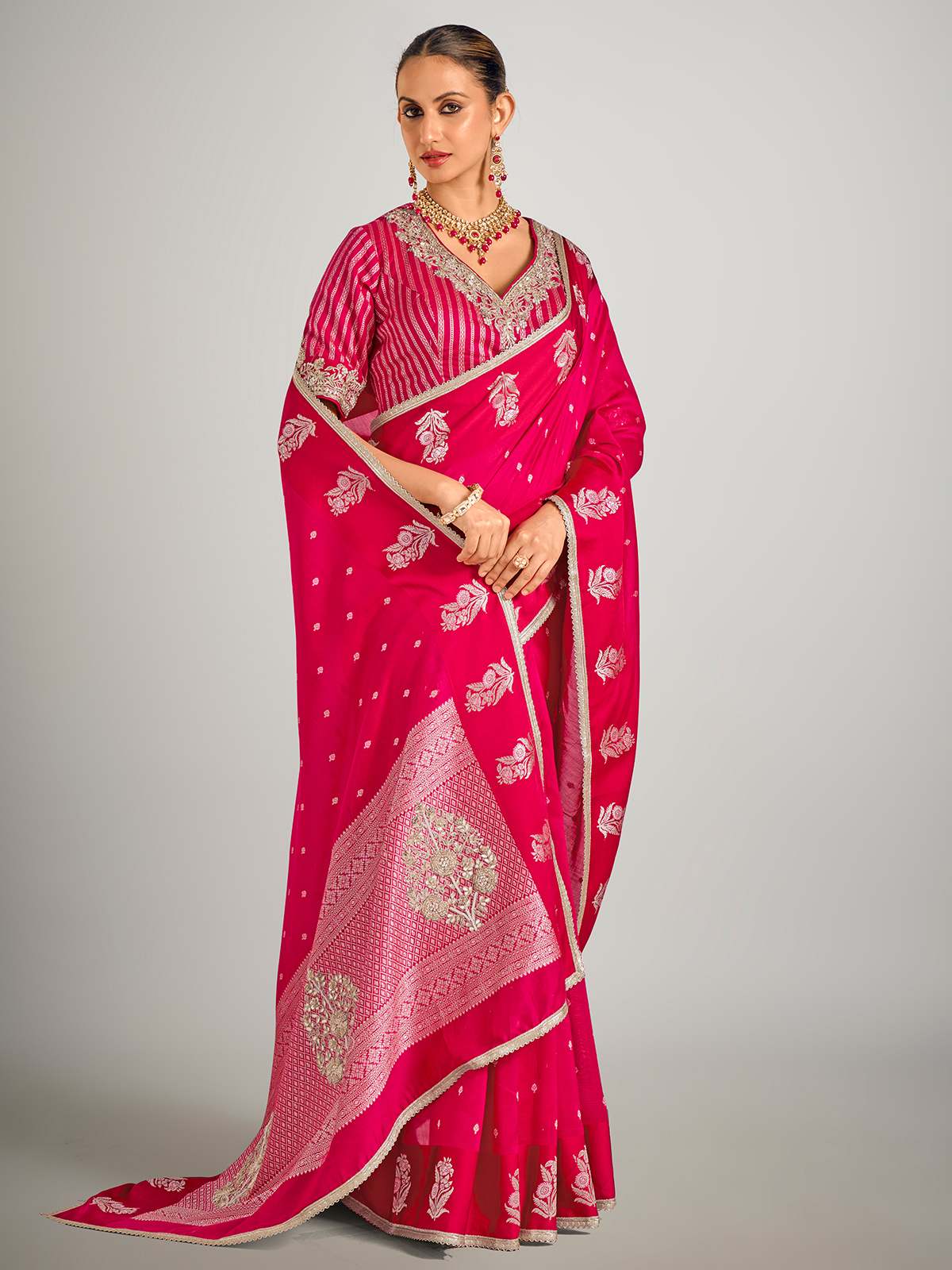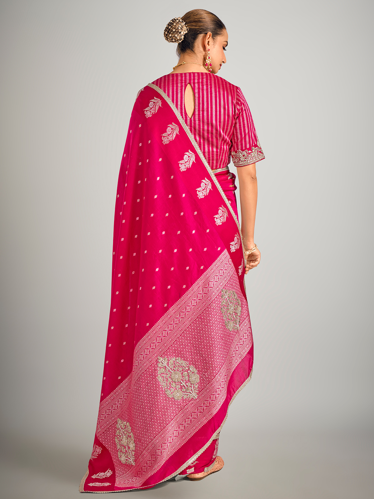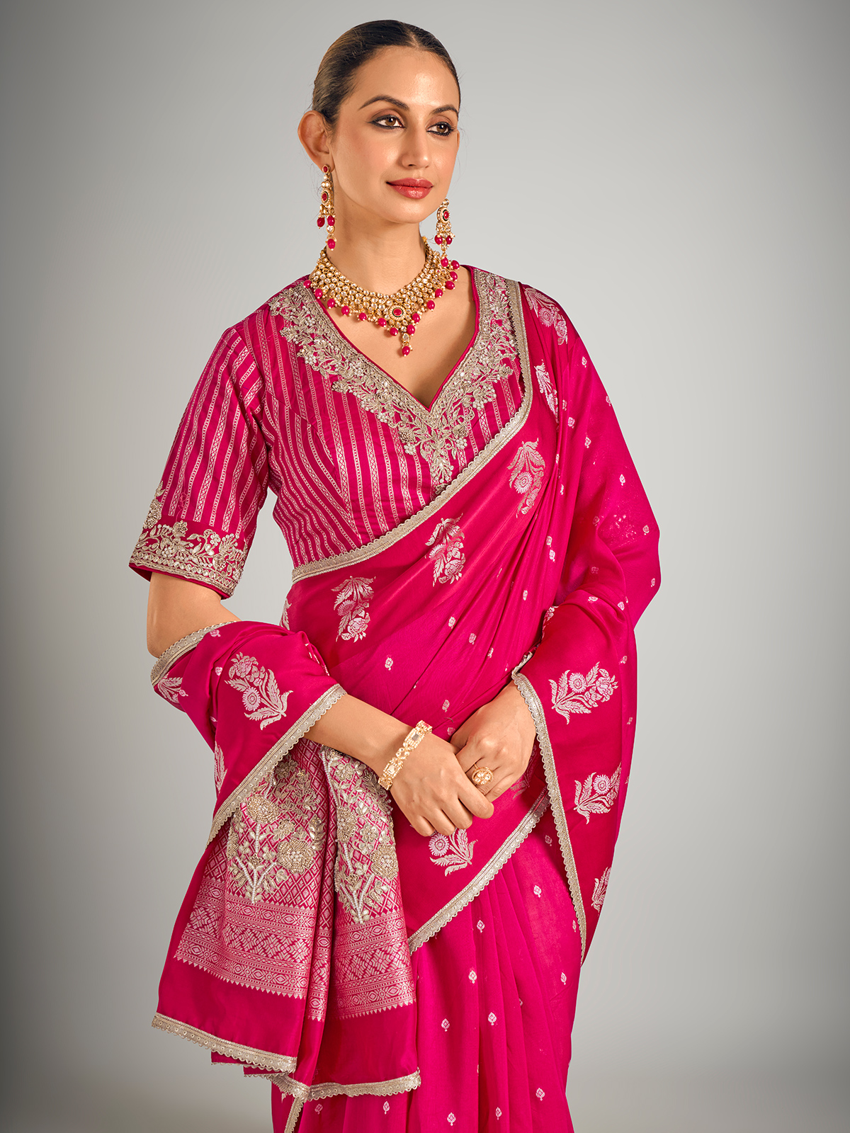 Presenting the stunning resham, stone, beads, zari, and zardosi work on this magenta dola silk saree that is sure to turn attention. Includes a premade blouse.