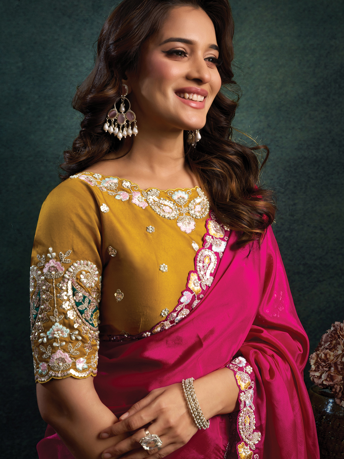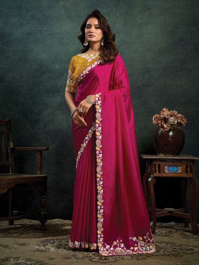 Designed in rich magenta satin silk, this saree features embroidery, stone and applique work for classic festive charm. The lustrous fabric offers a graceful silhouette. Paired with an unstitched blouse piece, it is ideal for weddings, receptions, festive gatherings and elegant sangeet celebrations.