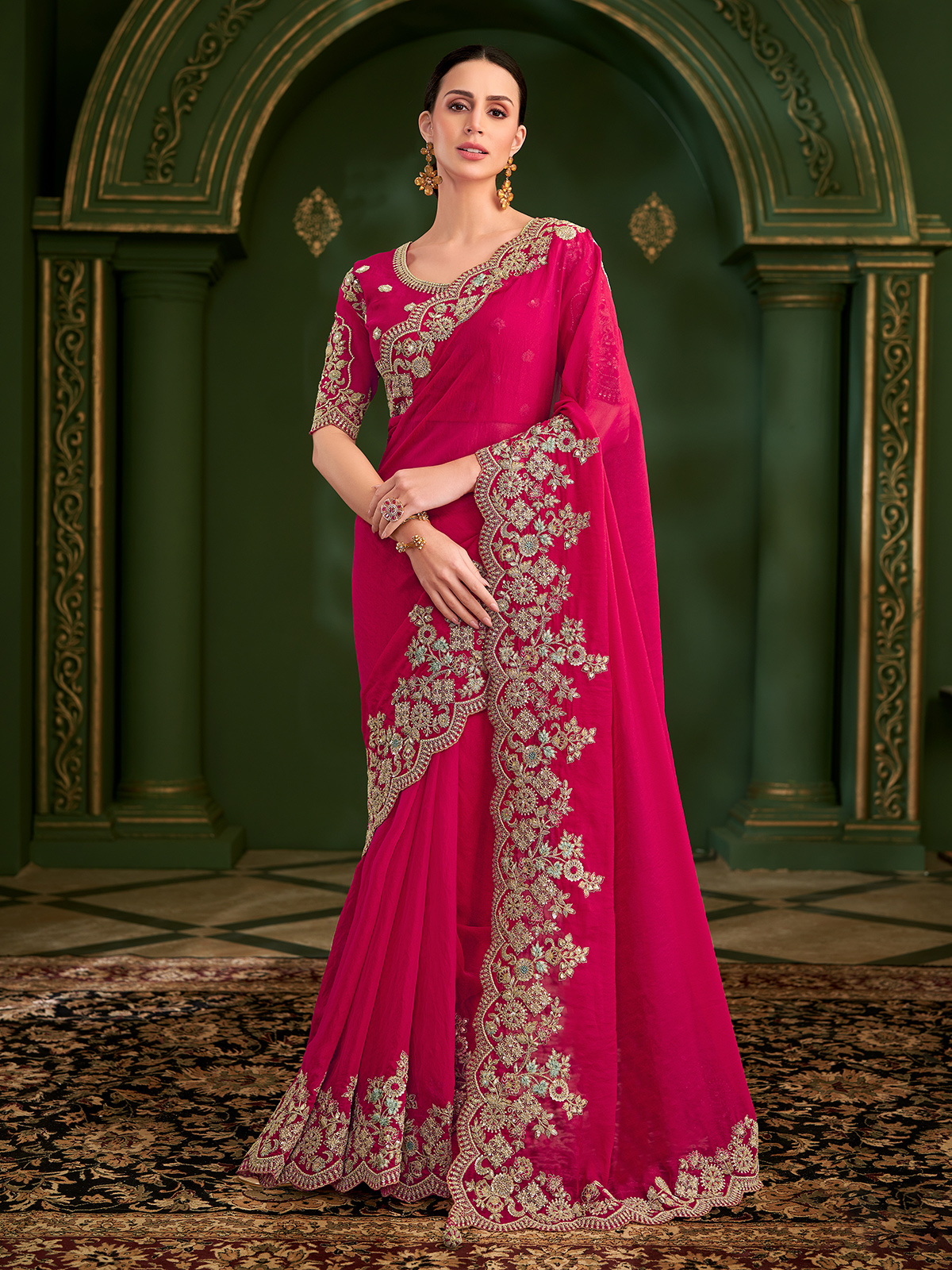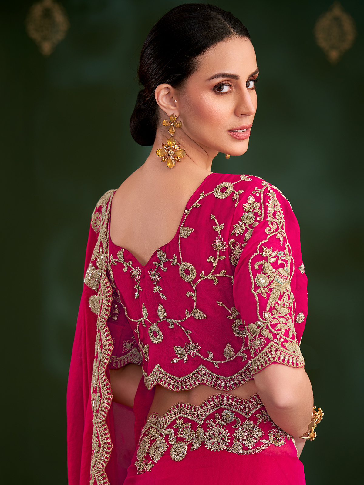 Crafted in rich magenta georgette elegant saree is adorned with intricate embroidery highlighted by sequins, zardosi and fine thread work. Paired with an unstitched blouse piece, it creates a graceful drape ideal for weddings, receptions, sangeet and festive celebrations.