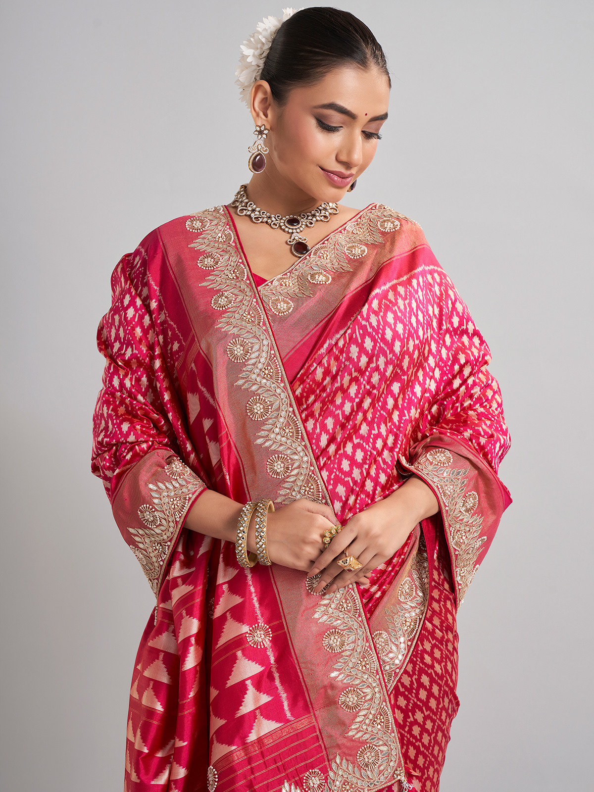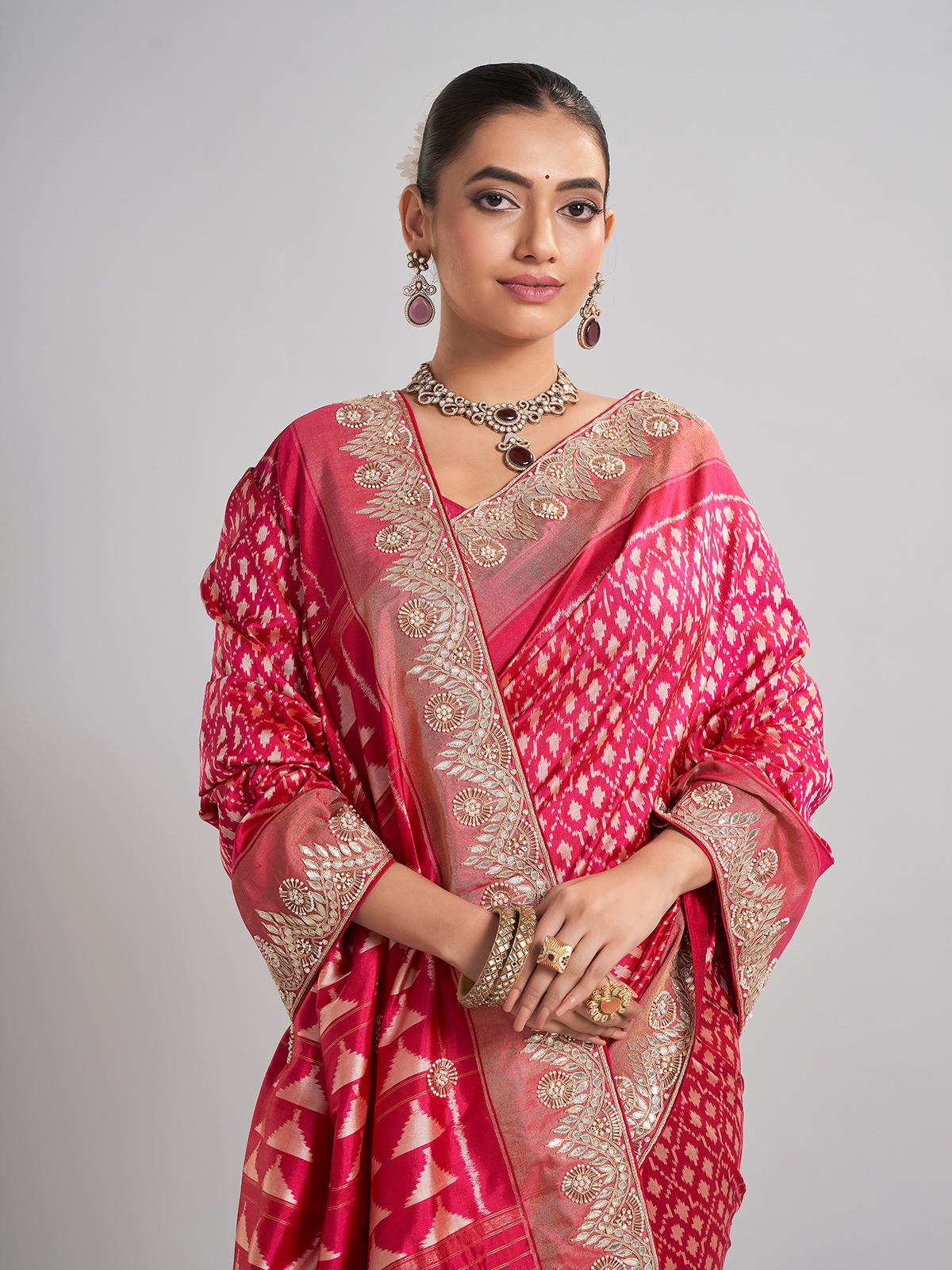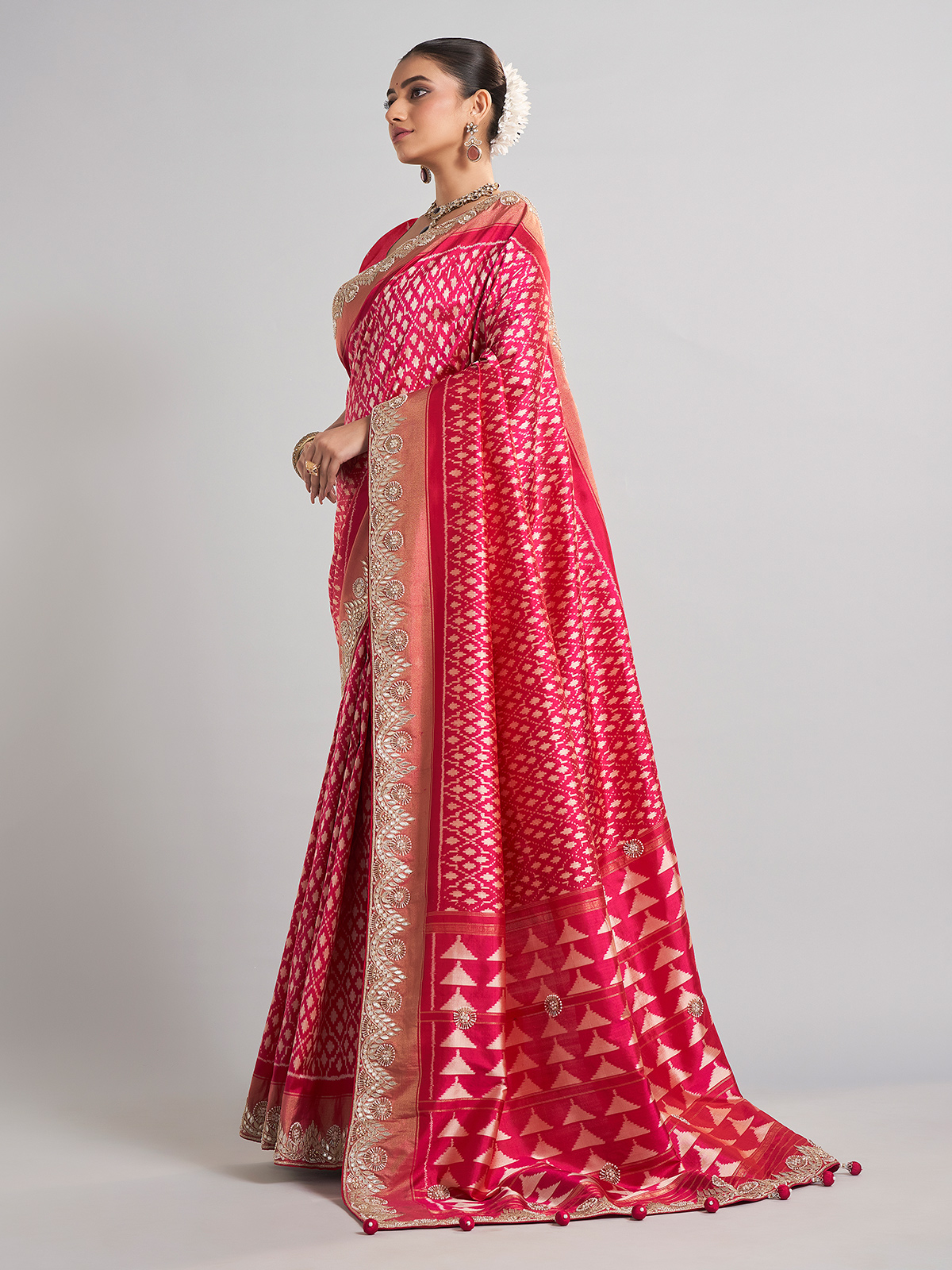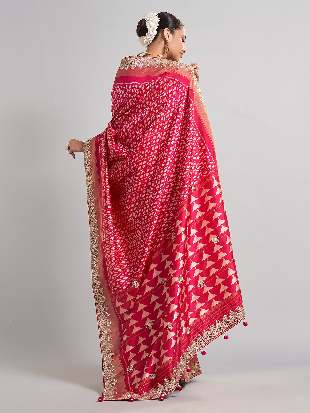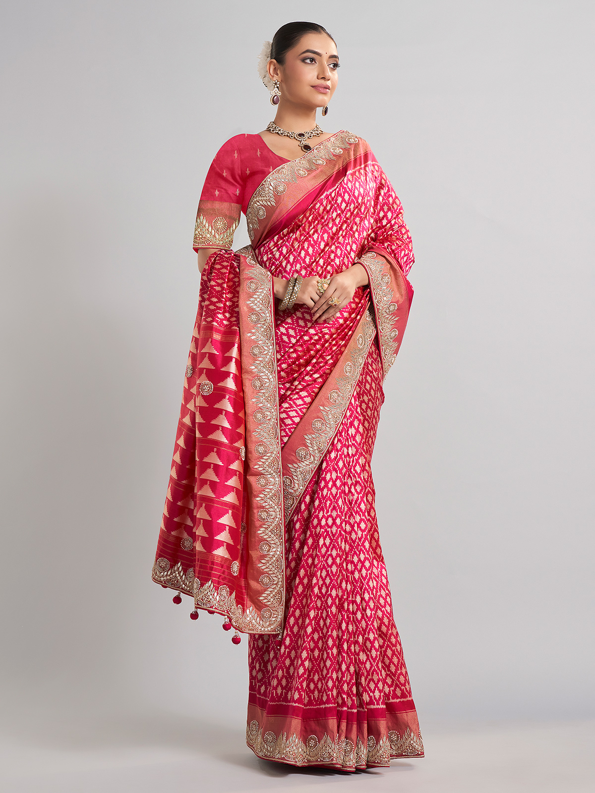 This vibrant magenta patola silk saree features cutdana, zardosi, thread, sequins, and gota work. A bold choice for weddings and festivities, it comes with an unstitched blouse piece for a tailored fit.