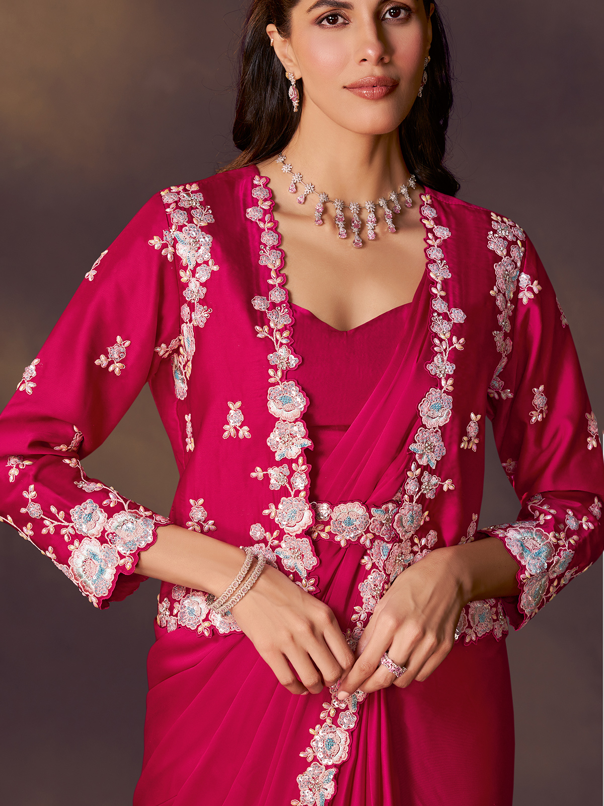 In magenta soft satin silk, this saree dazzles with embroidery, sequins, diamonds, and stone embellishments. The jacket-style drape and waist belt lend a stately finish, perfect for receptions and special occasions.