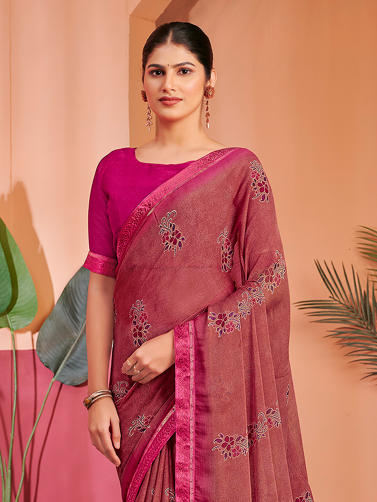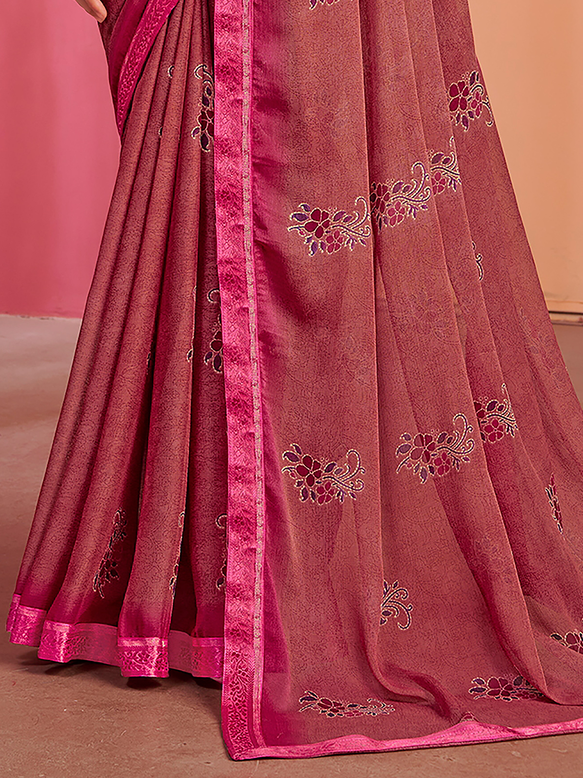 This striking magenta georgette saree features beautiful floral prints blended with a shaded finish for festive charm. Accented with delicate lace detailing, it offers a soft, flowy drape. Paired with an unstitched blouse piece, it is perfect for casual occasions, puja rituals and cheerful festive celebrations.