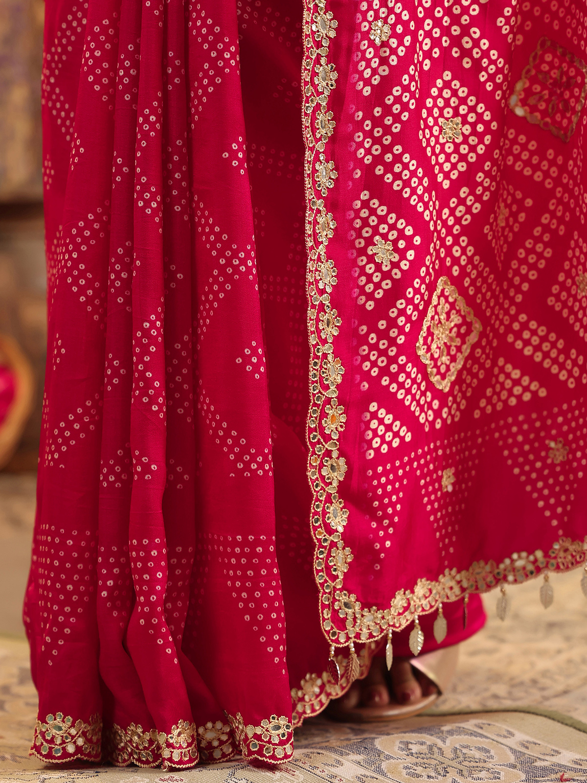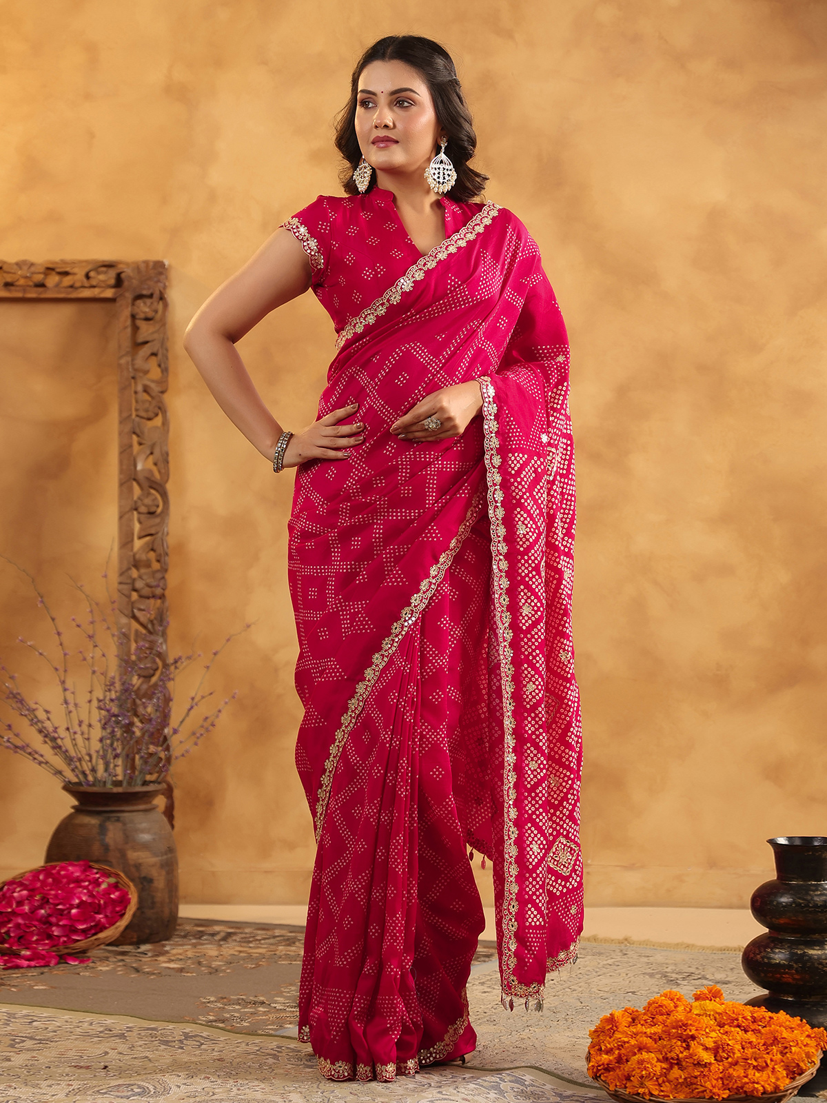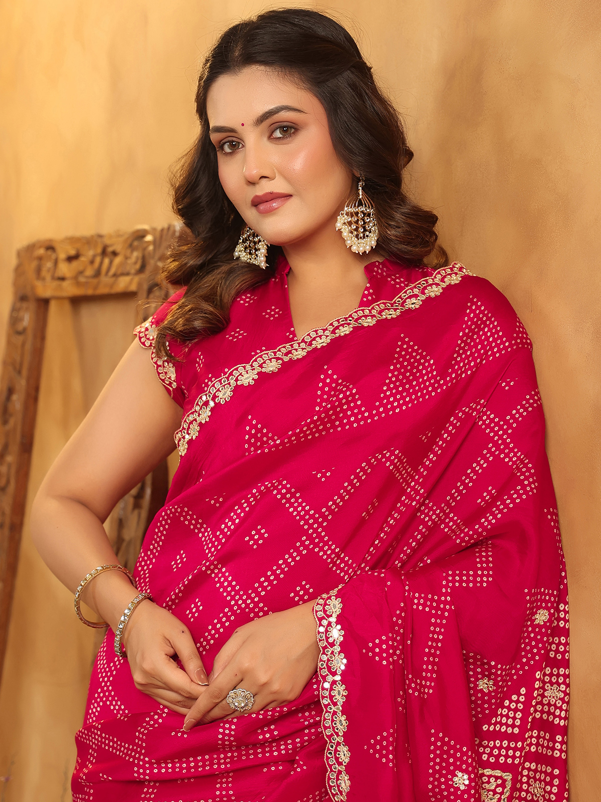 Vibrant richness defines the magenta silk printed saree, flowing elegantly. Aabla, resham, gota, beads, and sequins form artistic sparkling motifs. Includes an unstitched blouse piece for weddings and festive events.