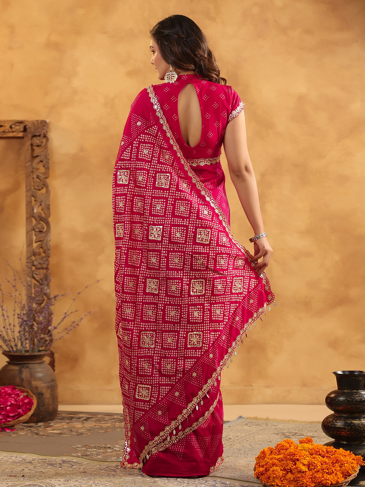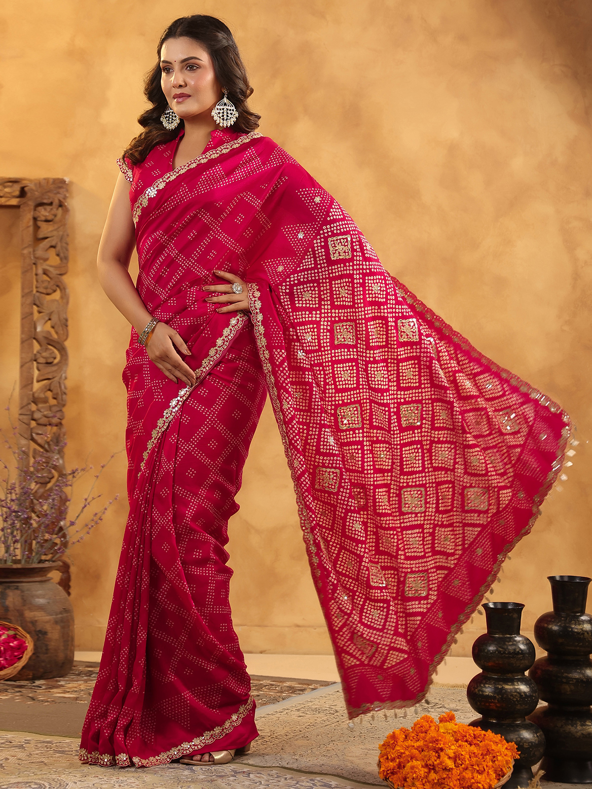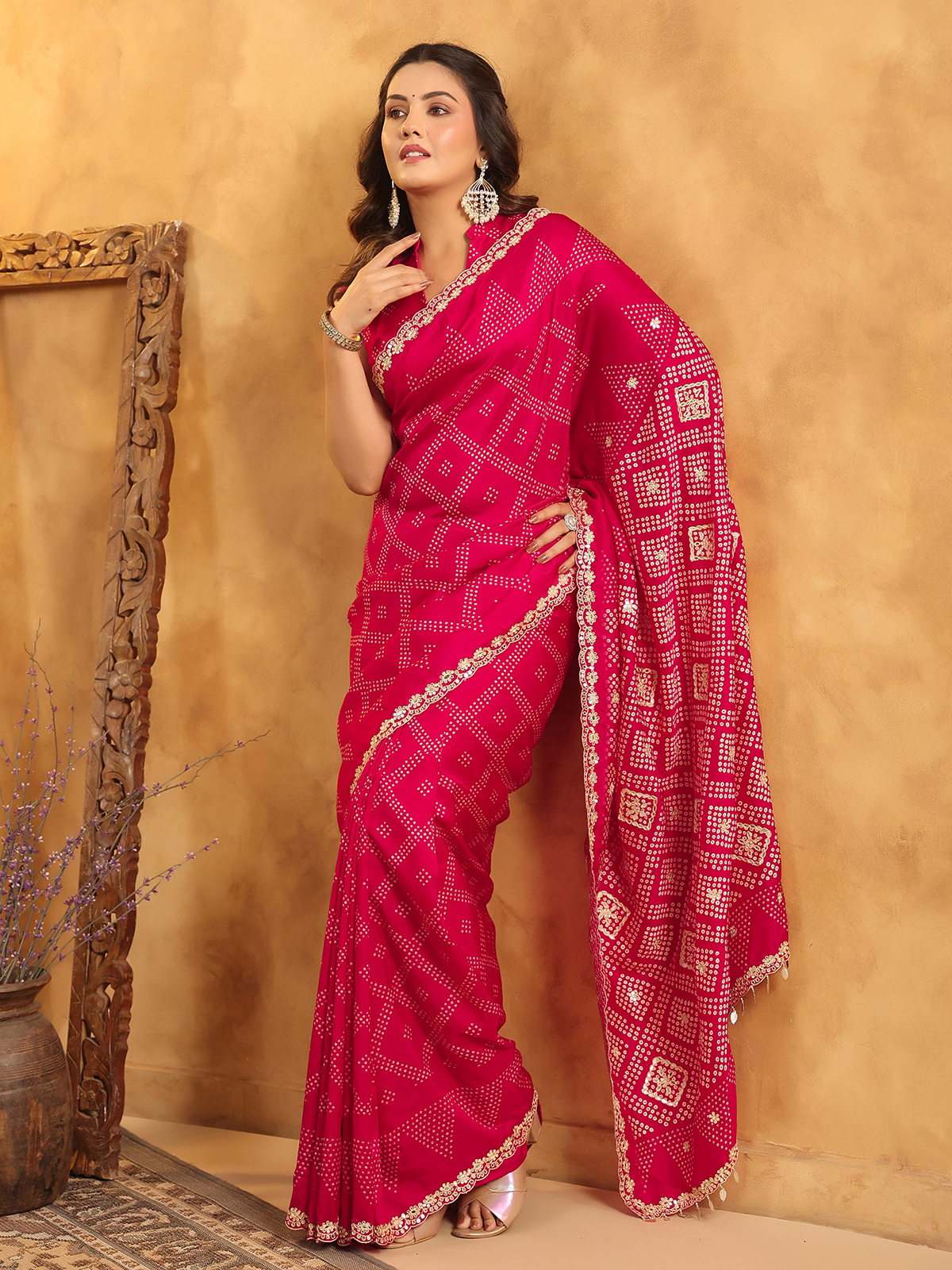 Vibrant richness defines the magenta silk printed saree, flowing elegantly. Aabla, resham, gota, beads, and sequins form artistic sparkling motifs. Includes an unstitched blouse piece for weddings and festive events.