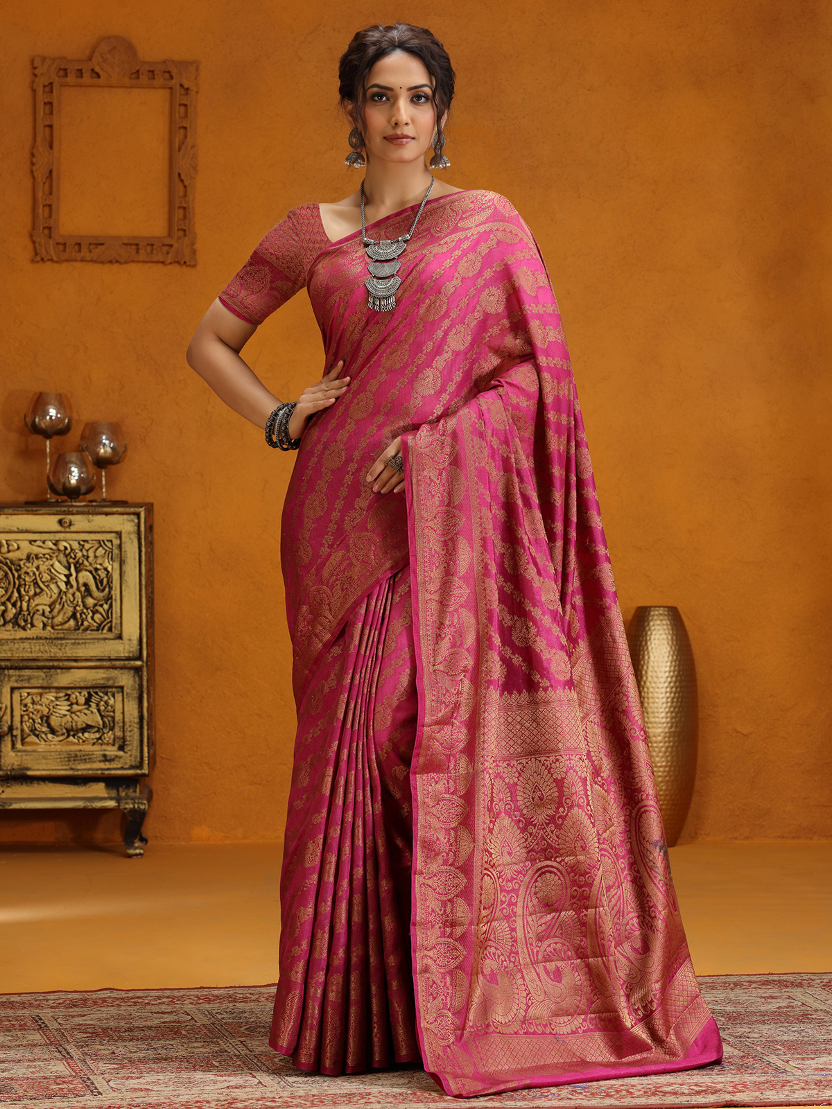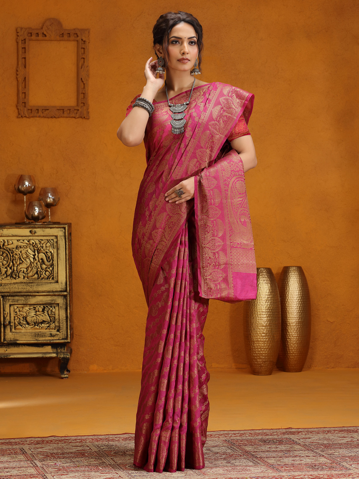 The luxurious texture and zari weaving of this magenta silk saree make it perfect for wedding functions. Includes an unstitched blouse.