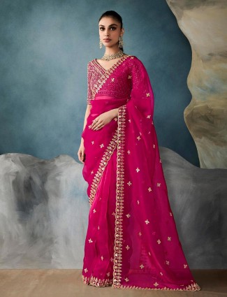 The magenta tissue silk saree features intricate resham, cutdana, and sequins embroidery, offering a refined look well-suited for wedding occasions. Includes an unstitched blouse piece for customization.