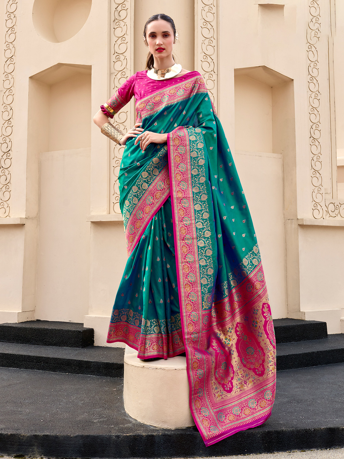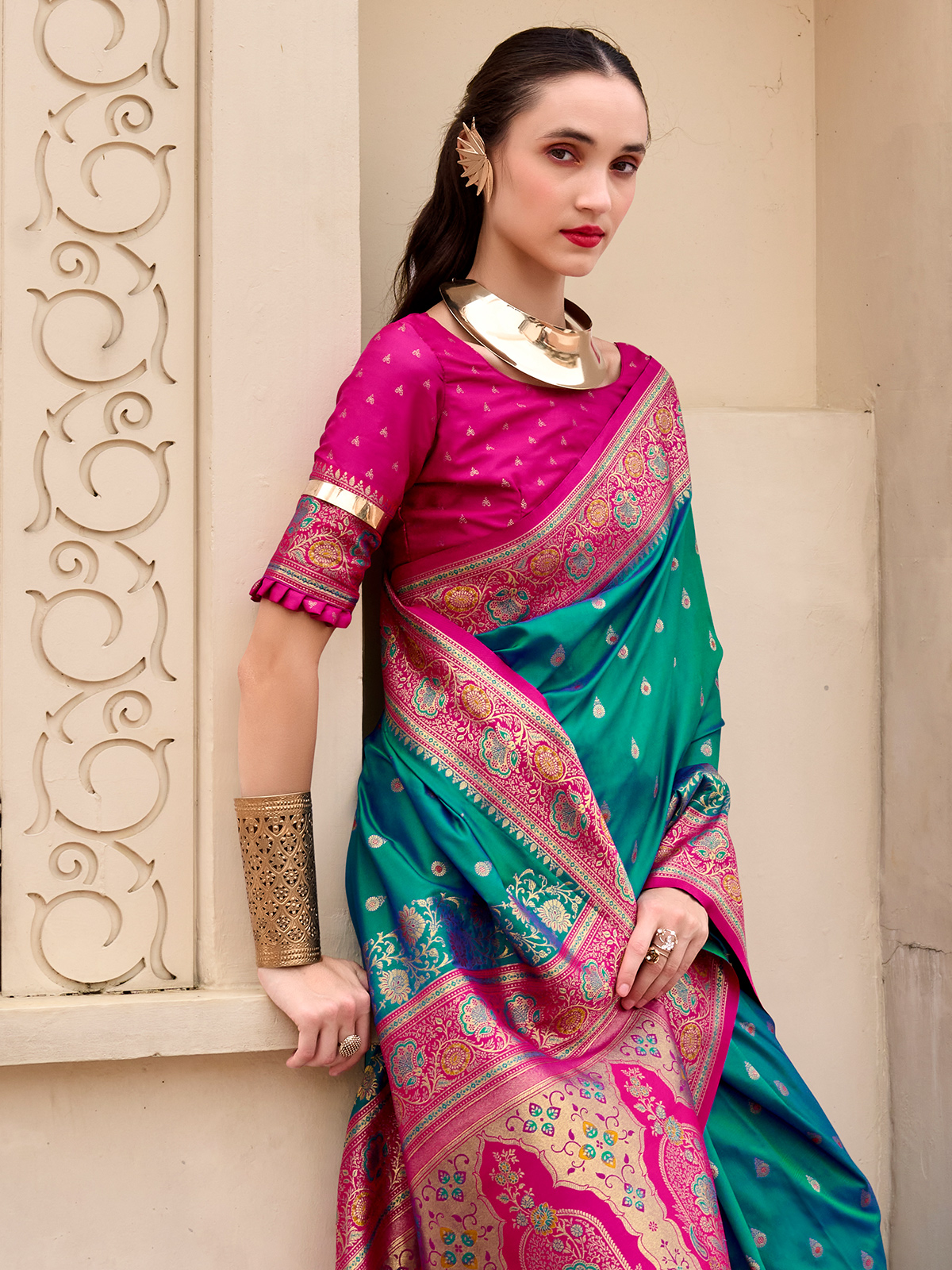 Deep peacock blue shades lend dramatic elegance to this women saree woven in pure soft banarasi silk. Shimmering gold and silver zari enhances the intricate motifs, creating a statement festive look. Completed with an unstitched blouse, it is ideal for weddings, sangeet functions, and grand celebrations.