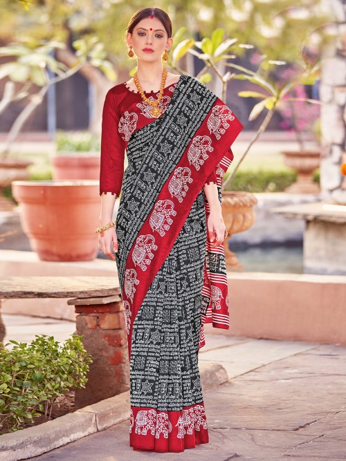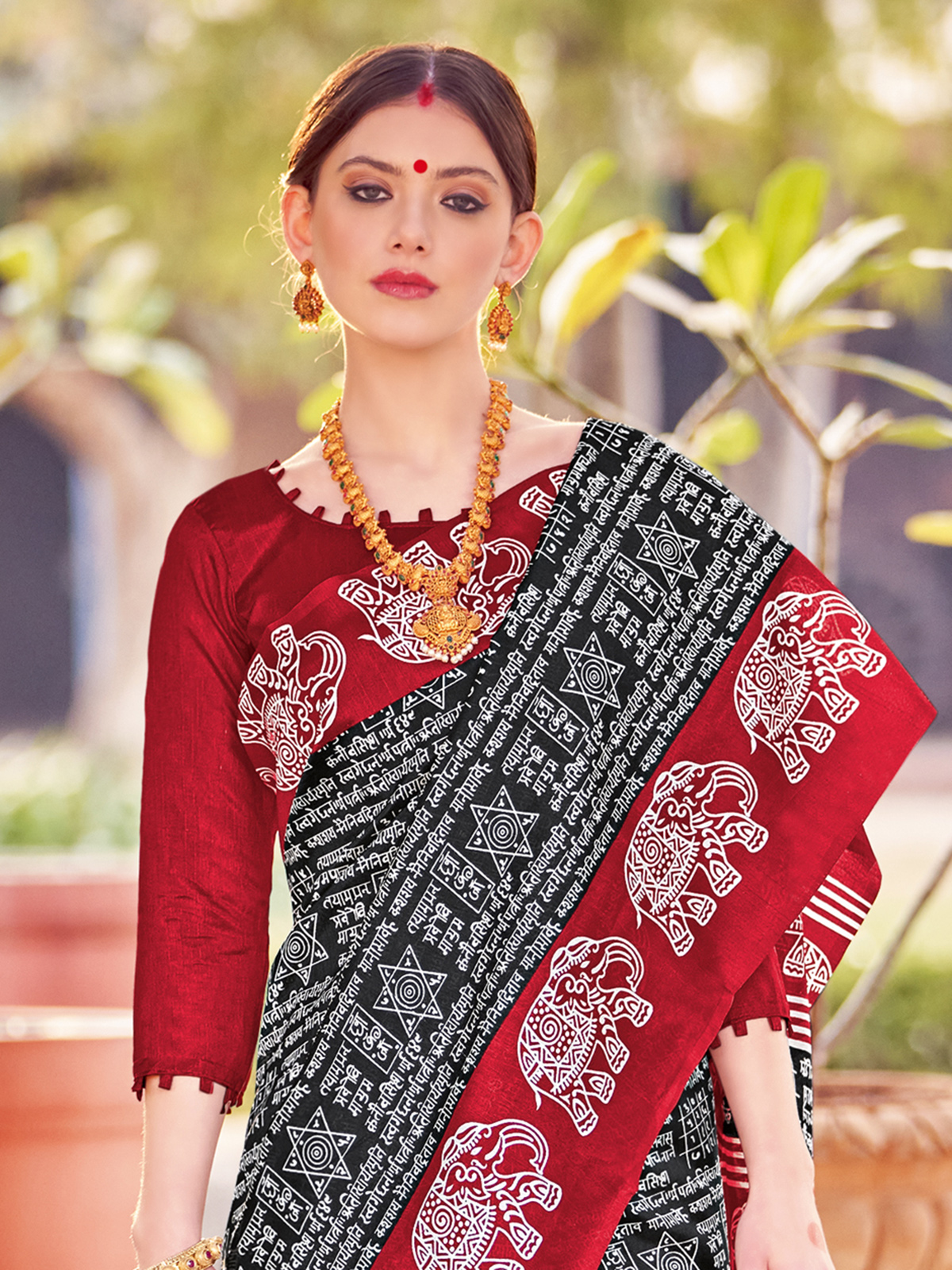 Enhance your saree collection with this striking black and maroon bhagalpuri silk saree. The eye-catching script print creates a perfect blend of modern style and classic charm, and the unstitched blouse piece completes the look.