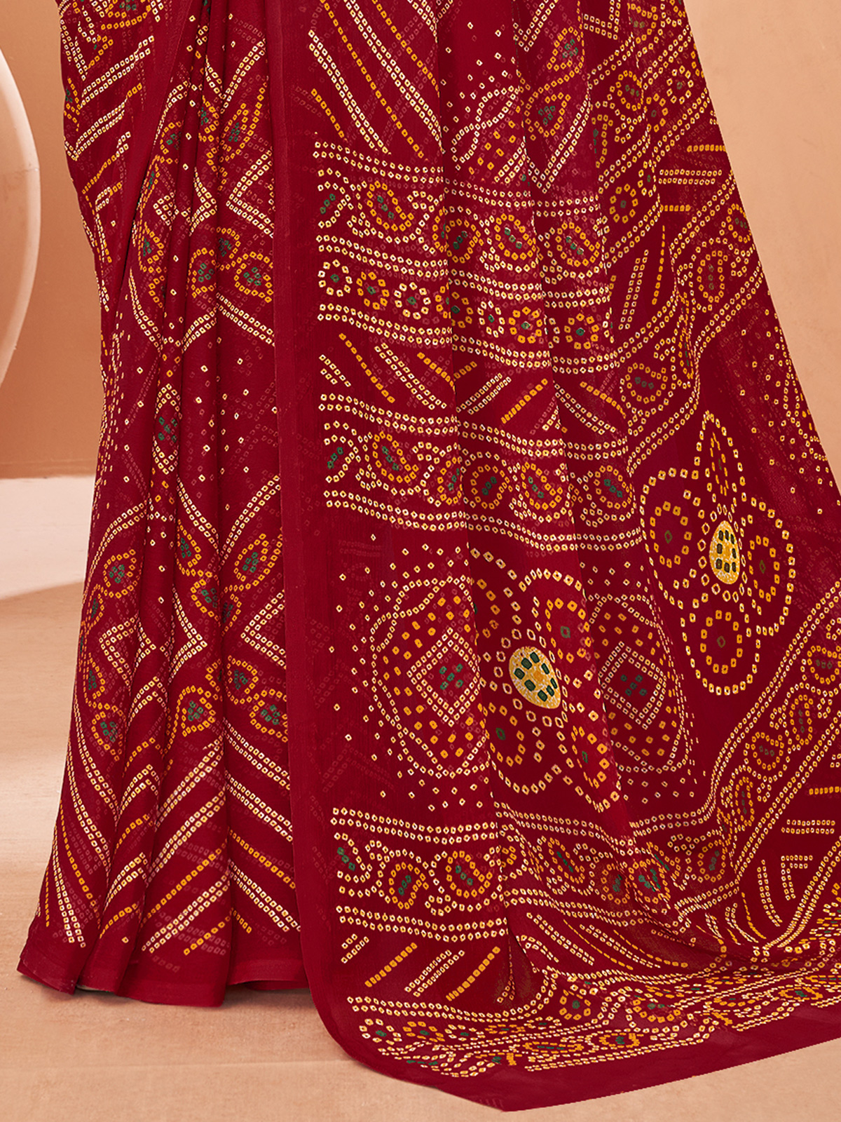 This maroon chiffon saree features intricate bandhani prints that radiate traditional elegance. Its lightweight, airy fabric drapes smoothly for effortless comfort and graceful movement. Paired with an unstitched matching blouse piece, it is perfect for festive celebrations, puja rituals, and casual ethnic gatherings, offering a timeless and vibrant look.
