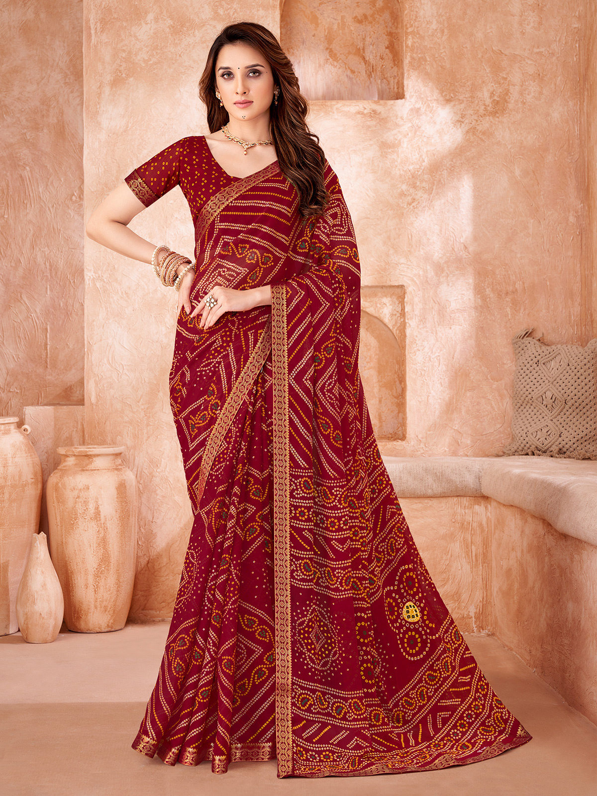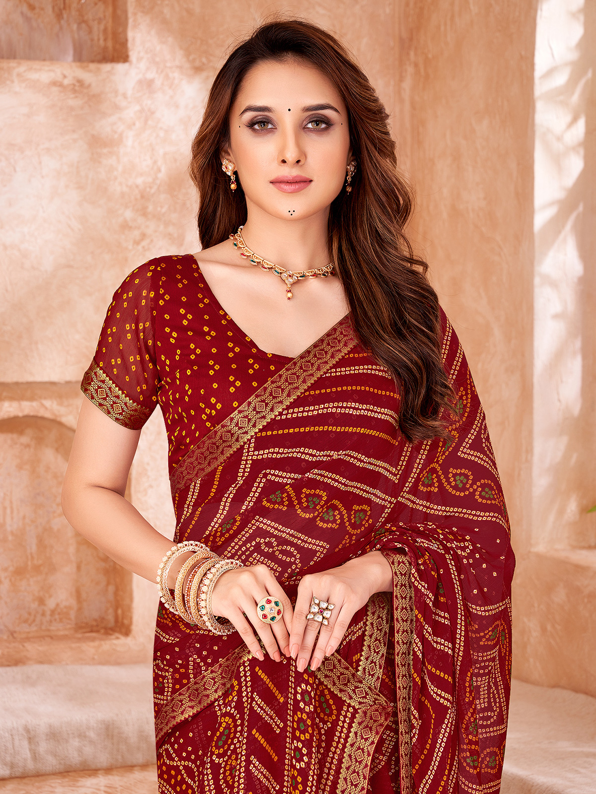 Infuse your festivities with vibrant charm in this maroon chiffon saree, adorned with eye catching bandhani print. The rich color and luxe detailing make it a perfect pick for celebratory occasions. Comes with an unstitched blouse piece.
