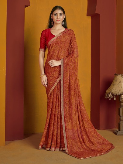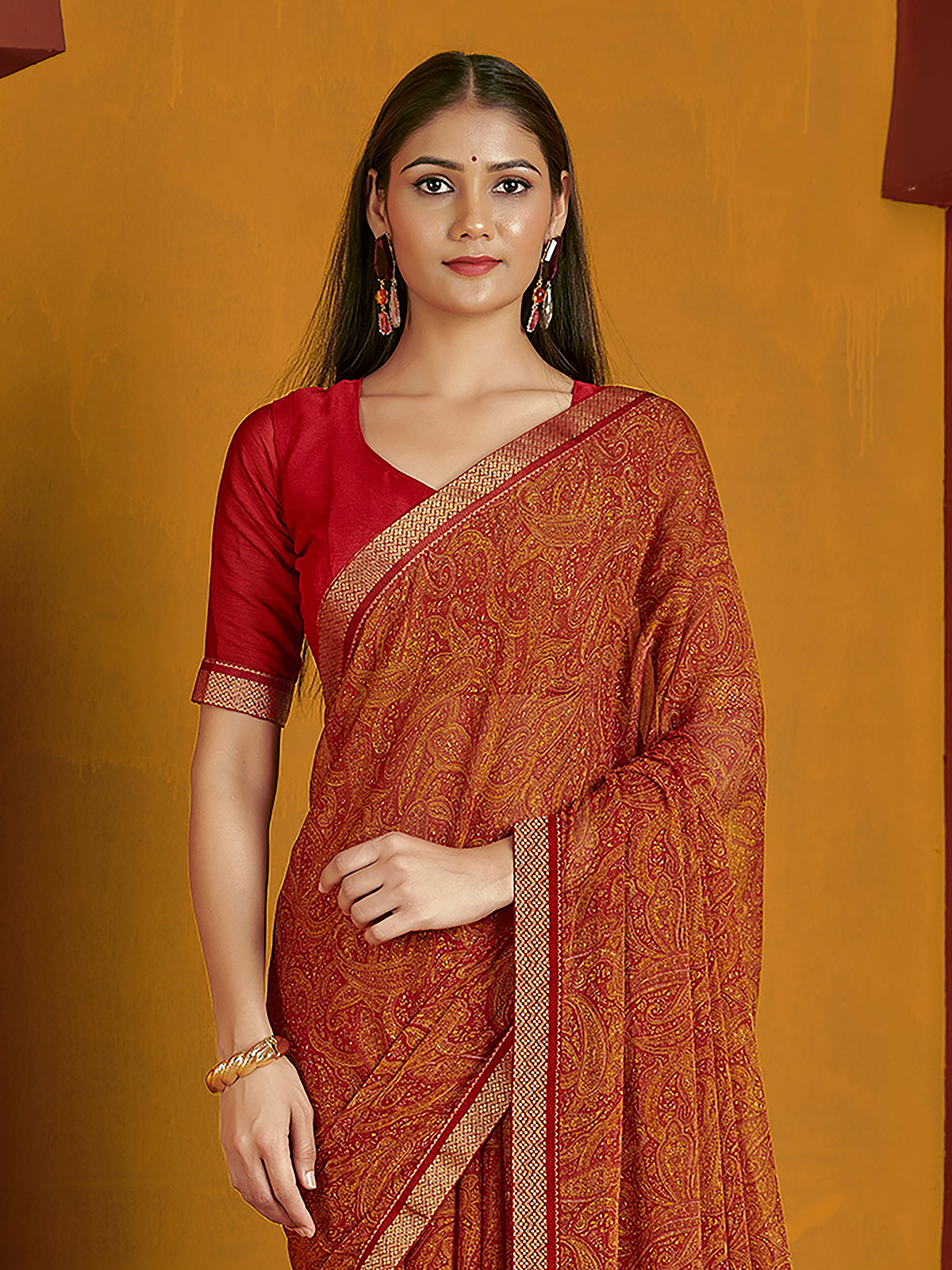 Designed in flowing chiffon, this maroon saree features attractive printed patterns enhanced with delicate lace detailing and zari border work. Its rich tone and soft texture create timeless elegance. Paired with an unstitched blouse piece, it is ideal for festive celebrations, puja ceremonies and refined casual occasions.