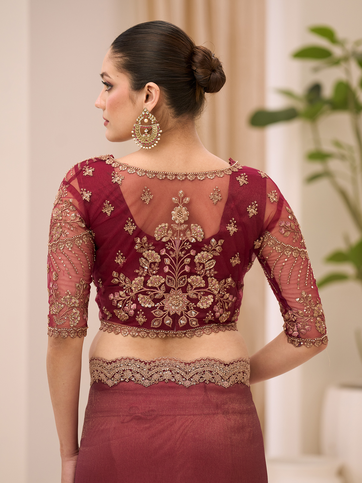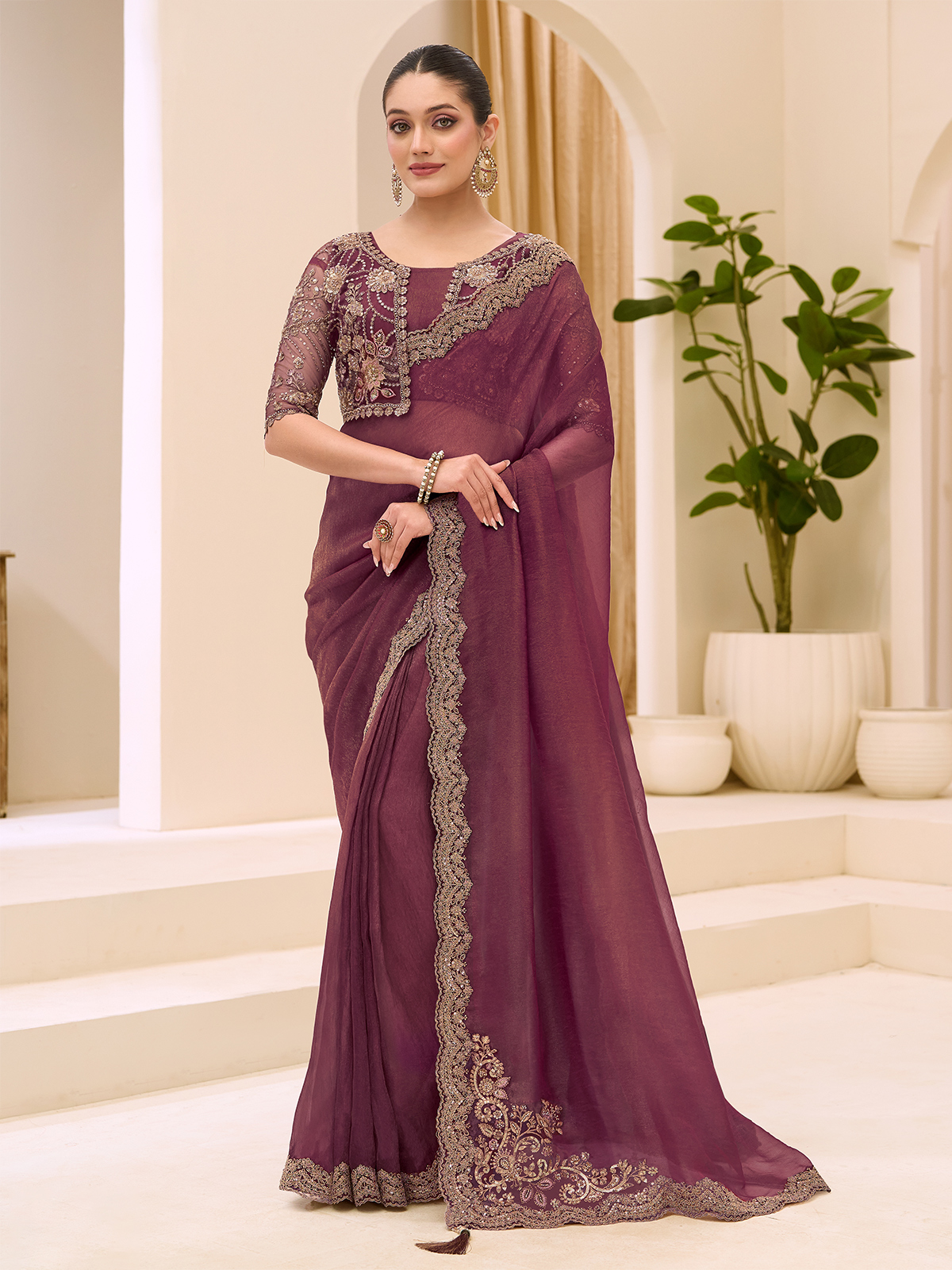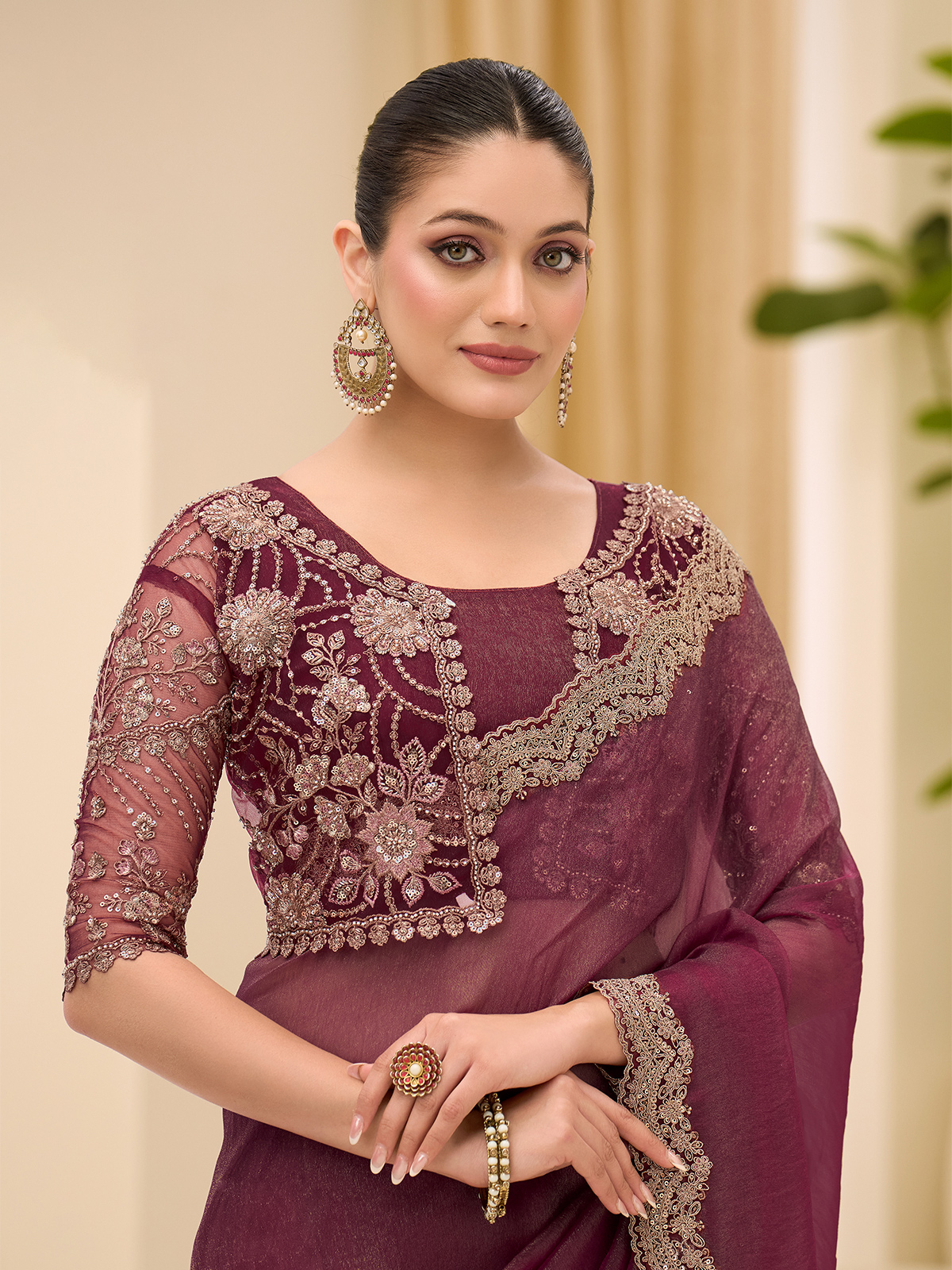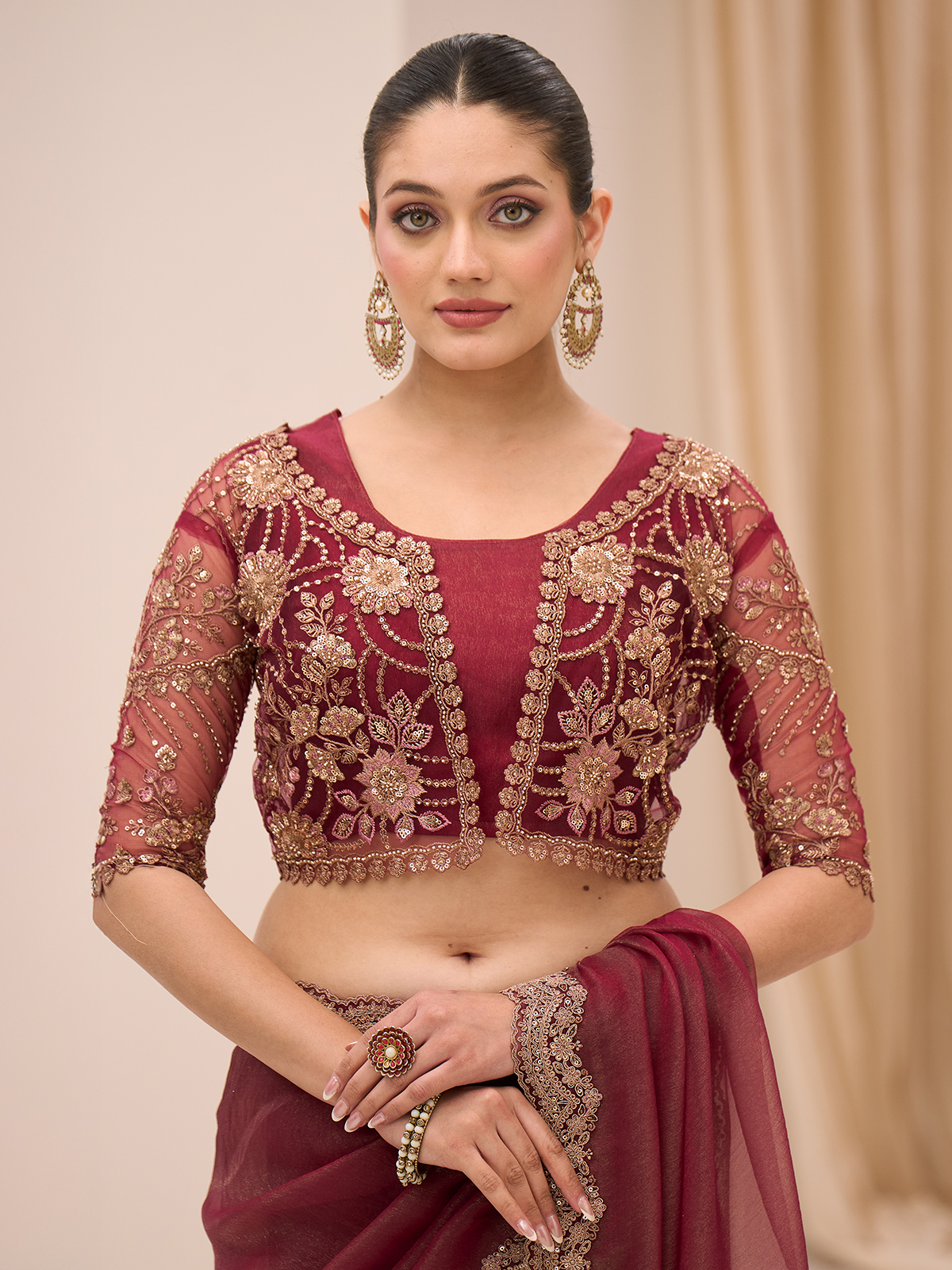 Bold elegance defines this maroon georgette tissue saree crafted for a striking festive appeal with a rich and graceful fall. Embellished with resham, cutdana and sequins work on the border, it adds luxurious shimmer and texture. A stunning choice for festive and party wear occasions, paired with an unstitched blouse piece.