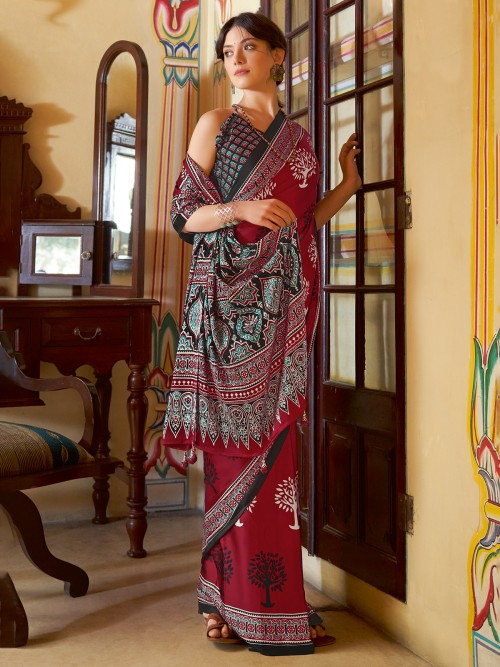 Celebrate tradition with a touch of elegance in this maroon Japan satin saree, highlighted by a rich Ajrakh print. Ideal for festive occasions and family gatherings, it comes with a matching unstitched blouse piece for a complete look.