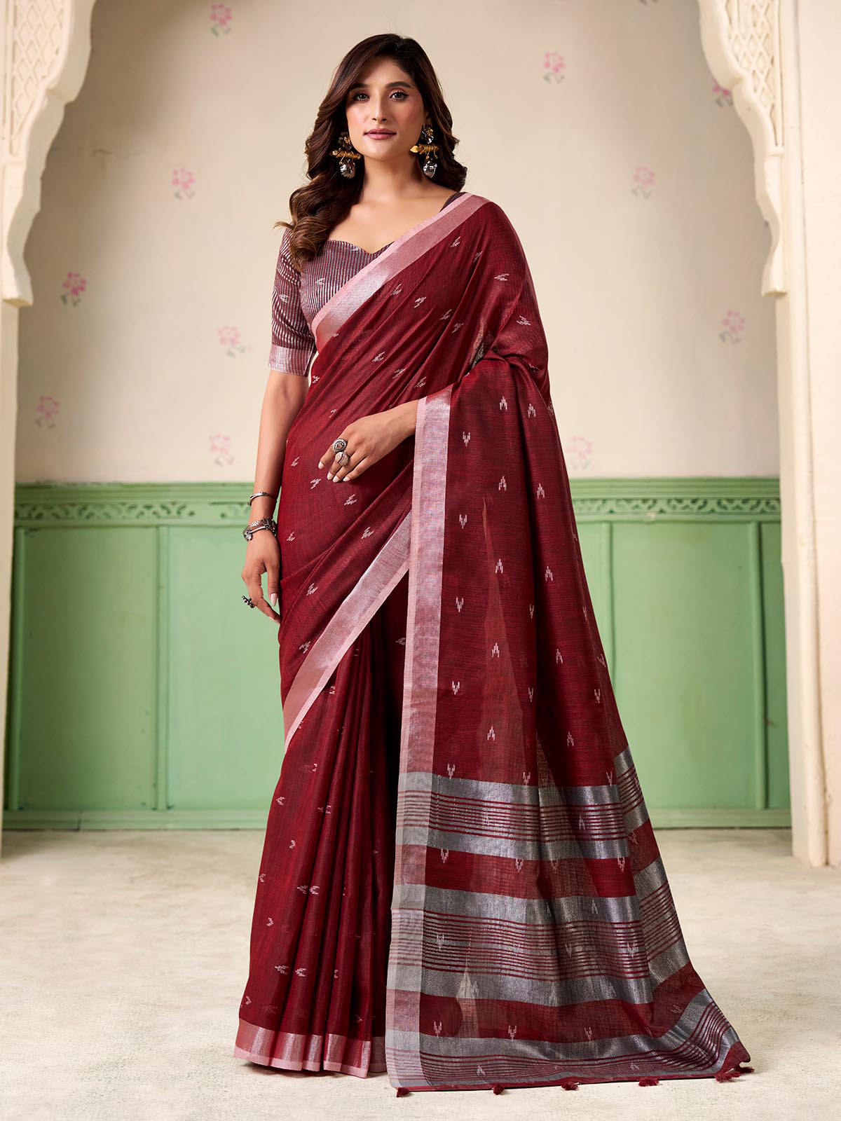 This maroon linen silk unstitched blouse features delicate zari detailing paired with soft tassel accents. Ideal for partywear, puja moments, and special occasions, its rich texture adds festive refinement. Easy to stitch, it blends beautifully with both classic and modern sarees.