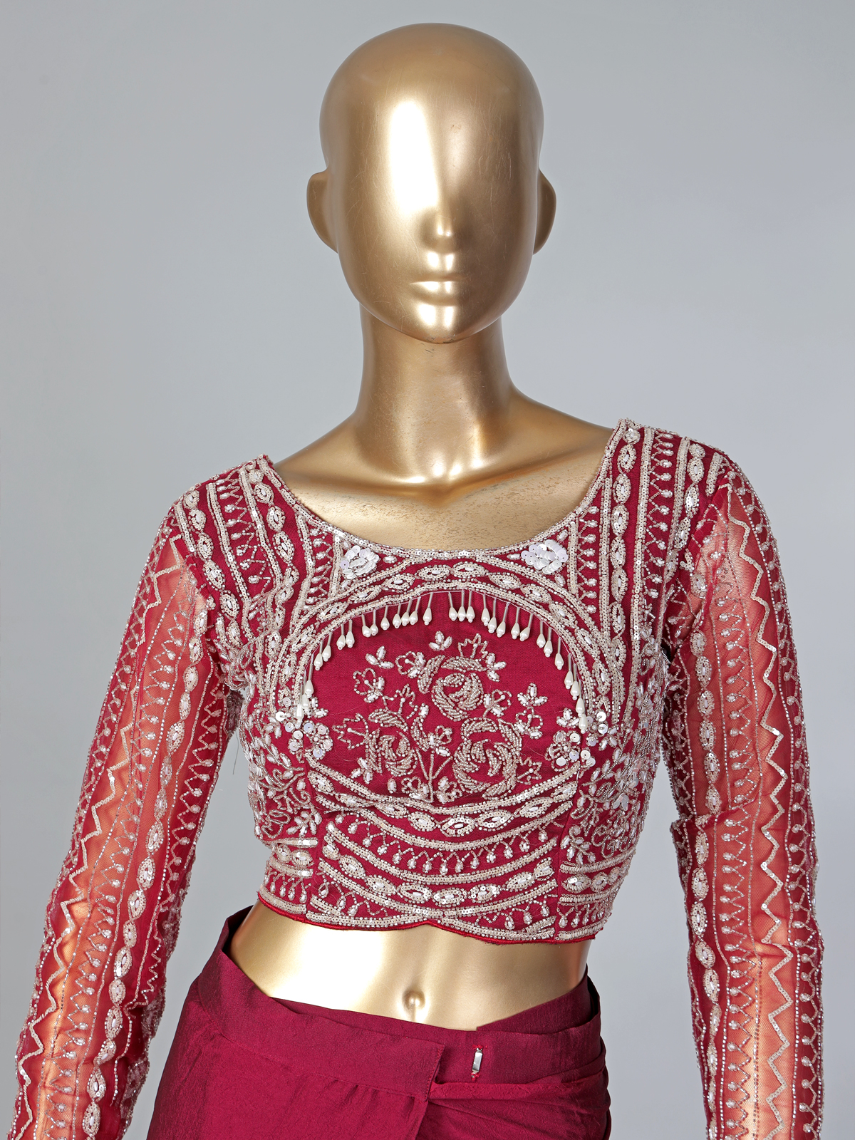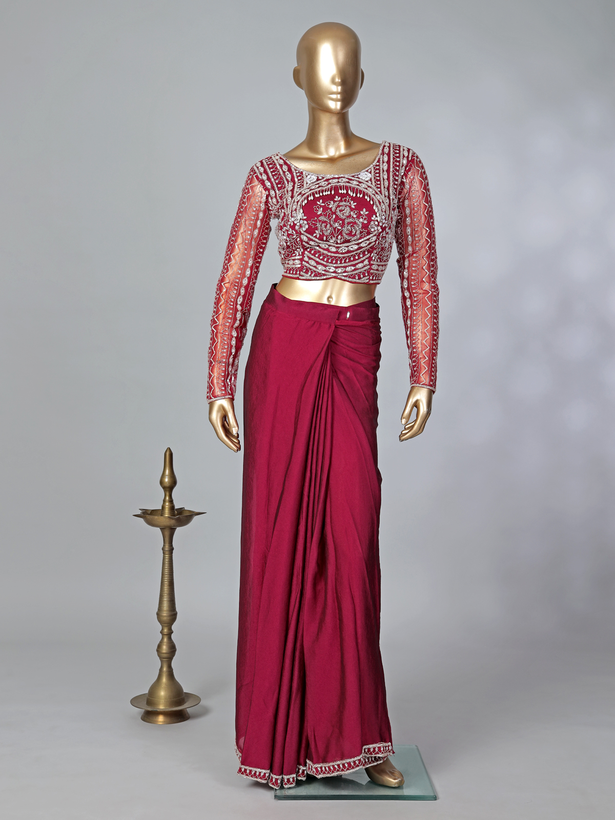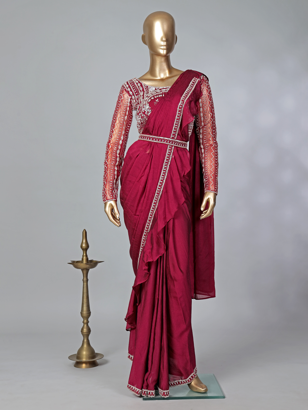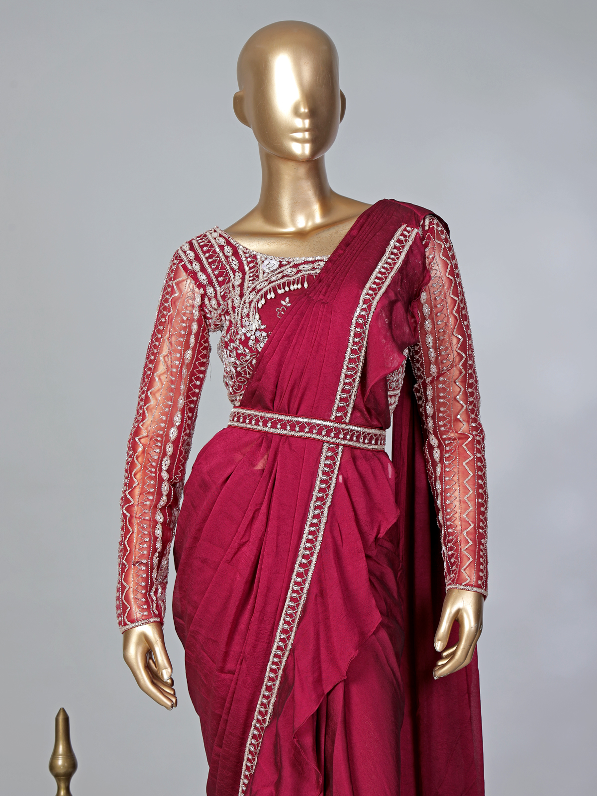 Designed to celebrate majestic feminine beauty, this luxurious maroon lycra ready-to-wear saree radiates elegance and sophistication. The boatneck full-sleeve blouse embellished with cutdana, sequins, and pearls creates a refined festive shimmer. The belt and ruffled pallu add a contemporary touch, making it a perfect ensemble for weddings, receptions, and grand celebrations.