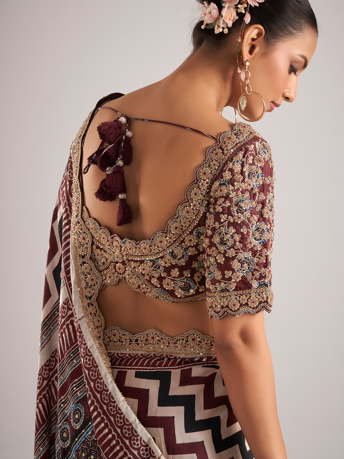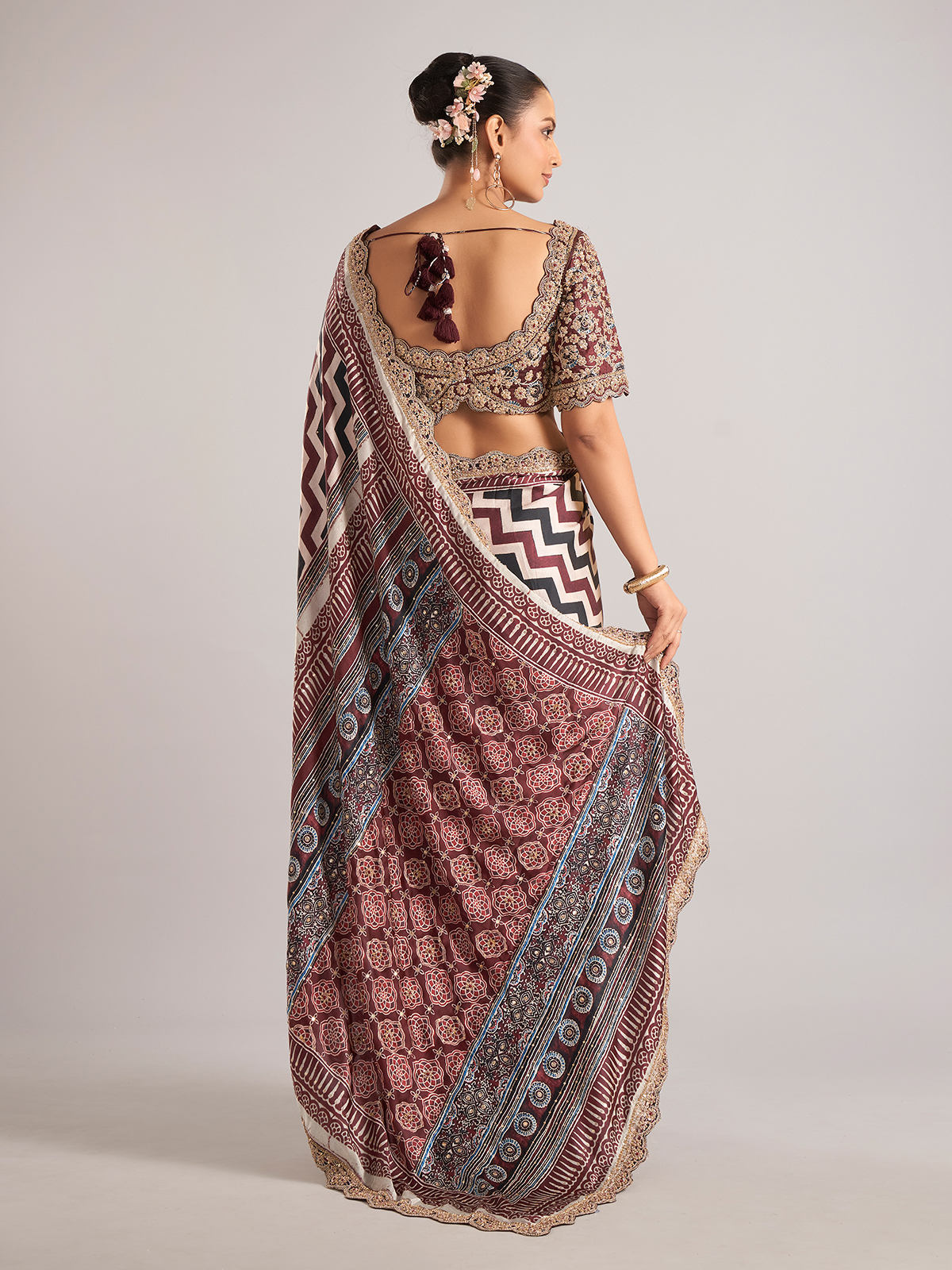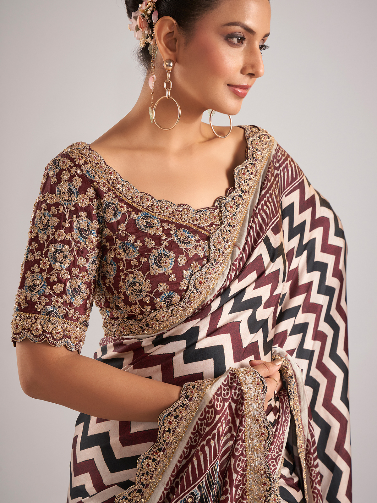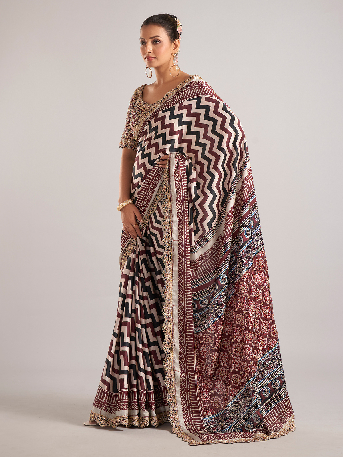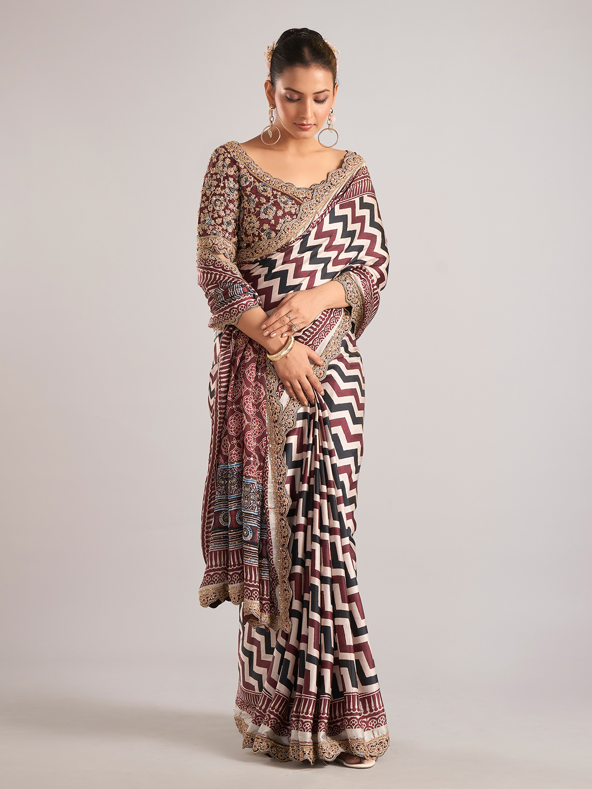 Unique and festive, this maroon pure modal silk saree showcases zigzag prints with rich resham, thread, sequin, and zardosi work. Comes with a ready-made blouse for elegant occasions.