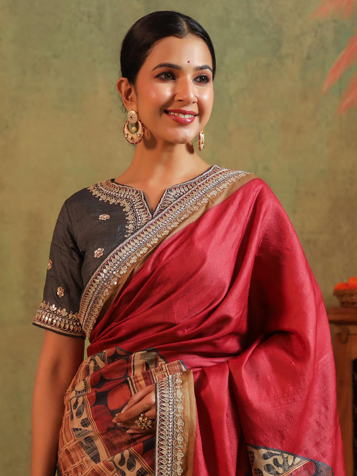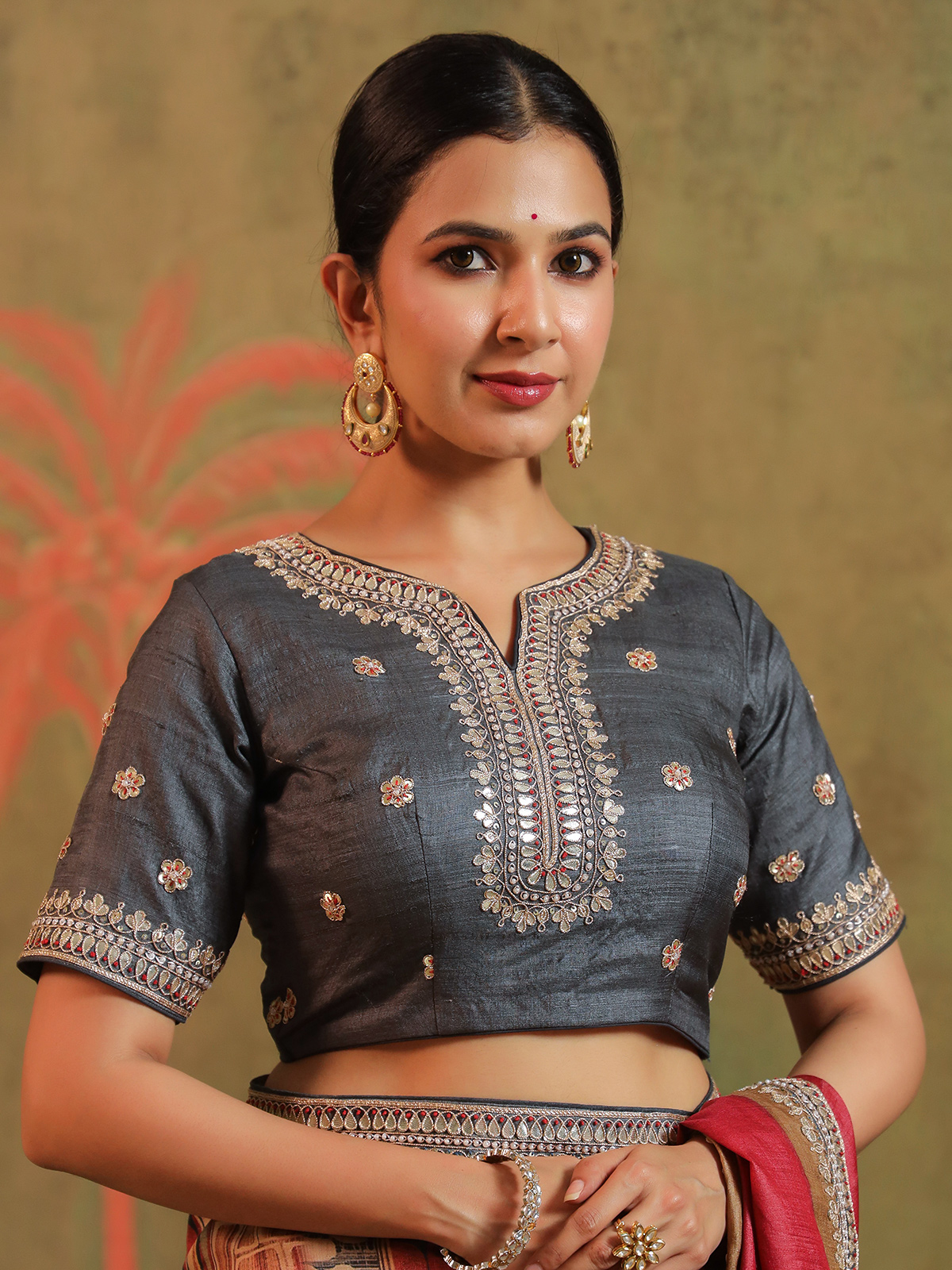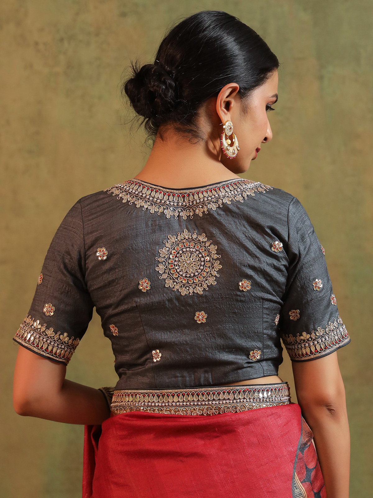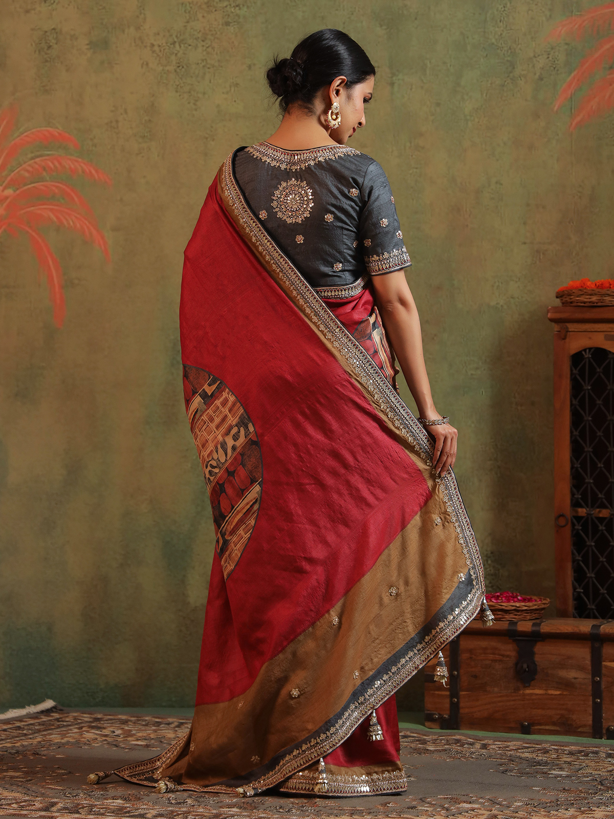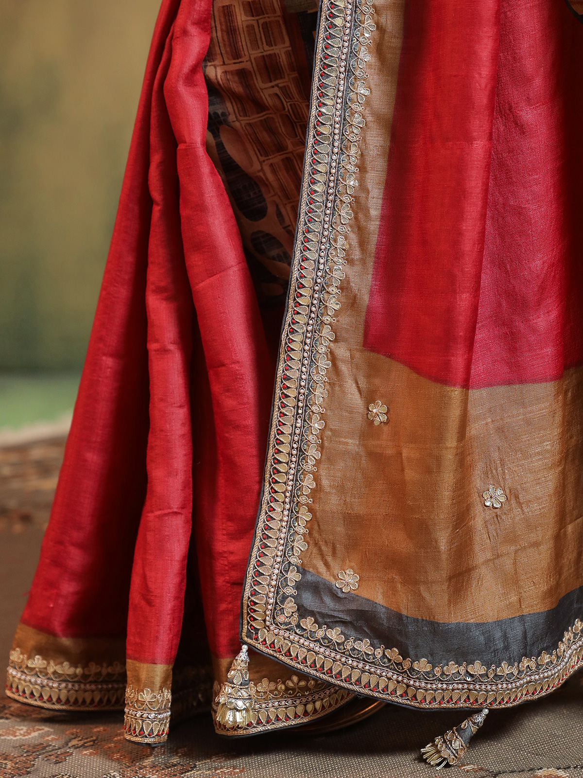 In deep maroon silk, intricate handwork of sequins, beads, cutdana, zardosi, and gota blooms like vintage poetry. Each detail hums with royal warmth and festive joy. Accompanied by an unstitched blouse piece, this saree is crafted for celebrations where traditions linger in every fold and memories shimmer long after the moment has passed.