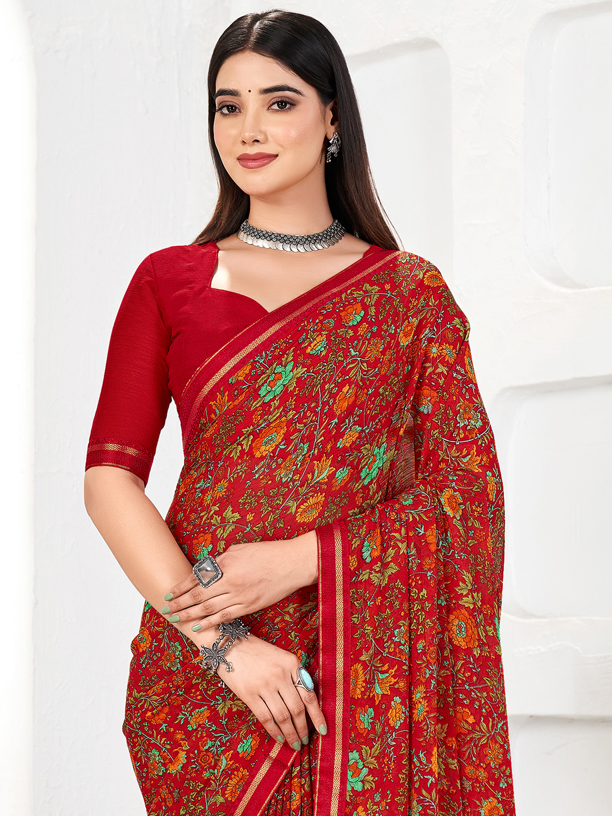 This elegant maroon georgette saree features delicate zari work paired with traditional printed motifs. Lightweight and flowy, it offers a graceful drape and comfortable wear. Comes with an unstitched blouse, making it suitable for festive and casual occasions.