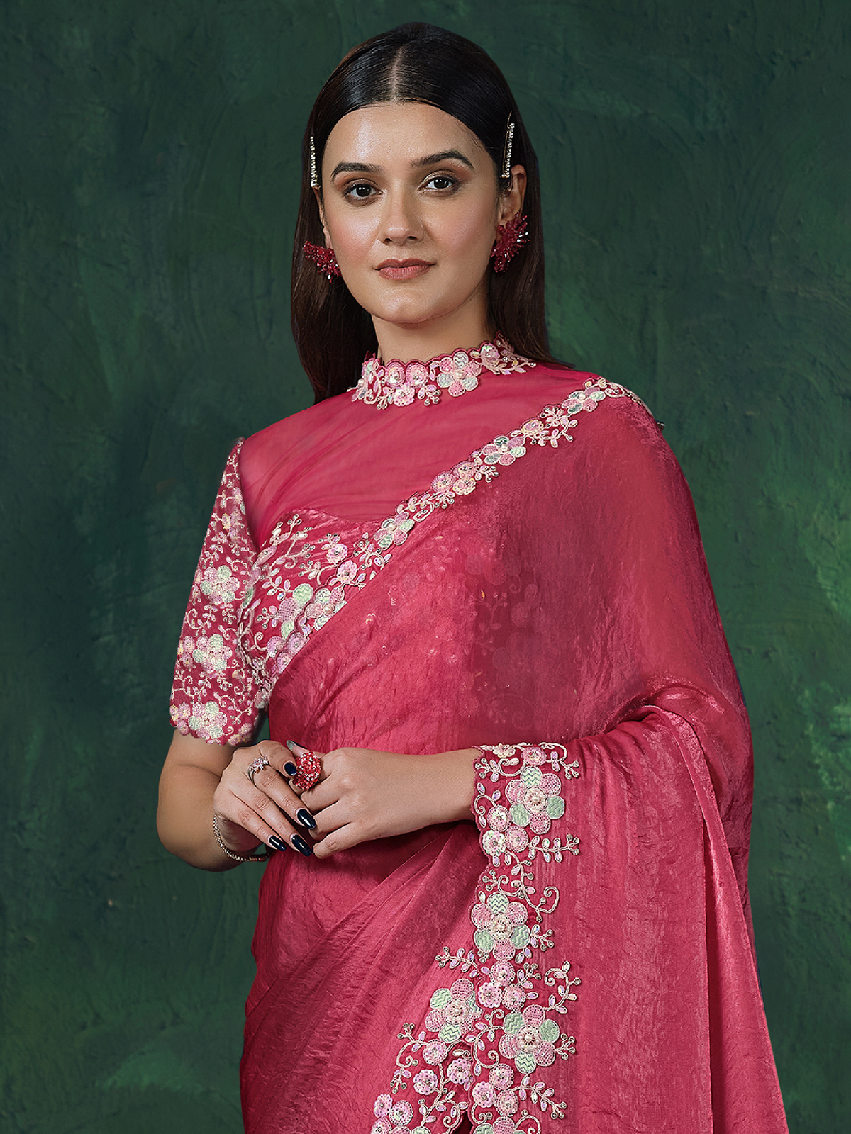 This maroon satin silk saree is enhanced with embroidery, sequins, pearls and diamond detailing for luxurious festive charm. The rich fabric adds a regal fall. Paired with an unstitched blouse piece, it is an excellent choice for weddings, receptions, sangeet and grand celebrations.