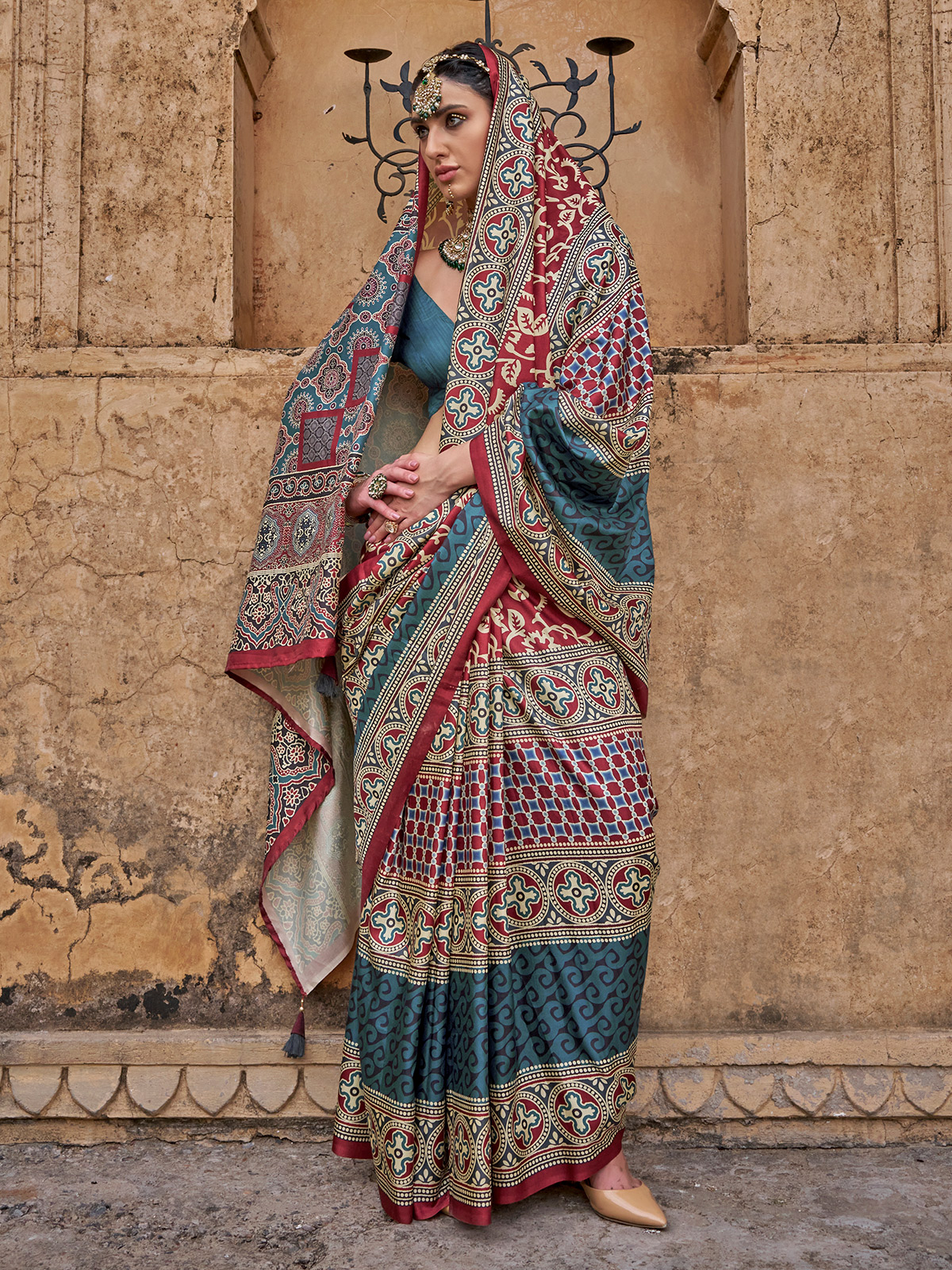 Stand out in this maroon silk saree with eye-catching digital prints and a rich finish. Perfect for weddings, receptions or festive events. Includes an unstitched blouse to create your perfect fit.