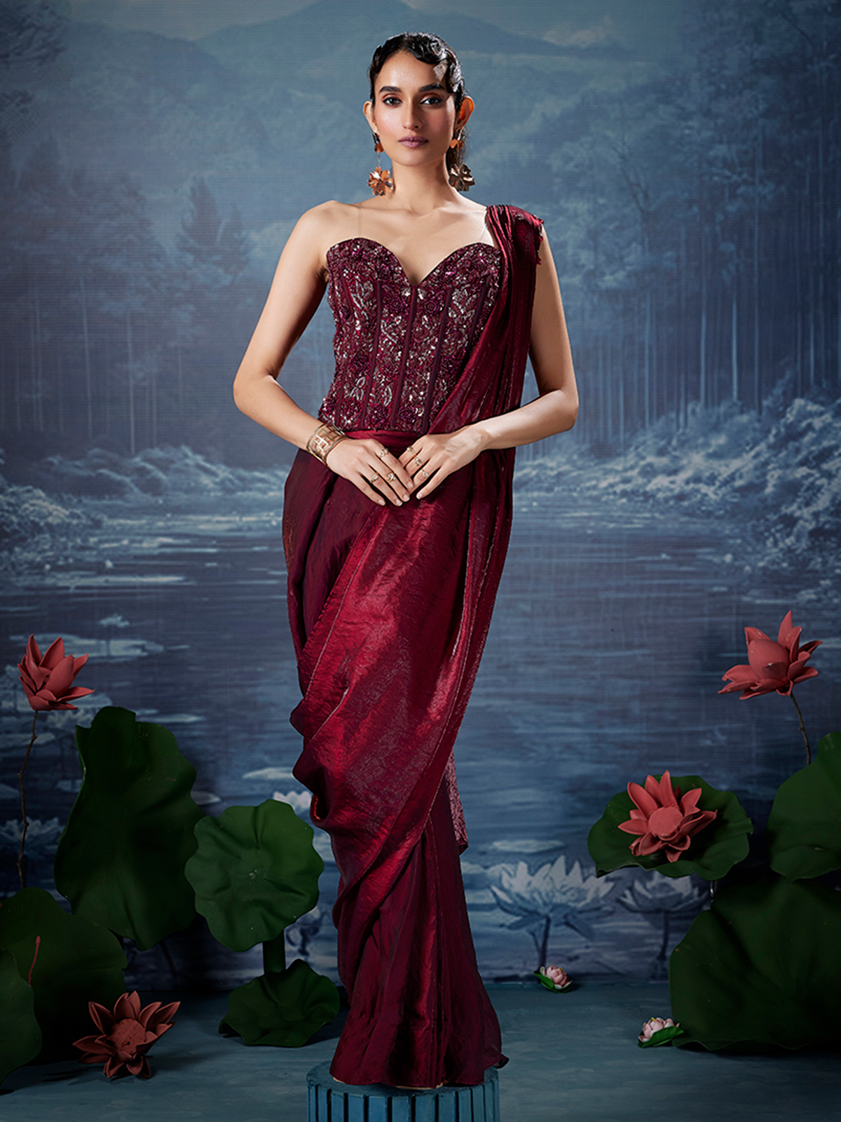 Look regal in maroon silk ready to wear saree, its deep richness flowing with tradition and elegance. Cutdana, sequins, and beads flicker like firelit sparks, adding festive brilliance. With a readymade blouse, this saree is perfect for celebratory evenings and lively party occasions.