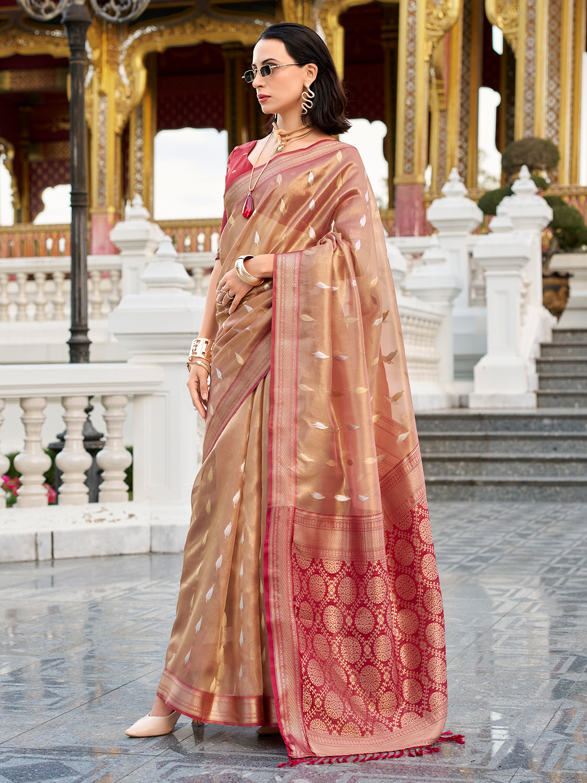 Crafted for meaningful occasions, this maroon tissue silk saree exudes refined elegance with its soft texture and shimmering golden zari work. A perfect blend of tradition and grace, it comes with an unstitched blouse piece for a tailored look.