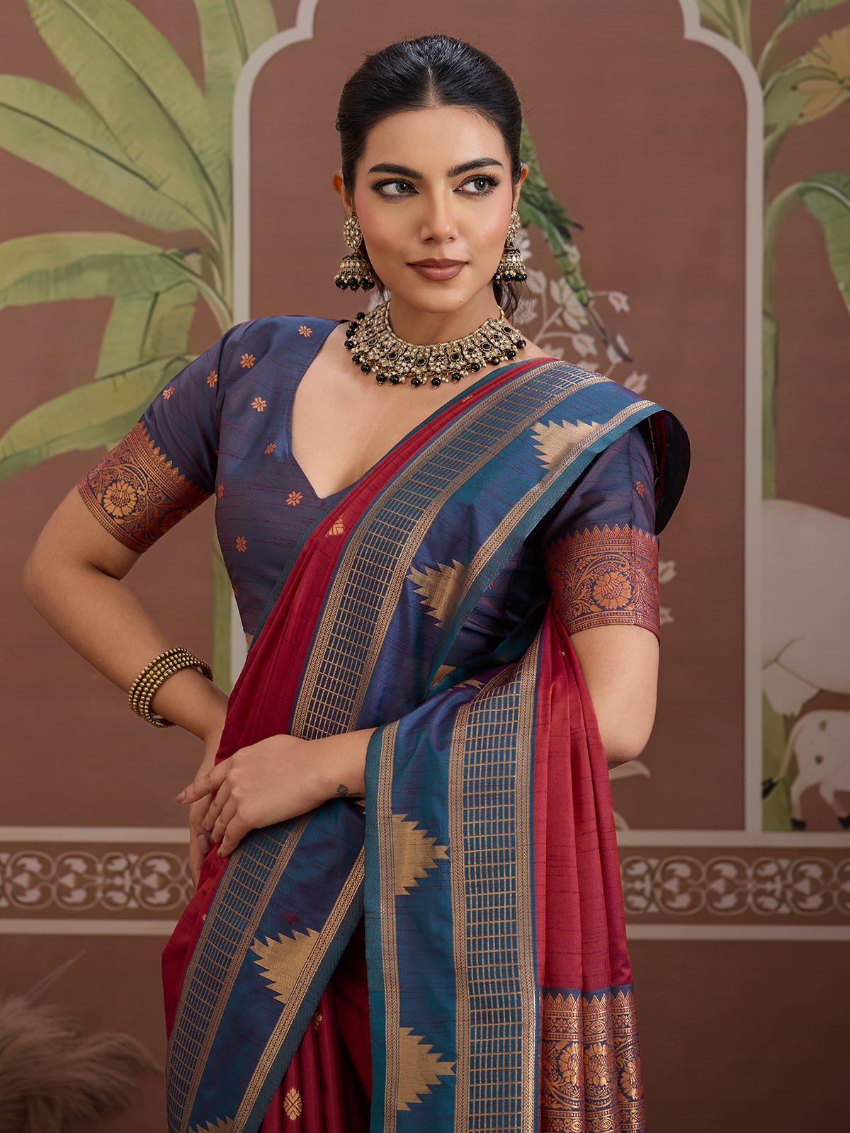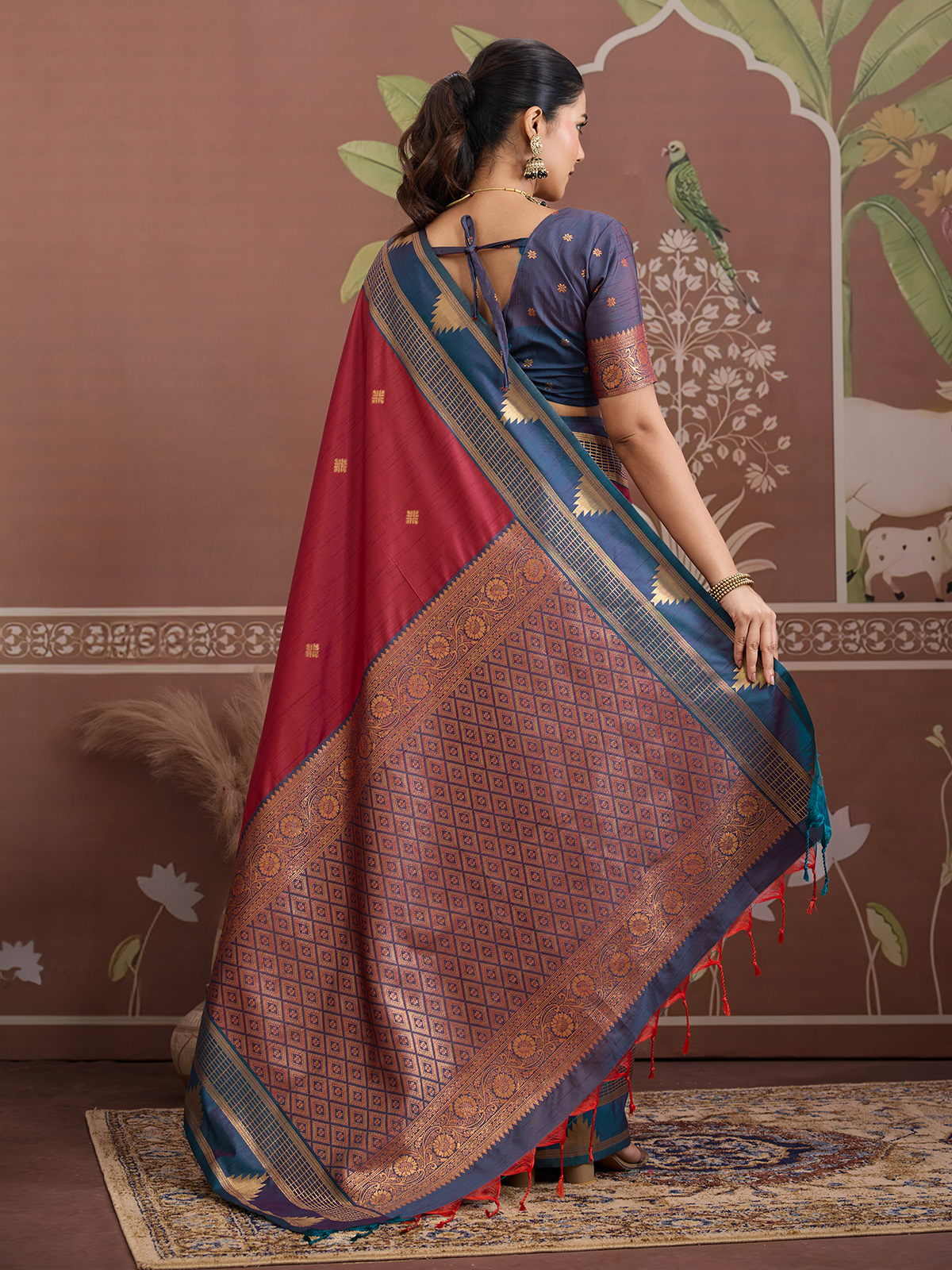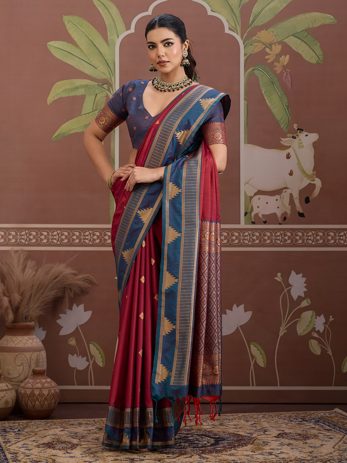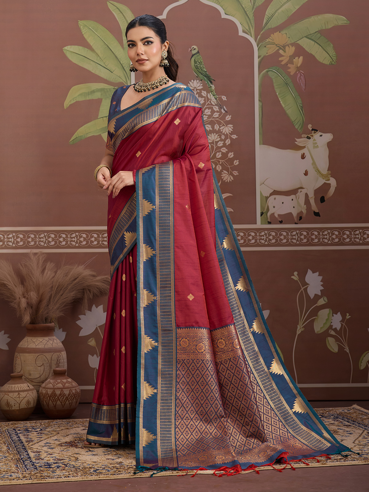 Crafted in deep maroon tussar silk, this saree is highlighted with classic handloom zari weaving for a regal finish. Teamed with an unstitched blouse piece, it delivers timeless ethnic appeal suitable for festive wear and traditional functions.