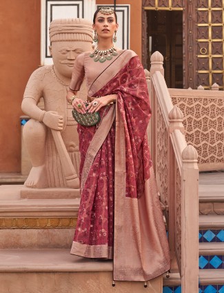 Grace meets grandeur in this maroon organza saree featuring fine zari weaving and vivid digital prints. Its sheer texture and rich tone make it a standout for celebrations. Comes with an unstitched blouse for a tailored finish.