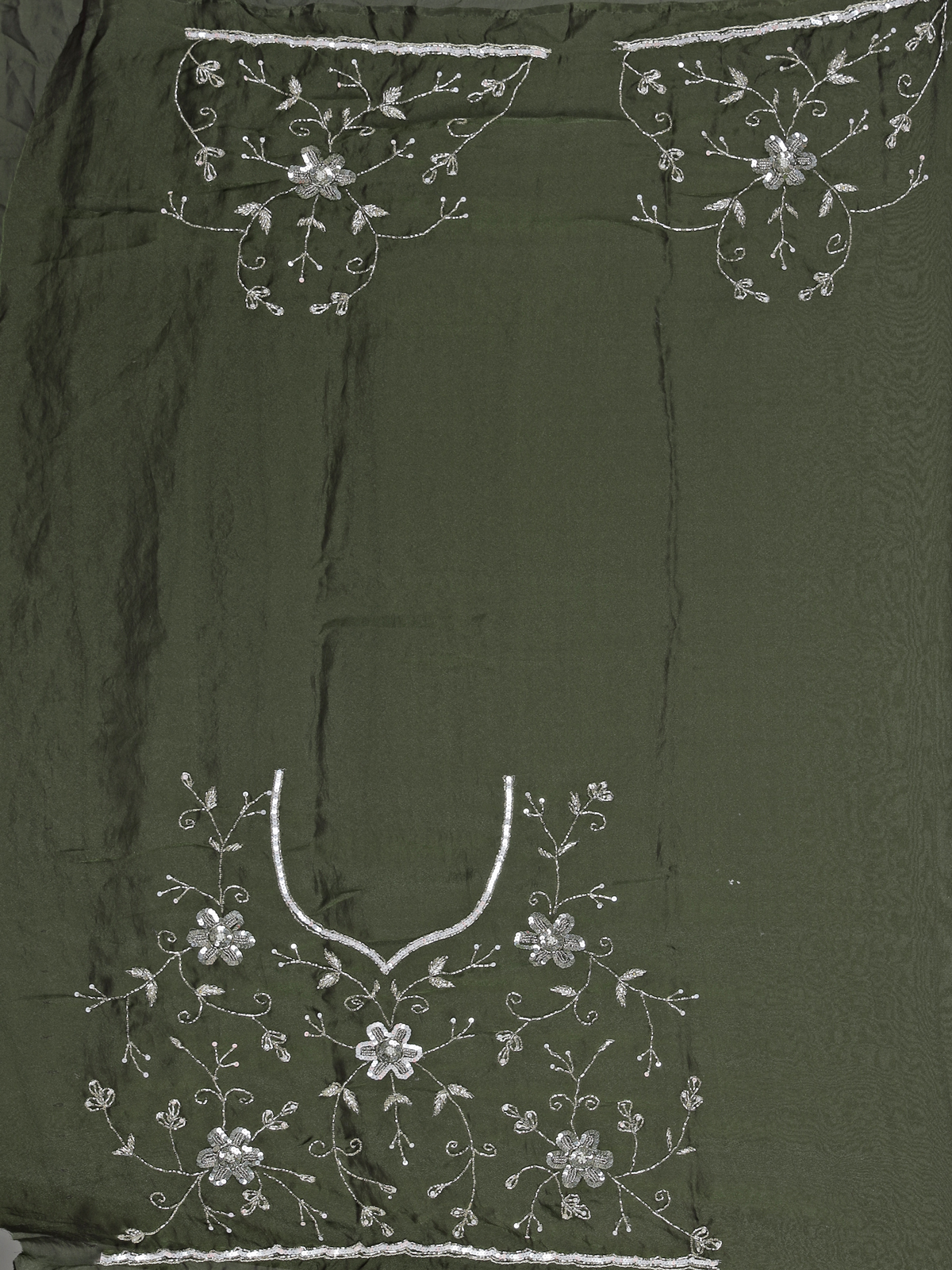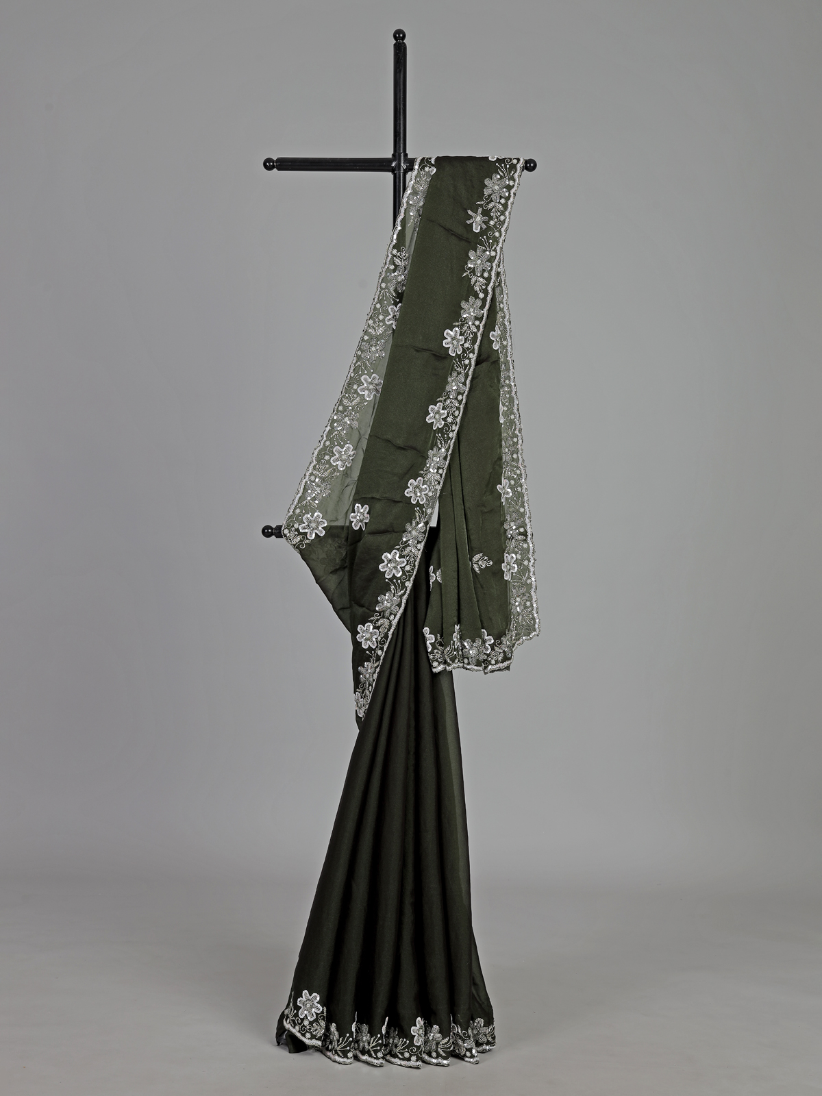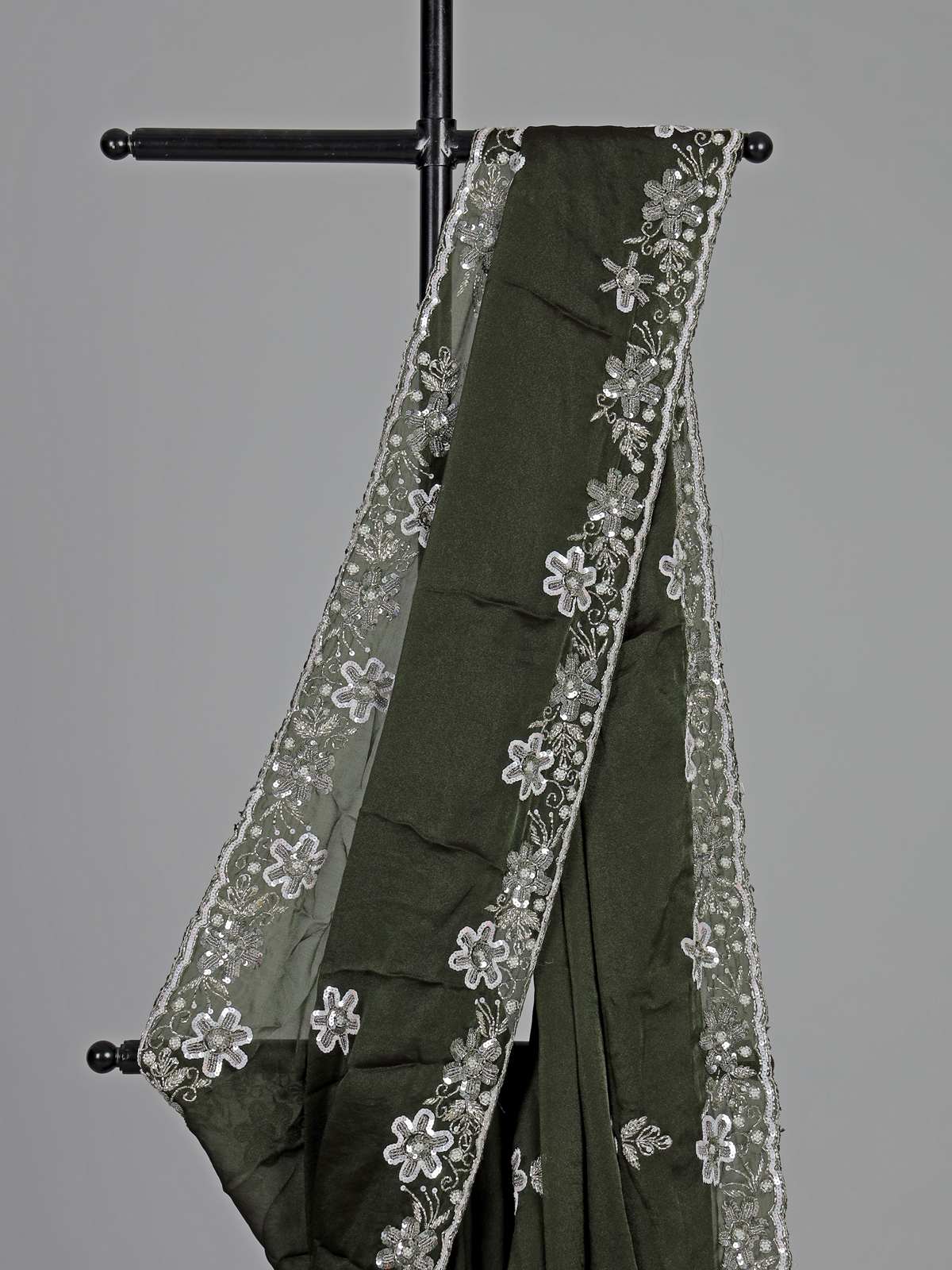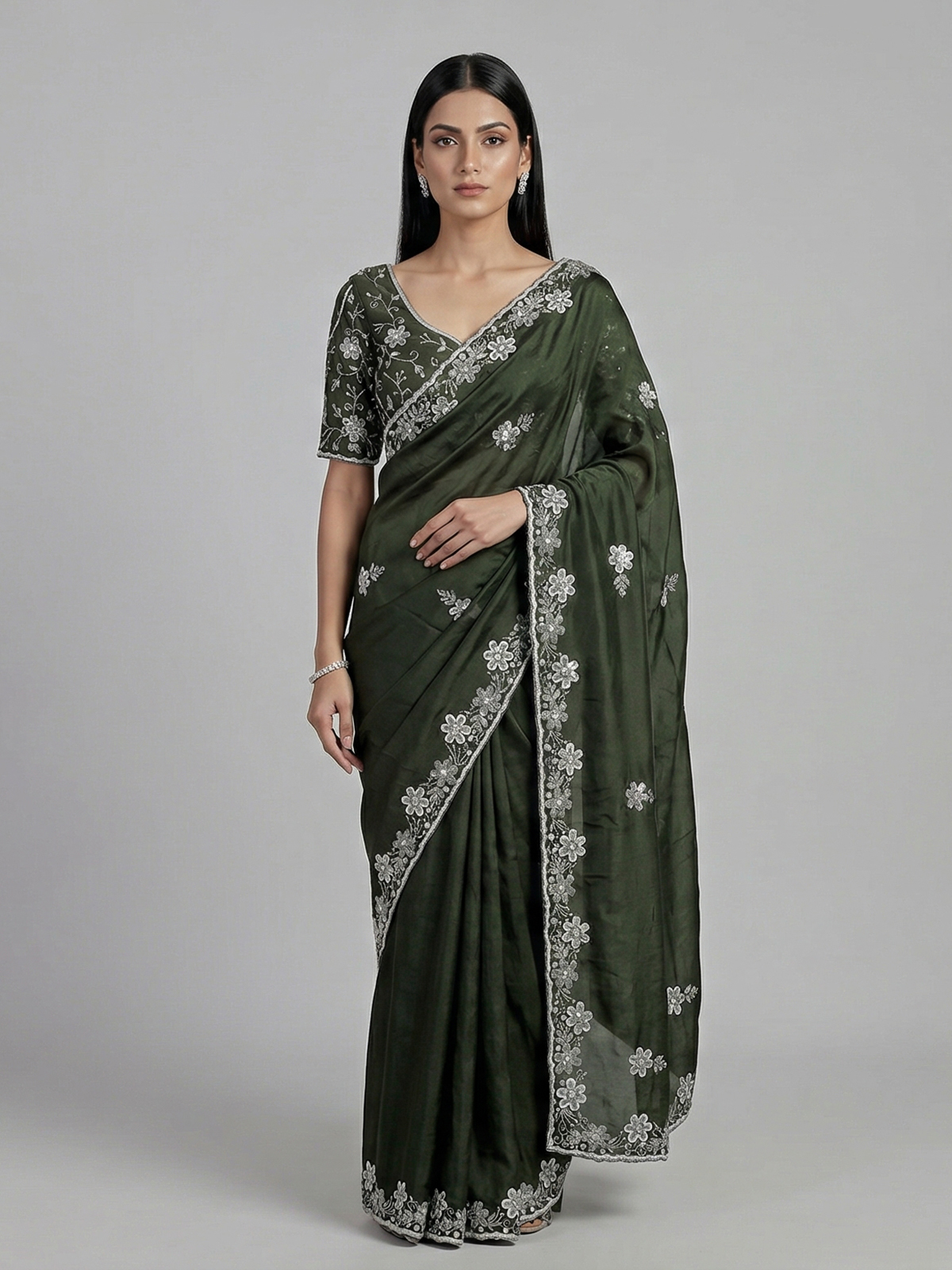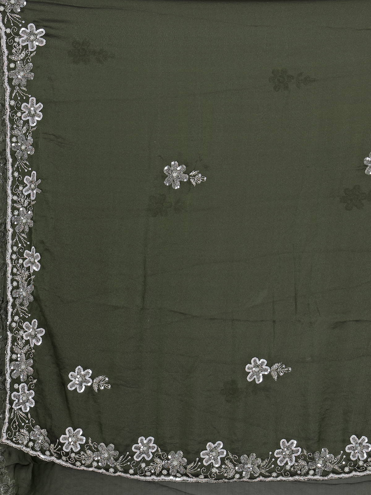 Rich mehendi green bring vibrant festive charm to this chiffon saree crafted for special occasions. Adorned with cutdana, sequins and pearl embellishments. It radiates graceful shimmer. The lightweight drape flows effortlessly, enhancing elegance. Perfect for weddings, mehendi and sangeet. It comes with an unstitched blouse piece for a refined and customizable ethnic look.