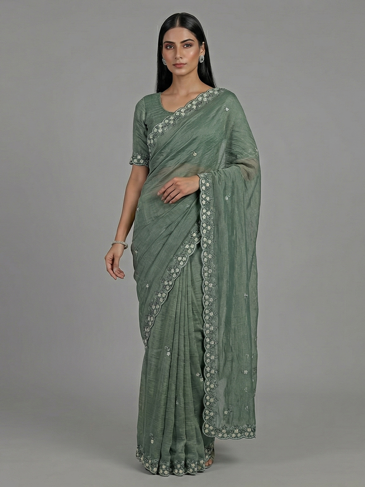 Vibrant mehendi green tones enhance this chiffon saree designed for festive elegance. Detailed with cutdana, sequins, zardosi and pearl work. It reflects rich craftsmanship. The fluid drape adds movement and grace. Perfect for weddings, mehendi and sangeet functions. This saree comes with an unstitched blouse piece for a complete and refined ethnic ensemble.