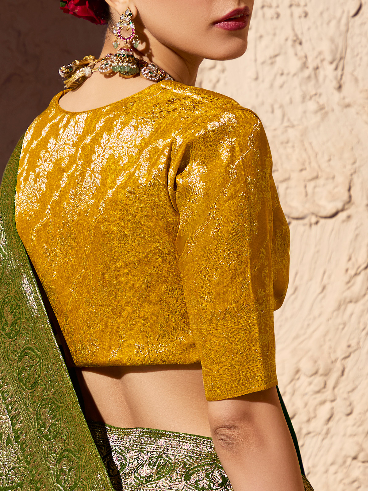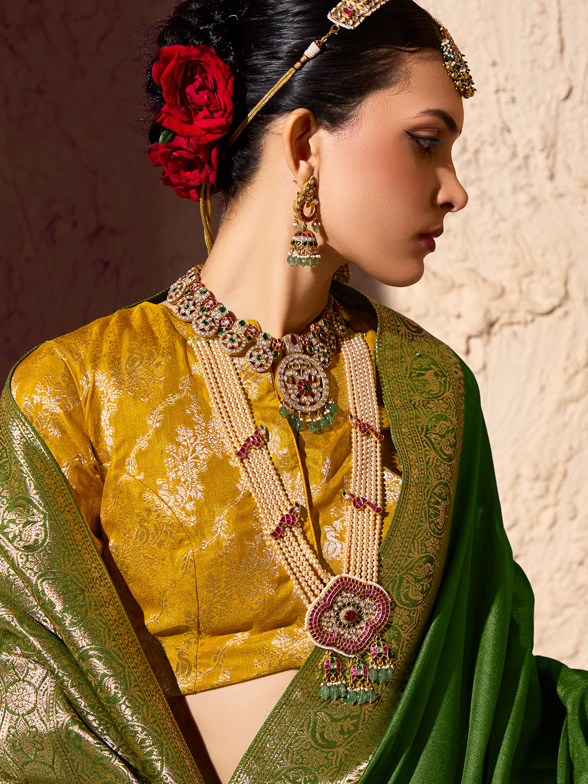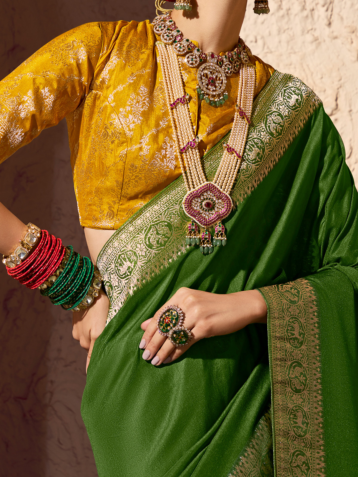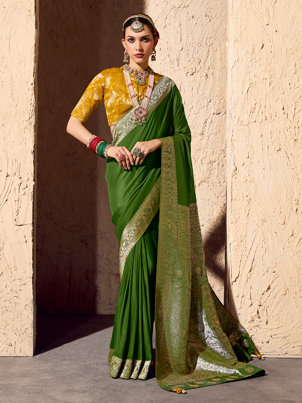 This mehendi green crepe georgette saree is beautifully adorned with classic zari work for traditional charm. Comes with an unstitched blouse piece, making it an ideal choice for weddings, festive wear, receptions and special mehendi ceremonies.