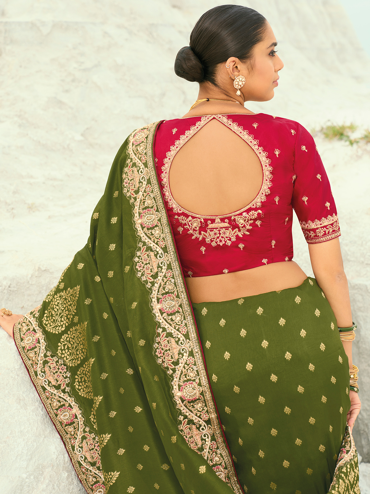 Draped in serene mehendi green dola viscose, this saree features intricate cutdana, beads, sequins, resham, and zari detailing. The rich craftsmanship and festive glow make it ideal for mehendi and wedding occasions. Includes a contrasting unstitched blouse piece.
