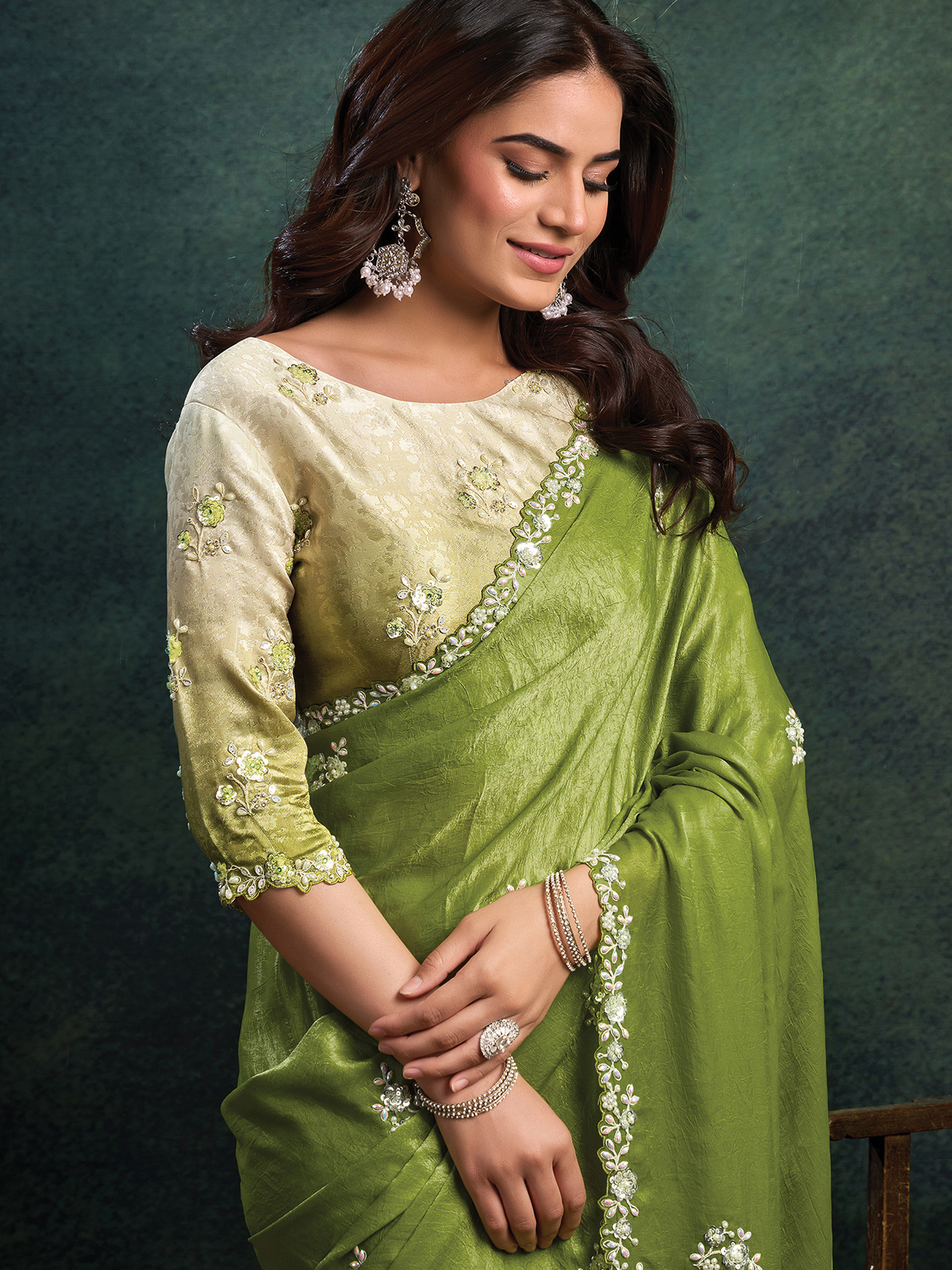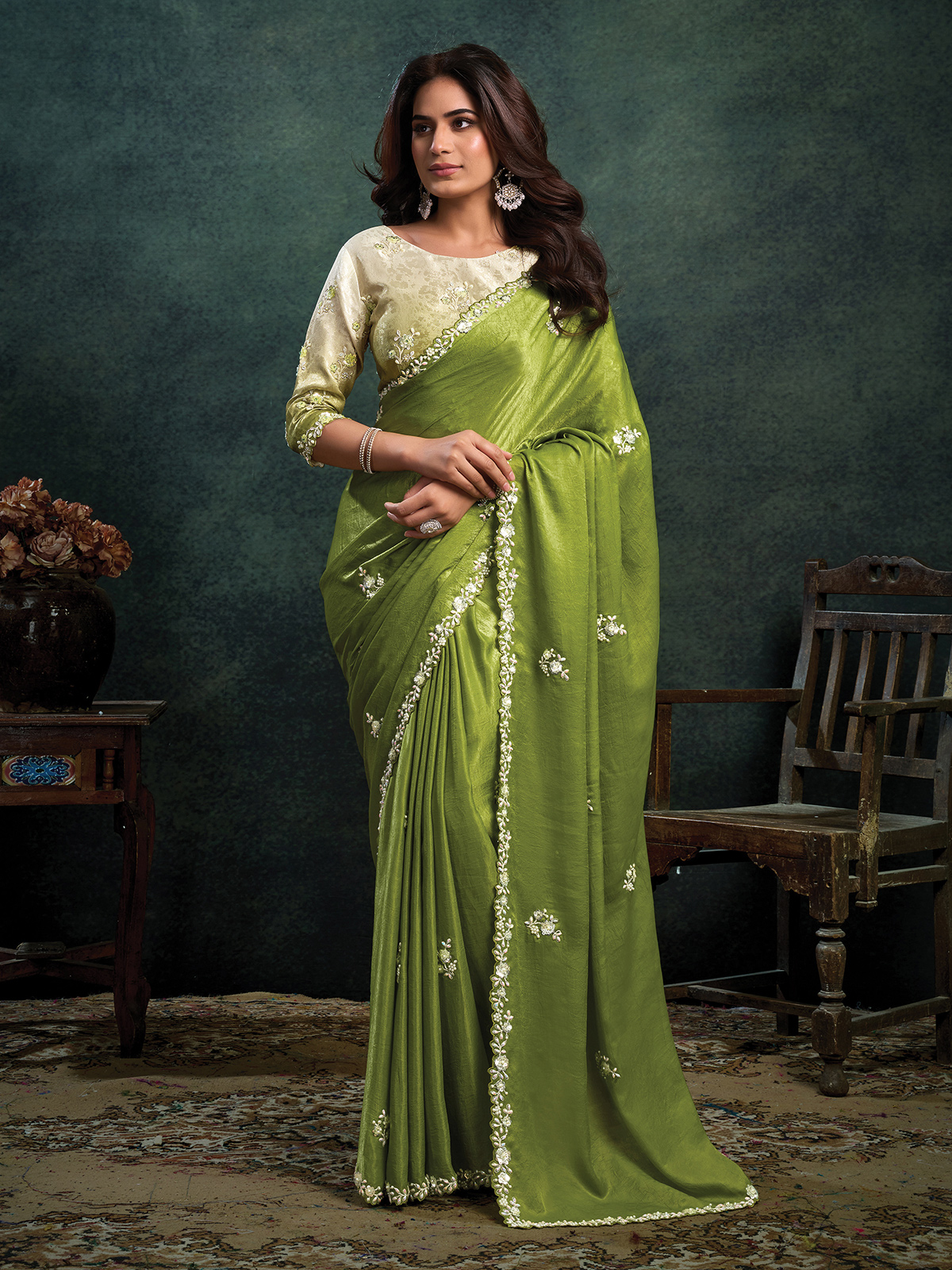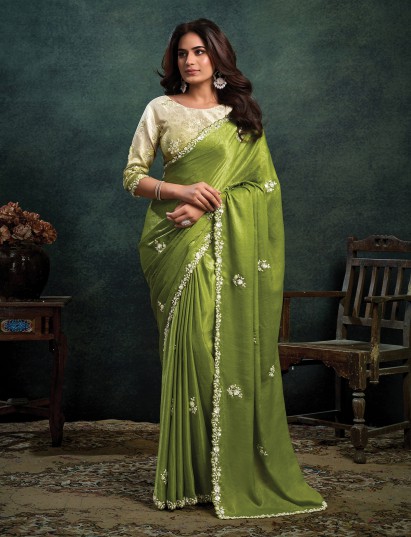 Mehendi Green Embellished Satin Silk Saree