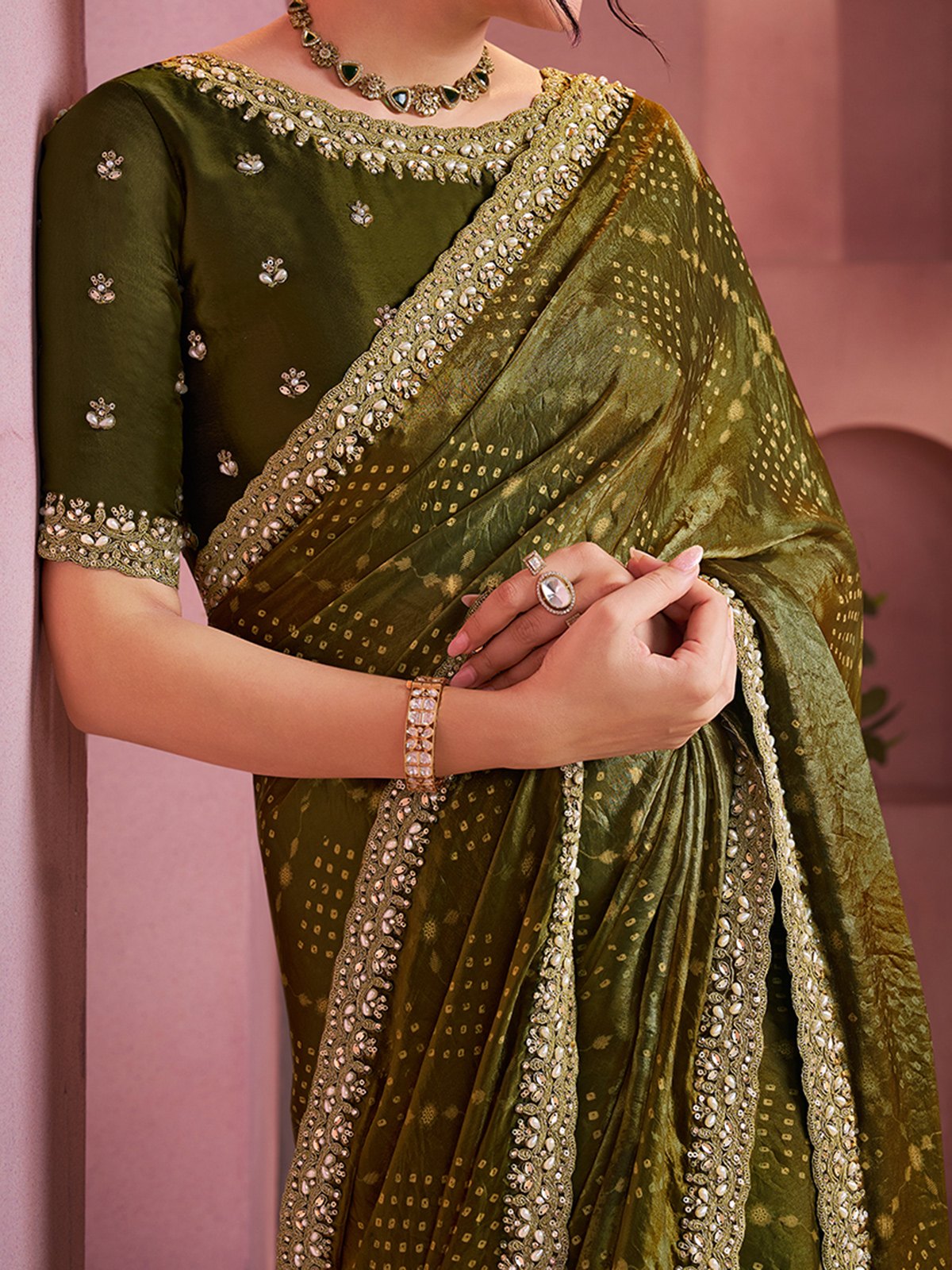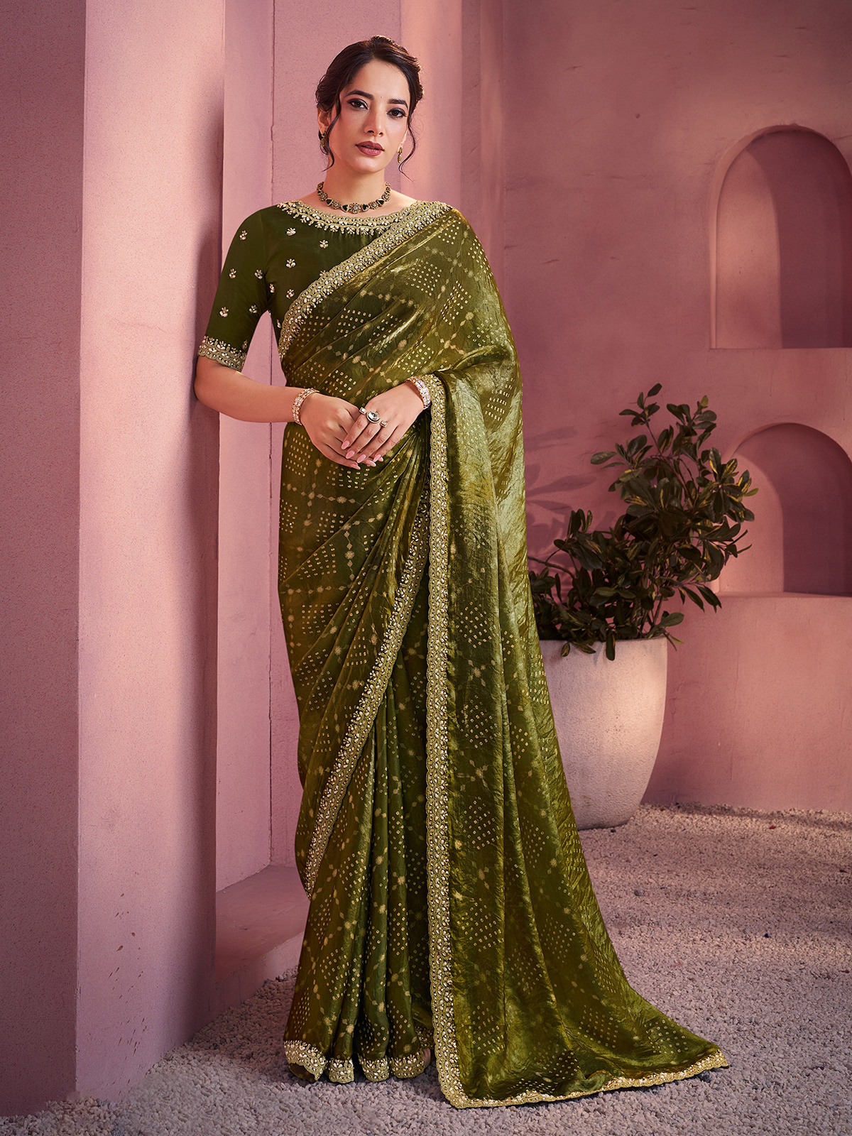 Mehendi Green Gajji Bandhani Satin Silk Saree