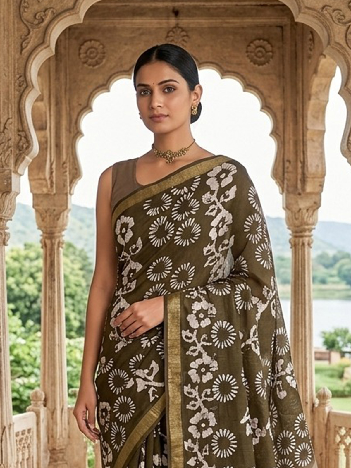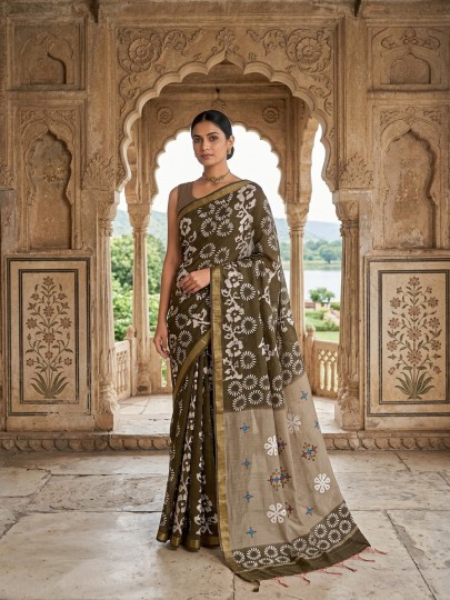 Elevating your feminine allure, this mehendi green chanderi saree reflects rich festive elegance with a soothing appeal. Designed with intricate printed patterns and enhanced by fine thread and sequins detailing for a graceful finish. Ideal for festive wear, it is paired with an unstitched blouse piece, offering versatility and a beautifully coordinated ethnic look.