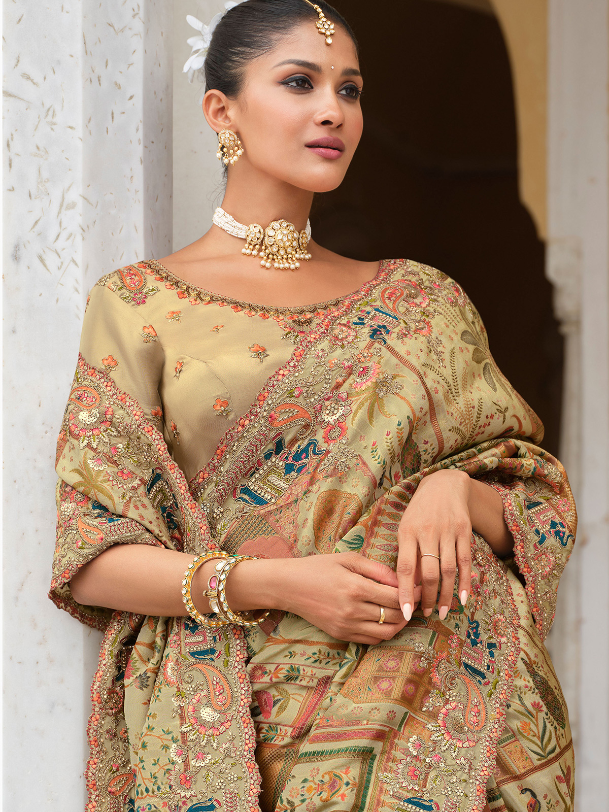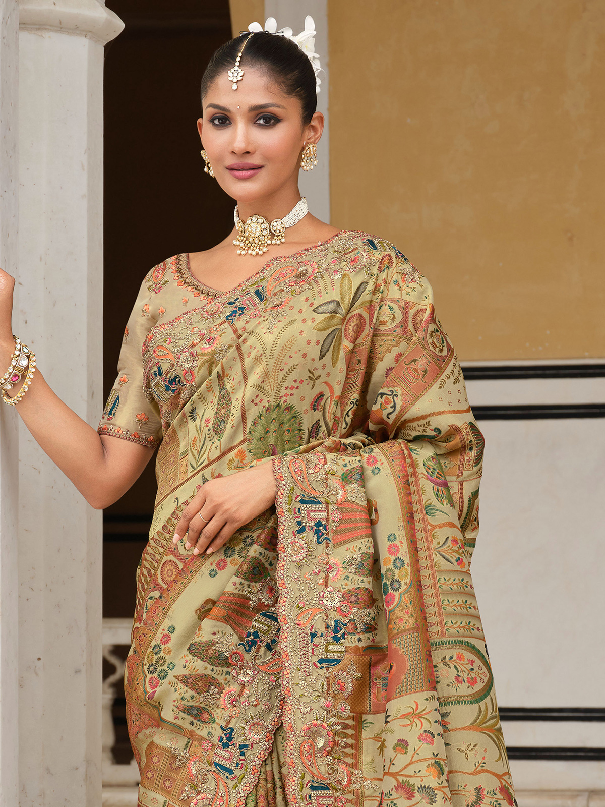 Adorned with vibrant prints and detailed khatli work, this mehendi green silk saree sparkles with sequins, zardosi and fine embroidery. Its earthy festive charm makes it an ideal pick for mehendi ceremonies, weddings and joyful sangeet occasions, complete with an unstitched blouse.