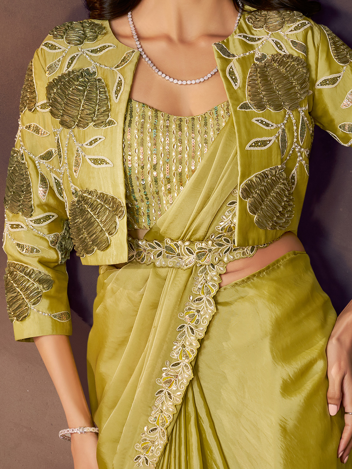 In lush mehendi green soft satin silk, this saree gleams with thread, sequins, pearls, diamond, and patch artistry. The waist belt and jacket silhouette blend tradition with trend—perfect for weddings and festive nights.