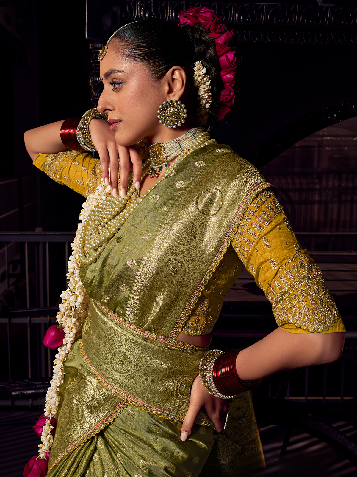 Celebrate traditions in this mehendi green viscose tissue silk saree, adorned with exquisite cutdana, beads, resham, and zari work. Perfect for weddings, festive occasions, and mehendi ceremonies, it includes an unstitched blouse piece for a customized, elegant, and graceful finish.