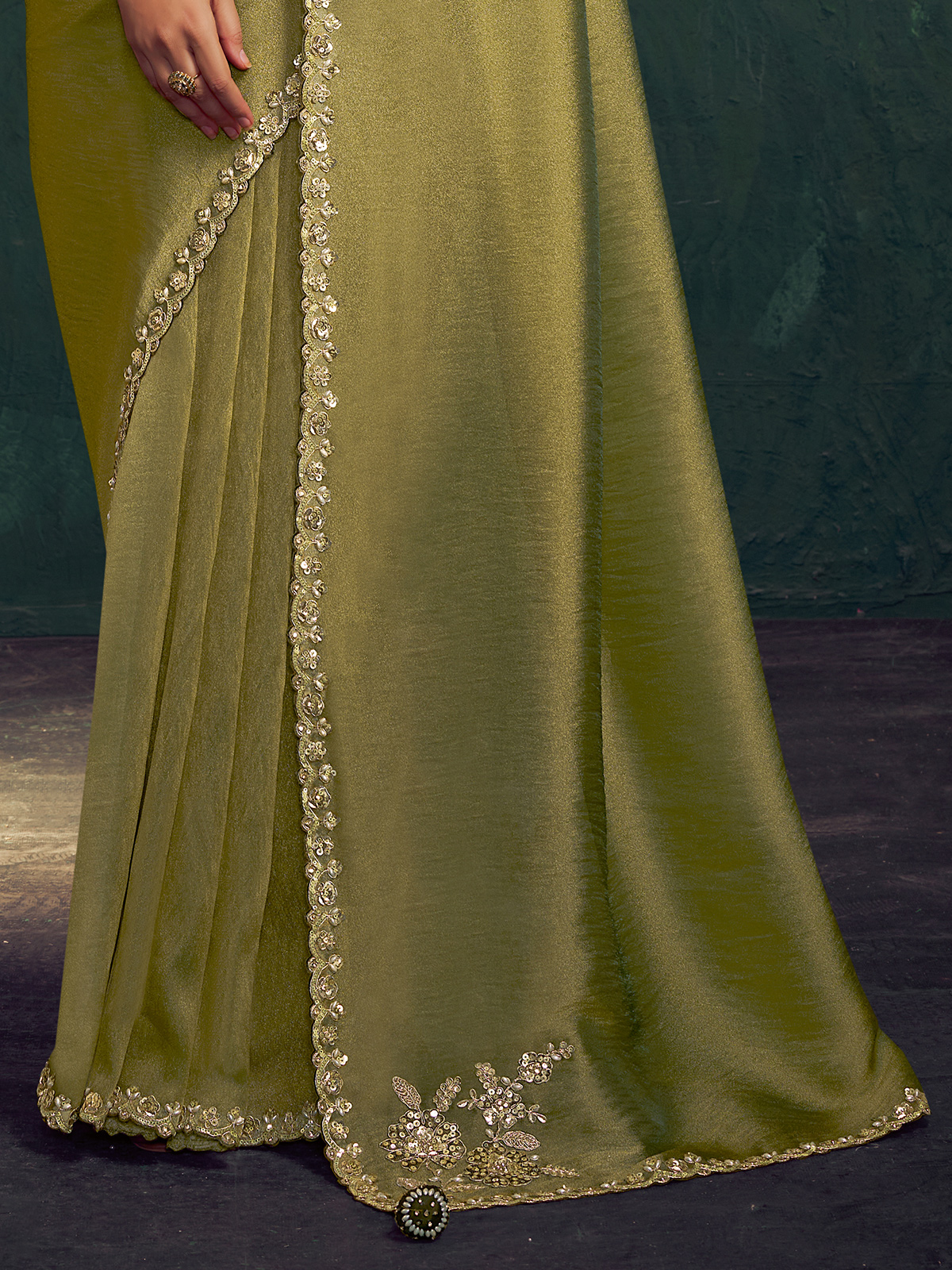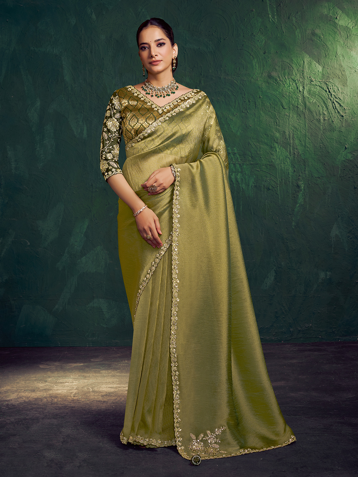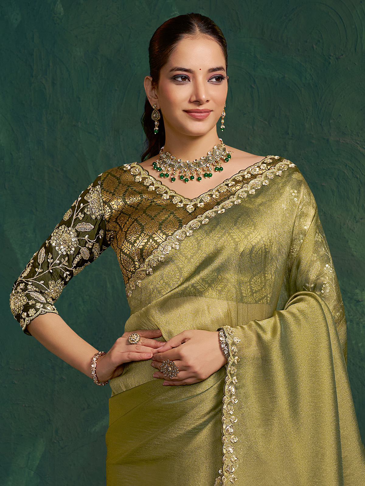 Rendered in soothing mehendi green zari tissue silk, this saree features embroidery, sequins and stone work for subtle sparkle. The fluid drape adds effortless grace. Accompanied by a contrast unstitched blouse piece, it is perfect for weddings, mehendi ceremonies, sangeet nights and festive celebrations.