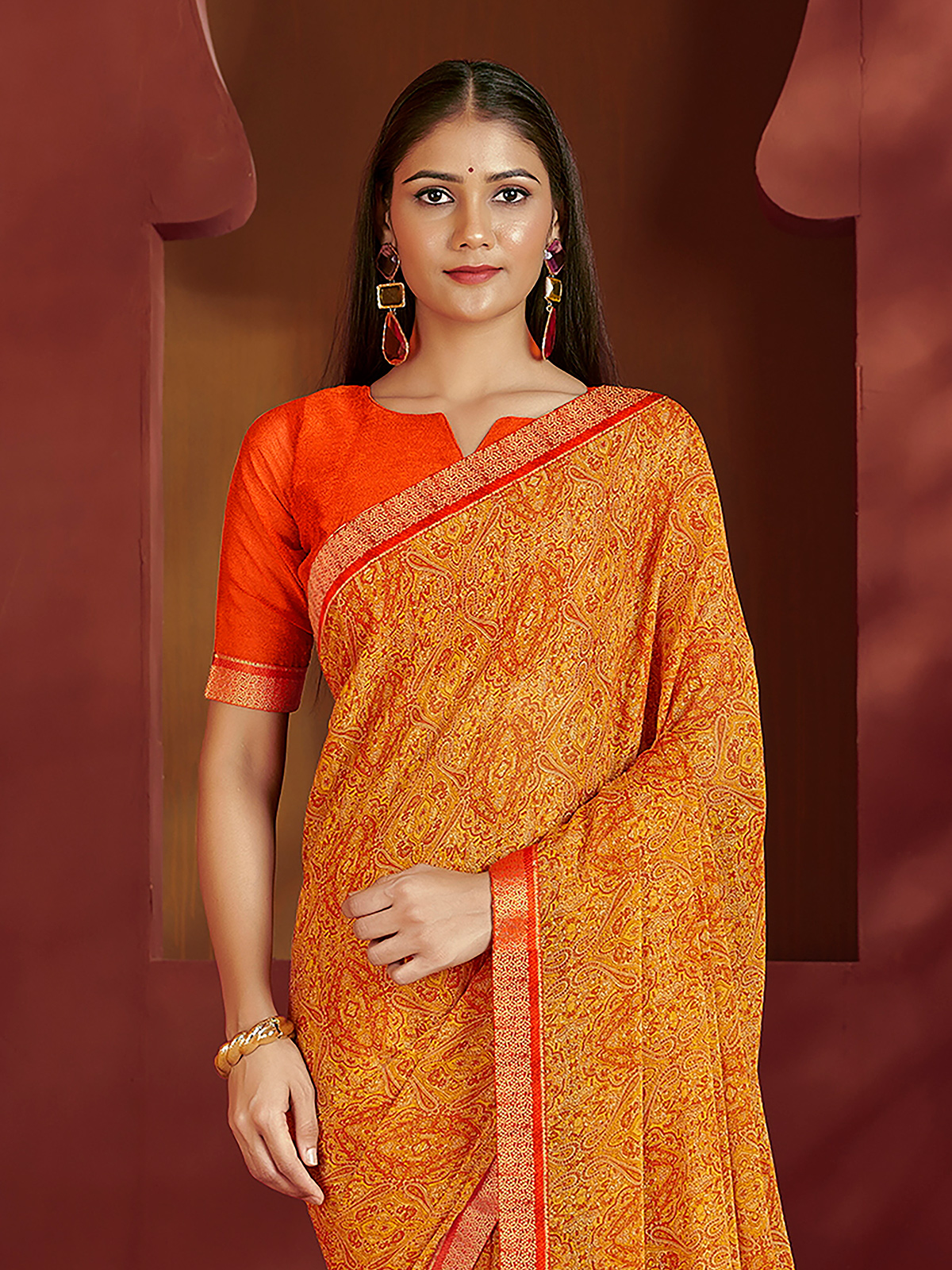 Crafted in breezy chiffon, this mehendi yellow saree features attractive printed motifs highlighted with lace detailing and a zari-work border. Its bright tone adds festive vibrance while remaining lightweight. Paired with an unstitched blouse piece, it is perfect for festive events, puja rituals, mehndi functions and haldi celebrations.