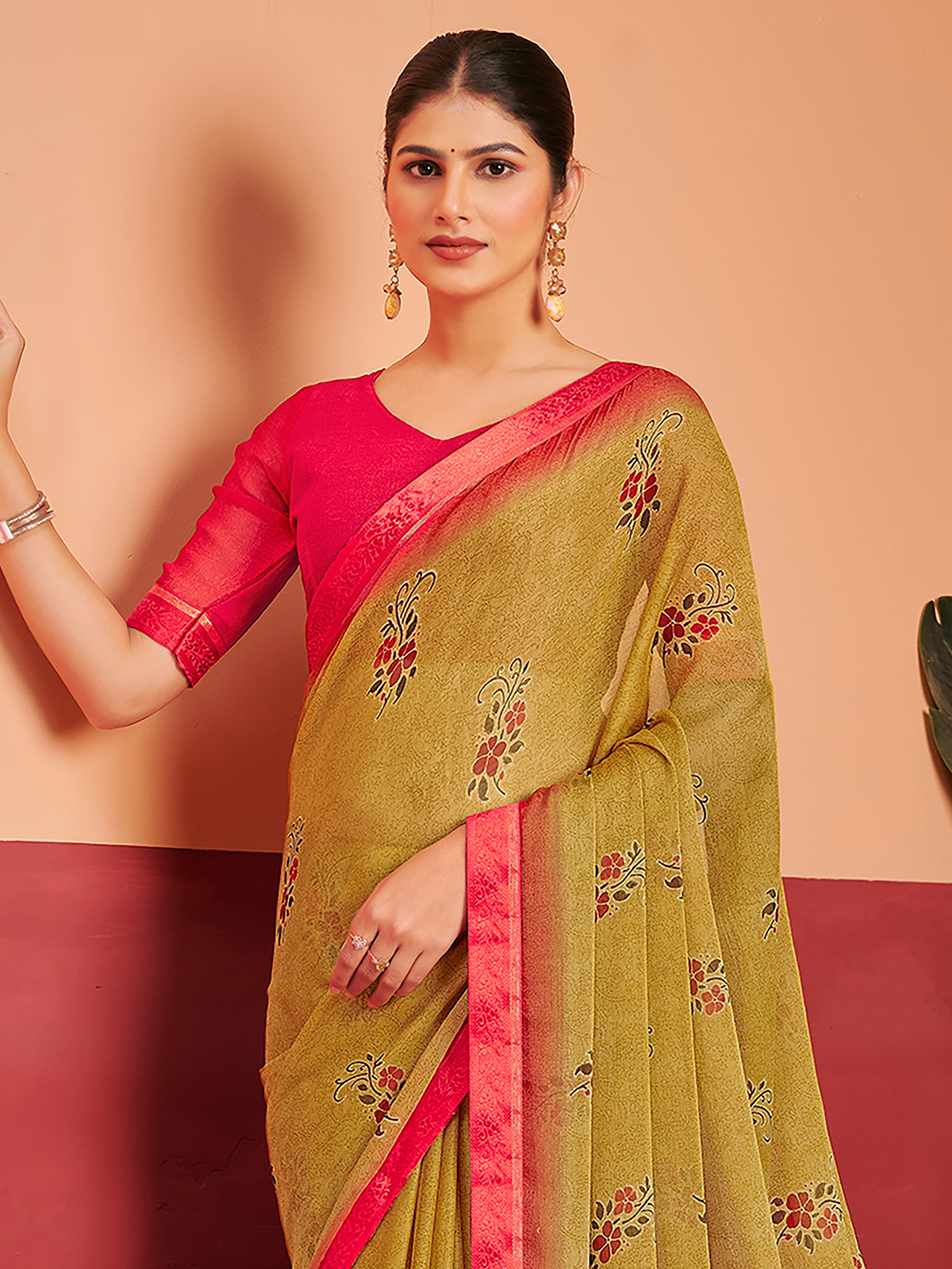 Crafted in breezy georgette, this mehendi yellow saree showcases floral printed motifs with a gentle shaded effect for vibrant appeal. Lace detailing along the borders adds elegance and definition. Paired with an unstitched blouse piece, it is a refreshing choice for casual wear, puja functions and festive gatherings.