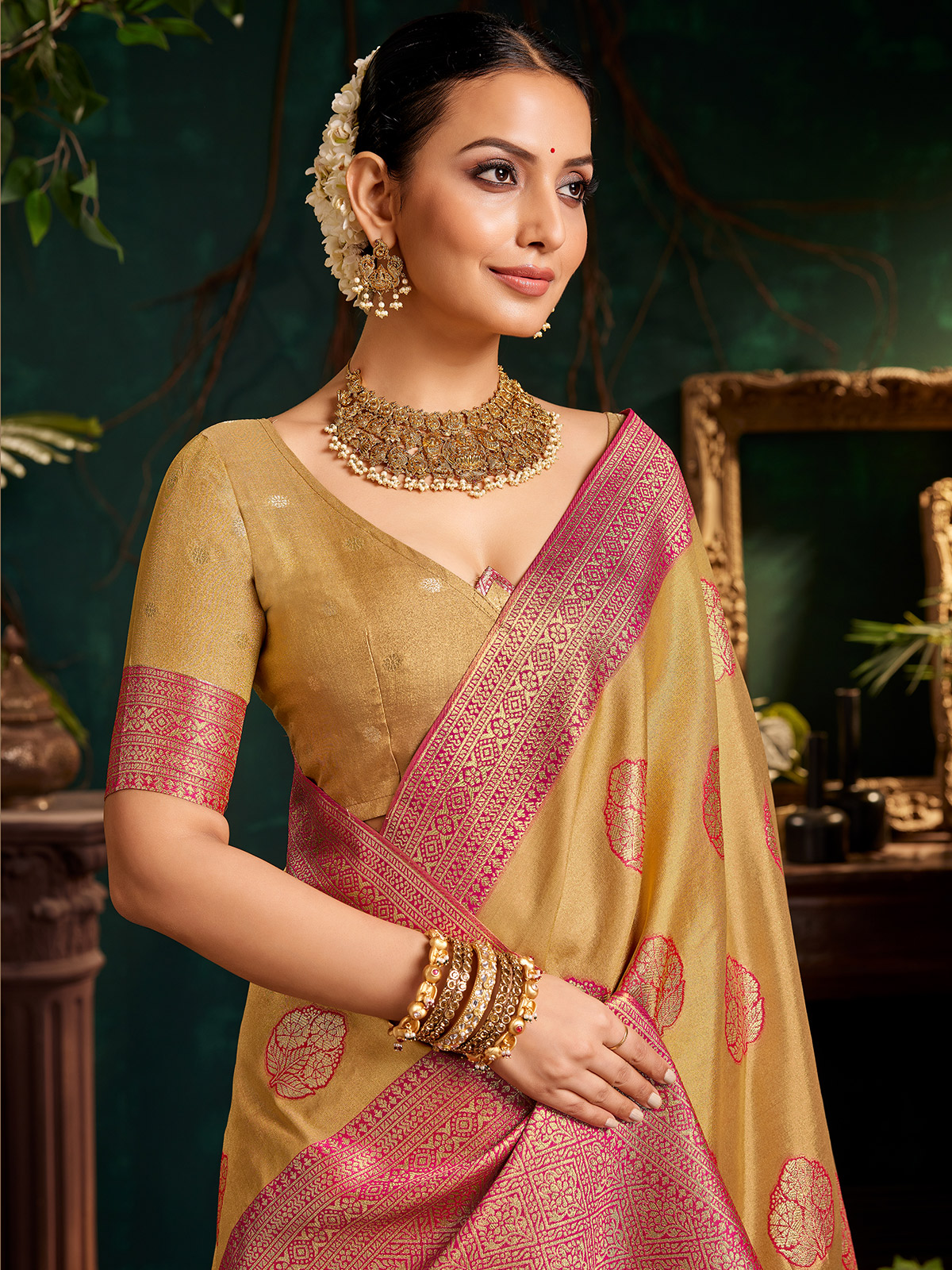 This mehendi yellow dyed silk saree brings alive traditional artistry with its all-over zari floral motifs and heritage patterns. A beautifully emphasised broad border and pallu add grandeur to the drape. Paired with an unstitched blouse, it is a perfect pick for weddings, festive moments and haldi ceremonies.