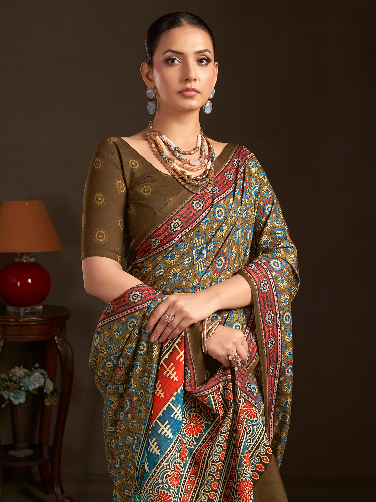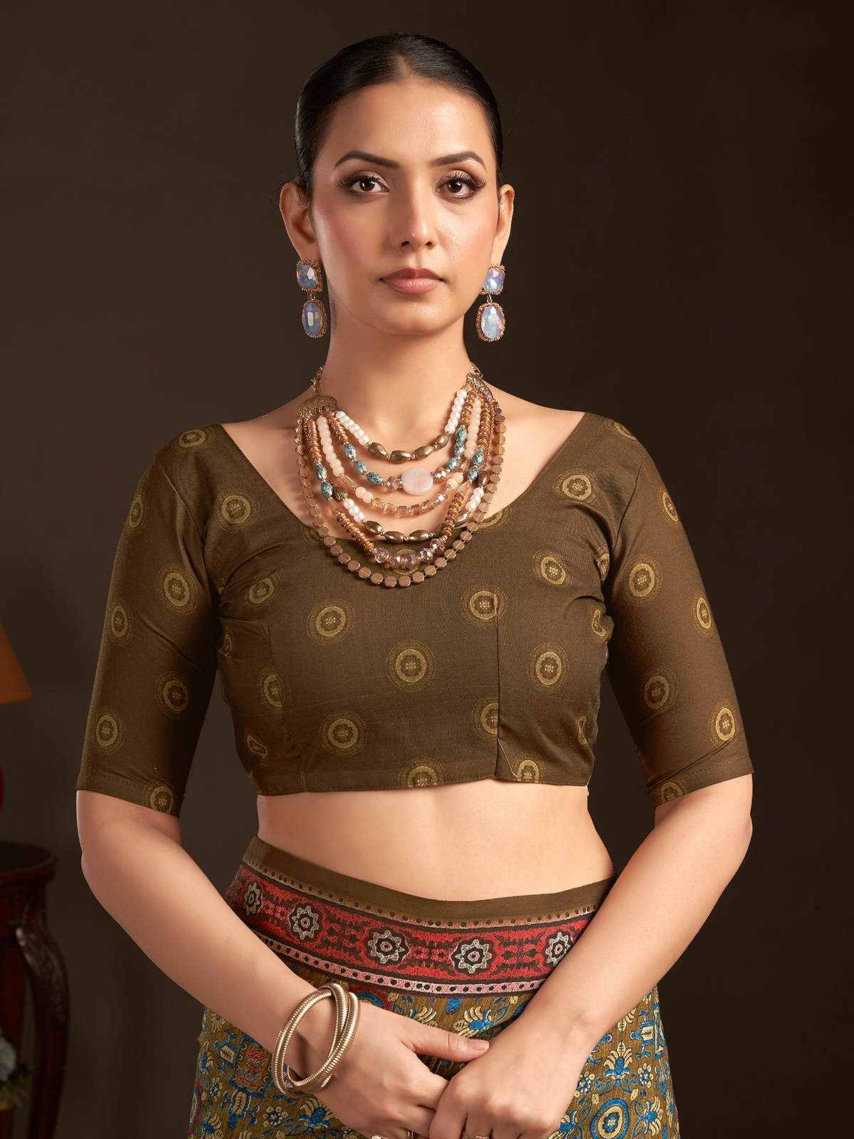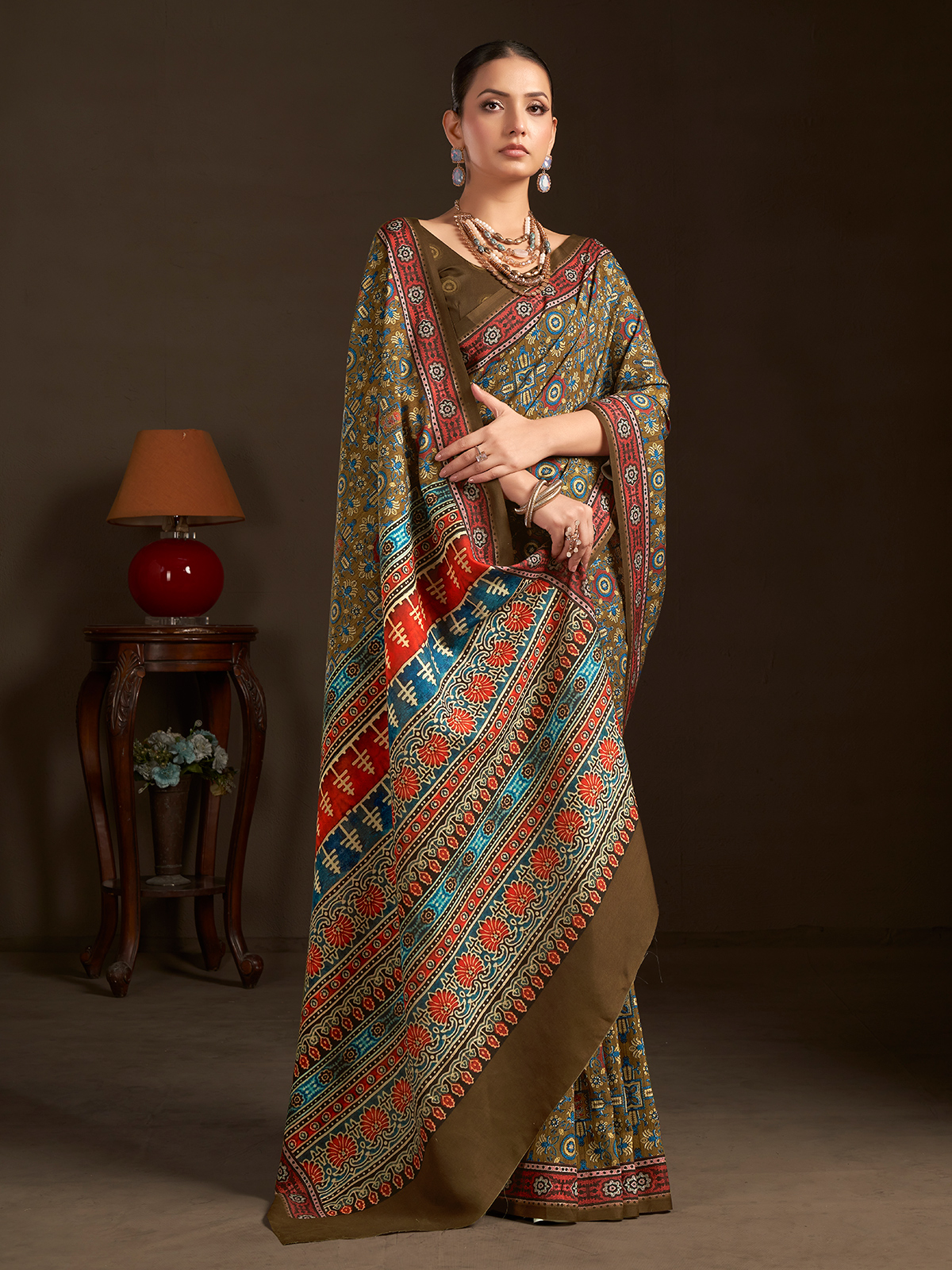 Rich in festive appeal, this mehndi green ready to wear saree features a premium crepe base with stylish digital impressions. The comfortable fall and discreet pocket offer ease throughout long events. Paired with a ready stitched elbow sleeve blouse, it is ideal for mehndi ceremonies, weddings, and celebratory gatherings.