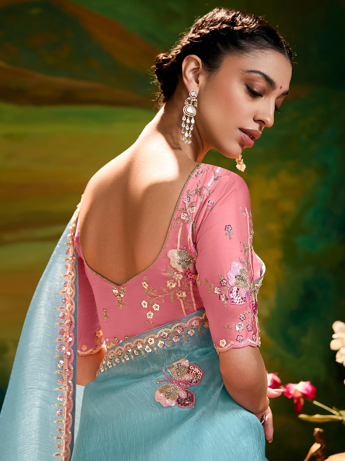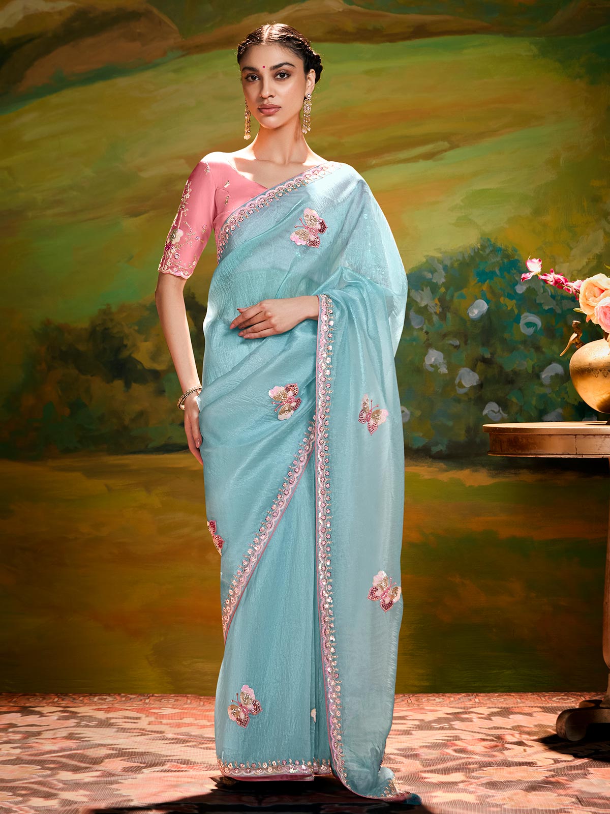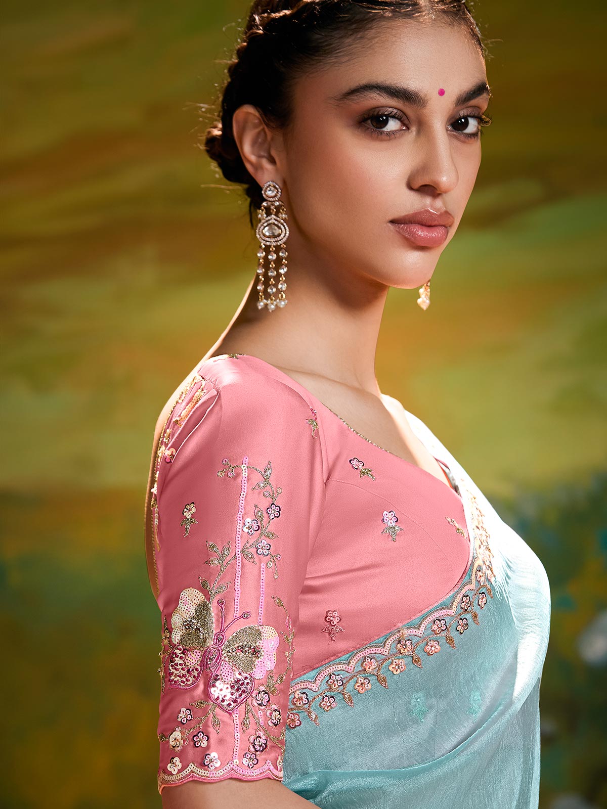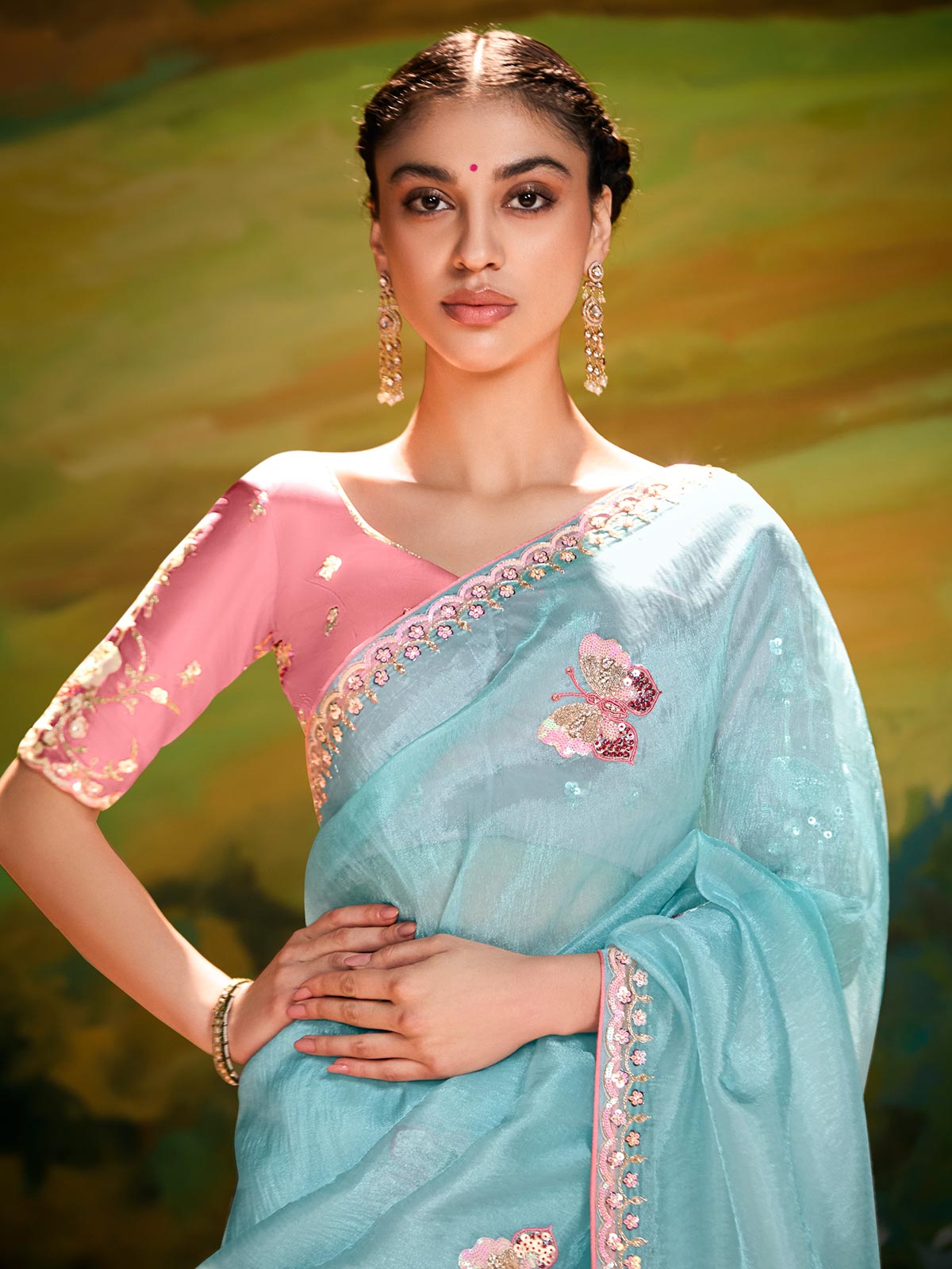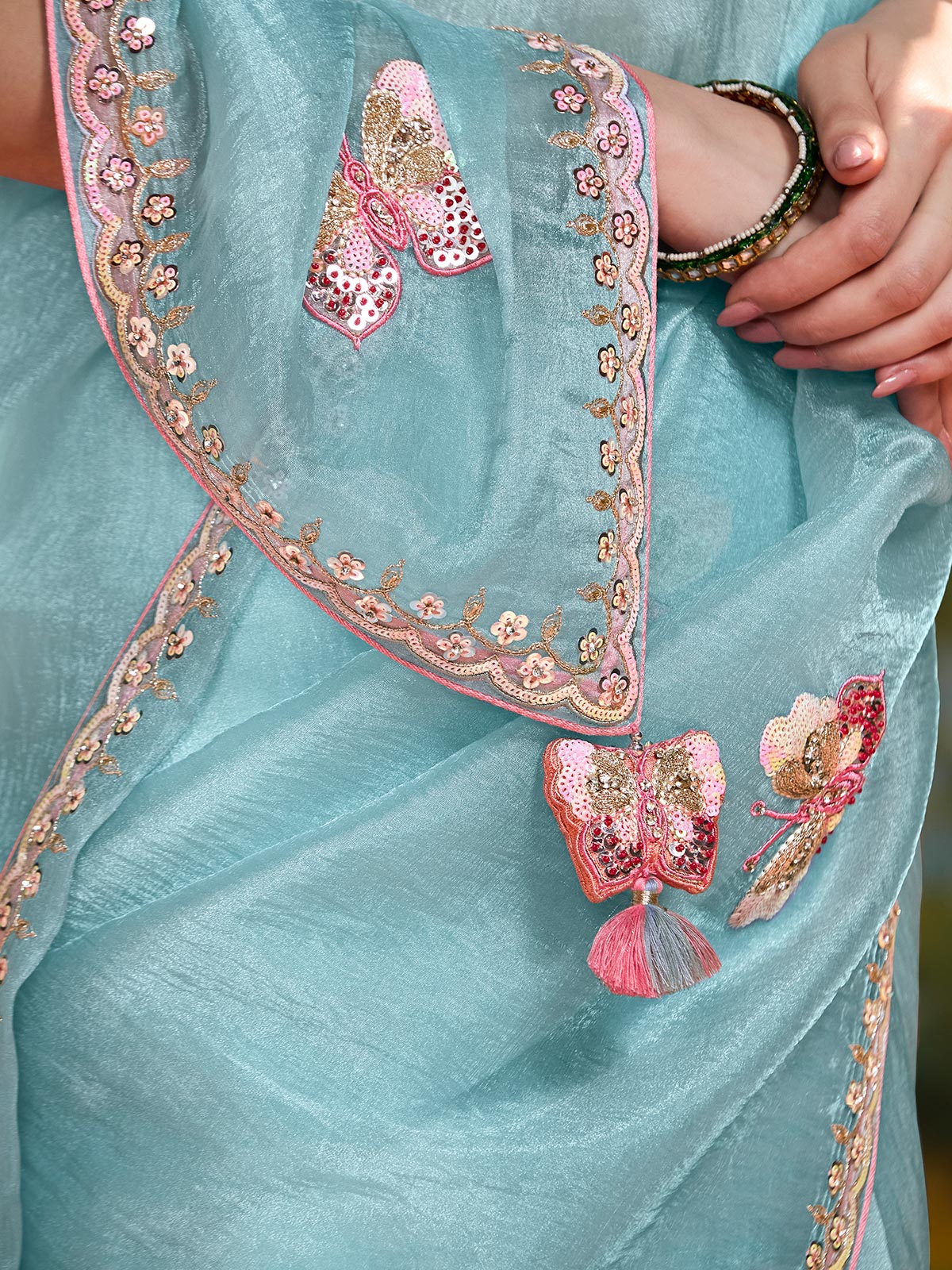 The emerald mint blue silk saree is intricately adorned with sequins and resham threadwork, creating a stunning design ideal for special events. Comes with an unstitched blouse piece.