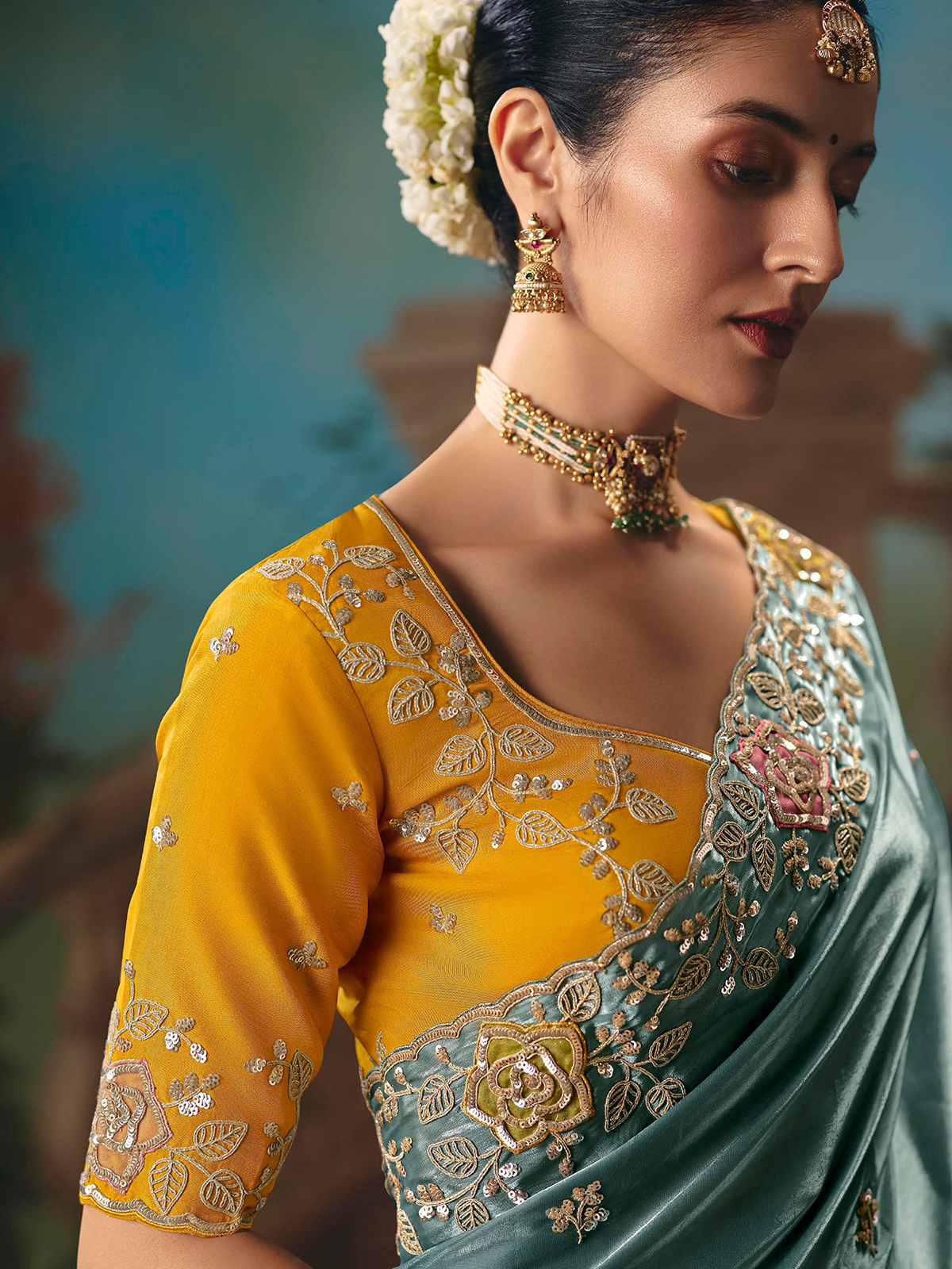 Fresh mint blue fancy tissue silk saree adorned with elegant embroidery, resham and shimmering sequins. Styled with a contrast unstitched blouse piece, its soft sheen and graceful fall make it an excellent choice for weddings, festive wear, sangeet functions and receptions.
