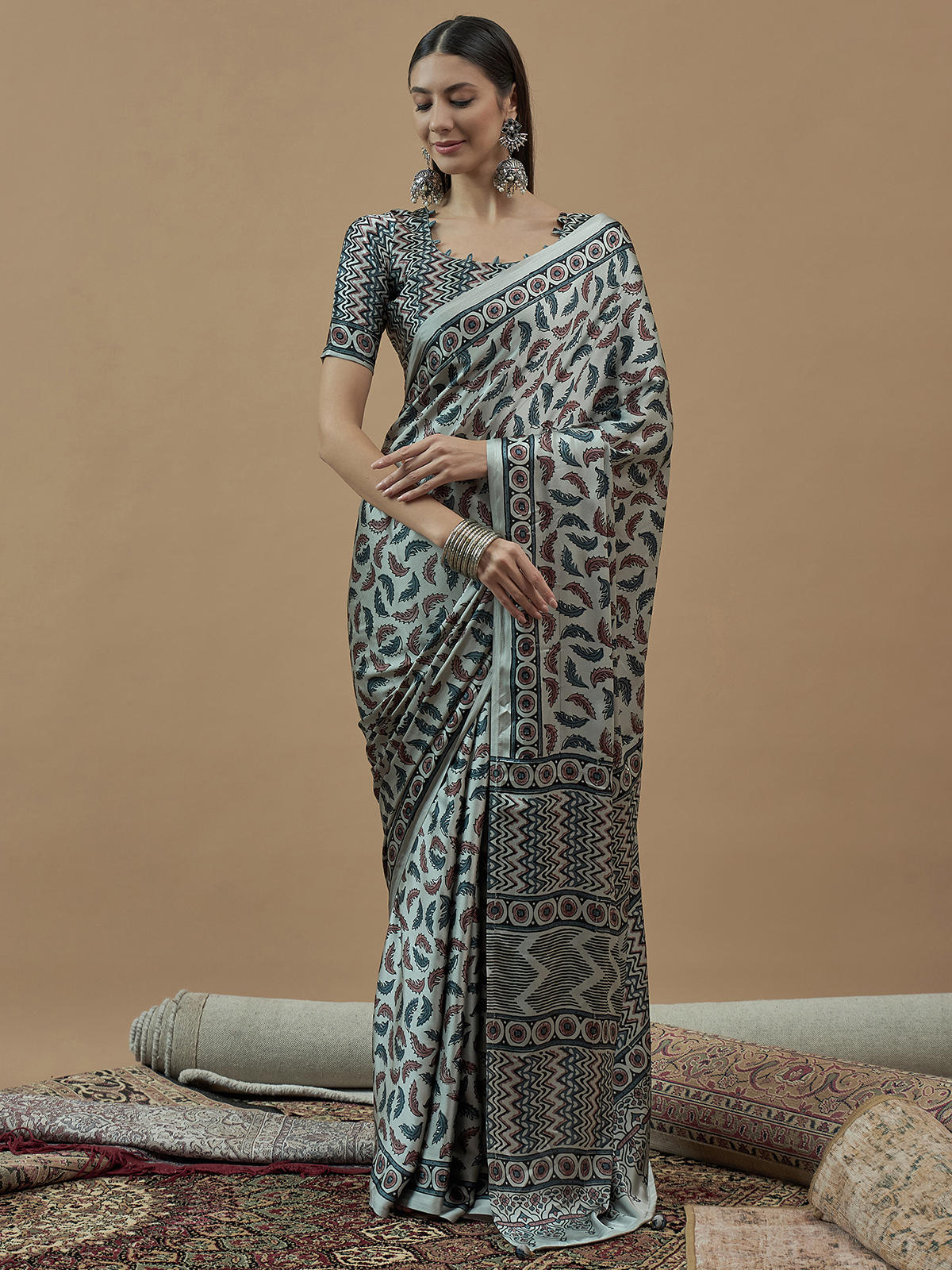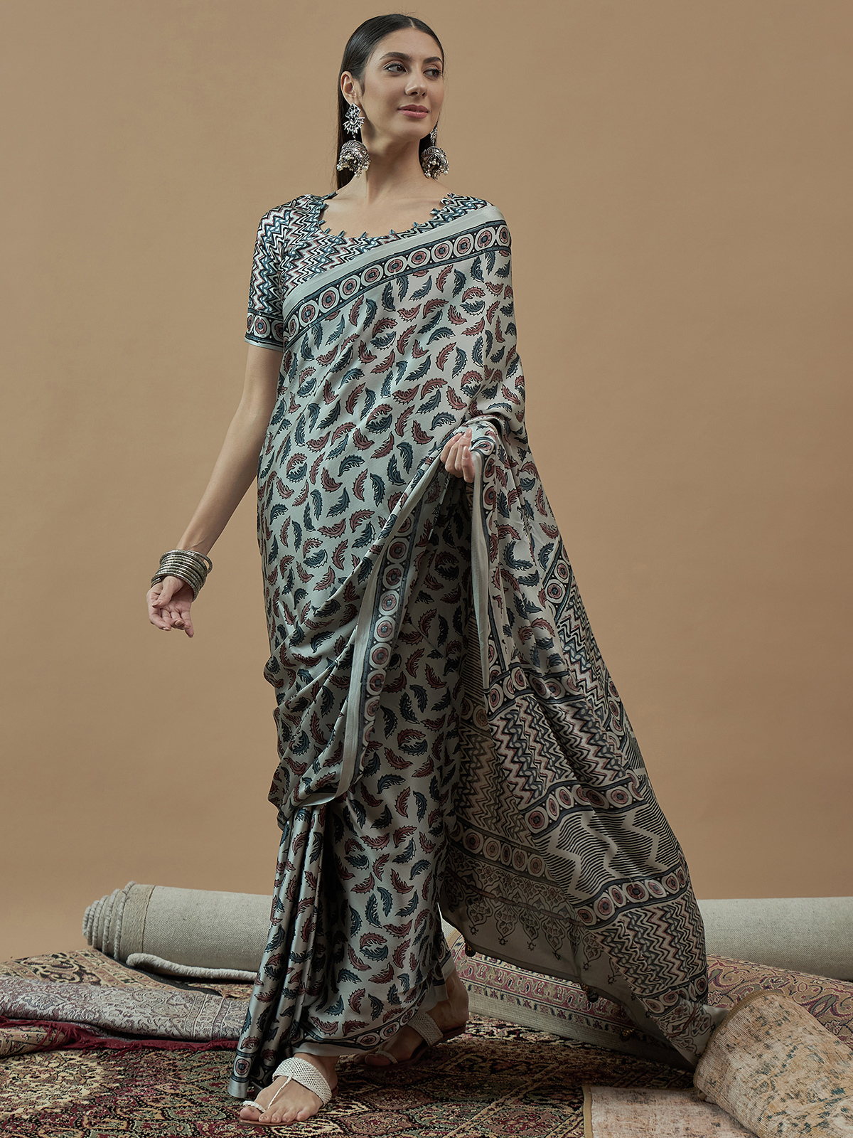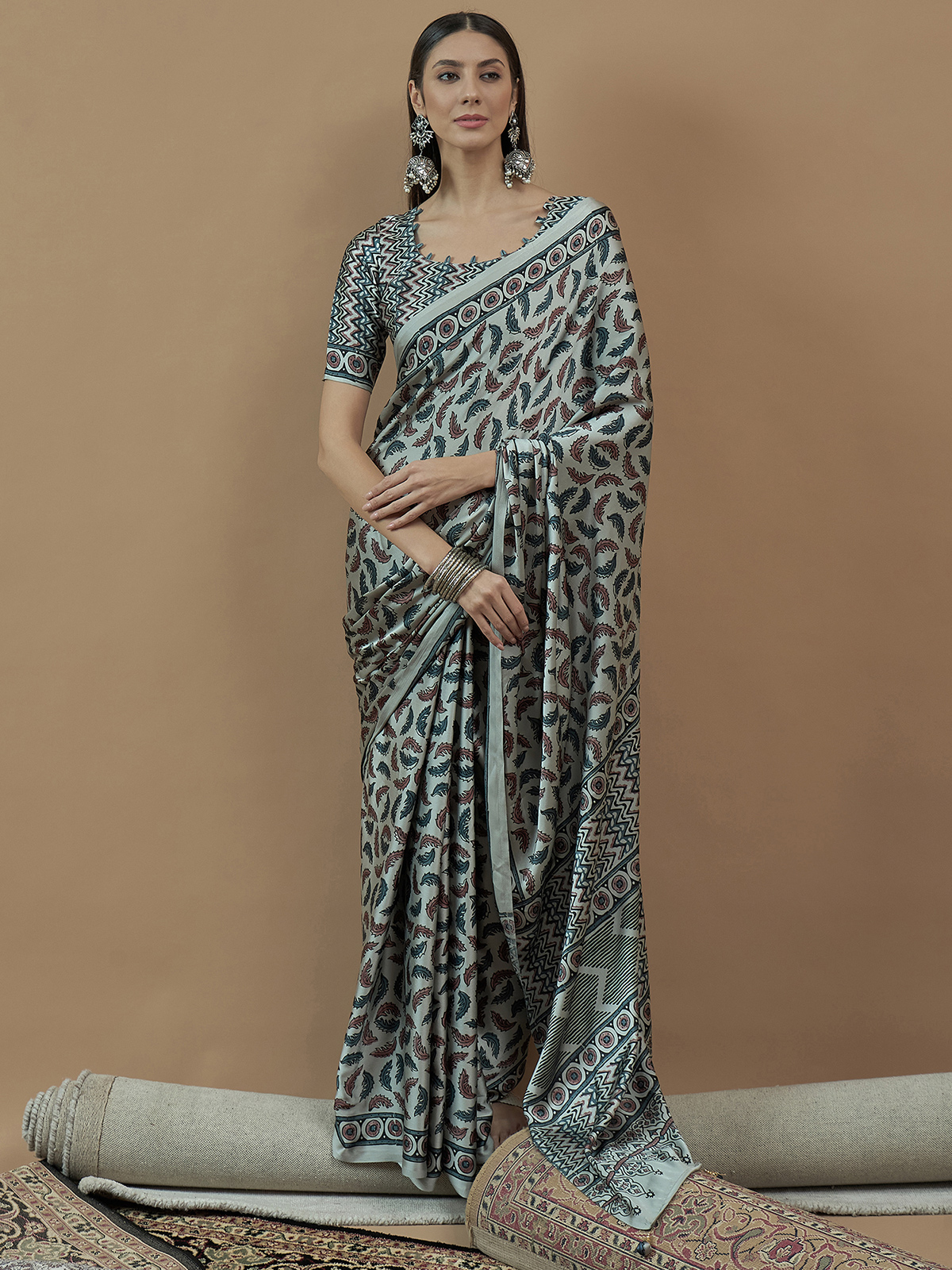Embrace refined ethnic charm with this mint blue japan satin saree. Its heritage inspired print makes it an ideal pick for celebrations and family get togethers. Comes with an unstitched blouse piece.