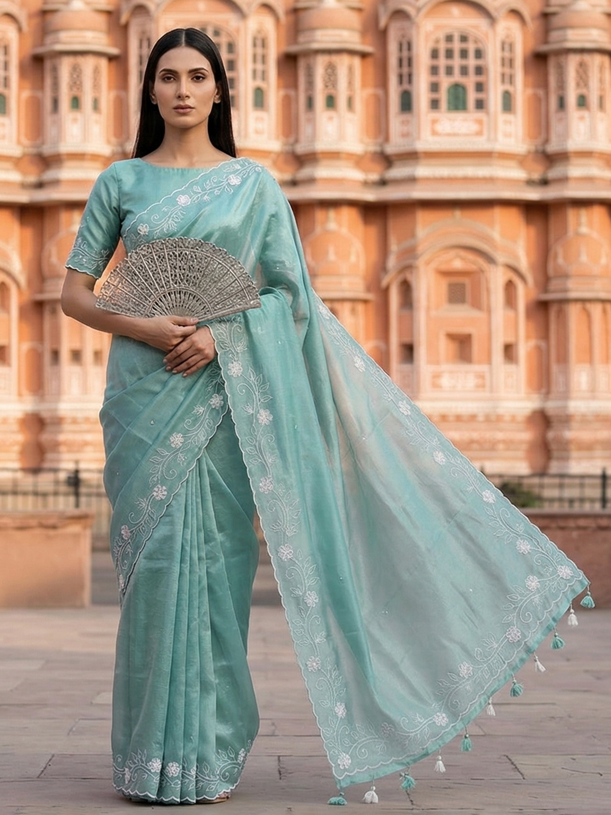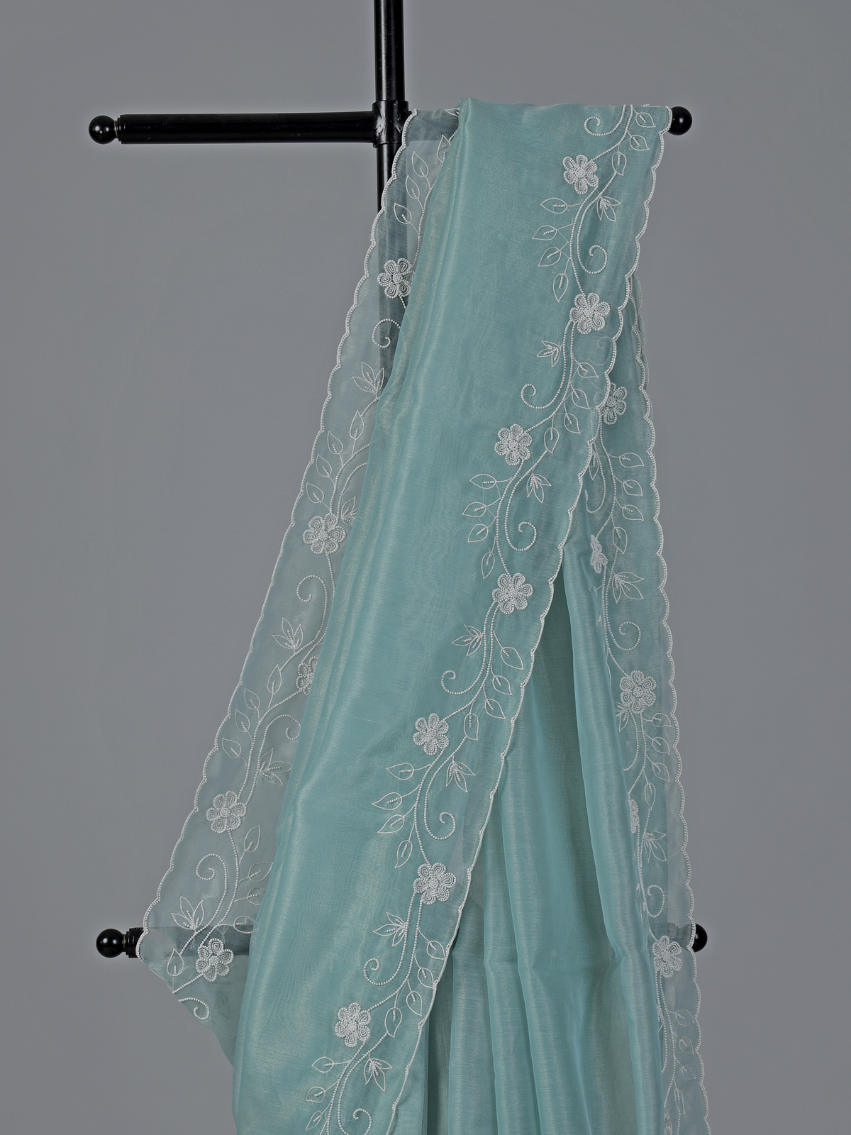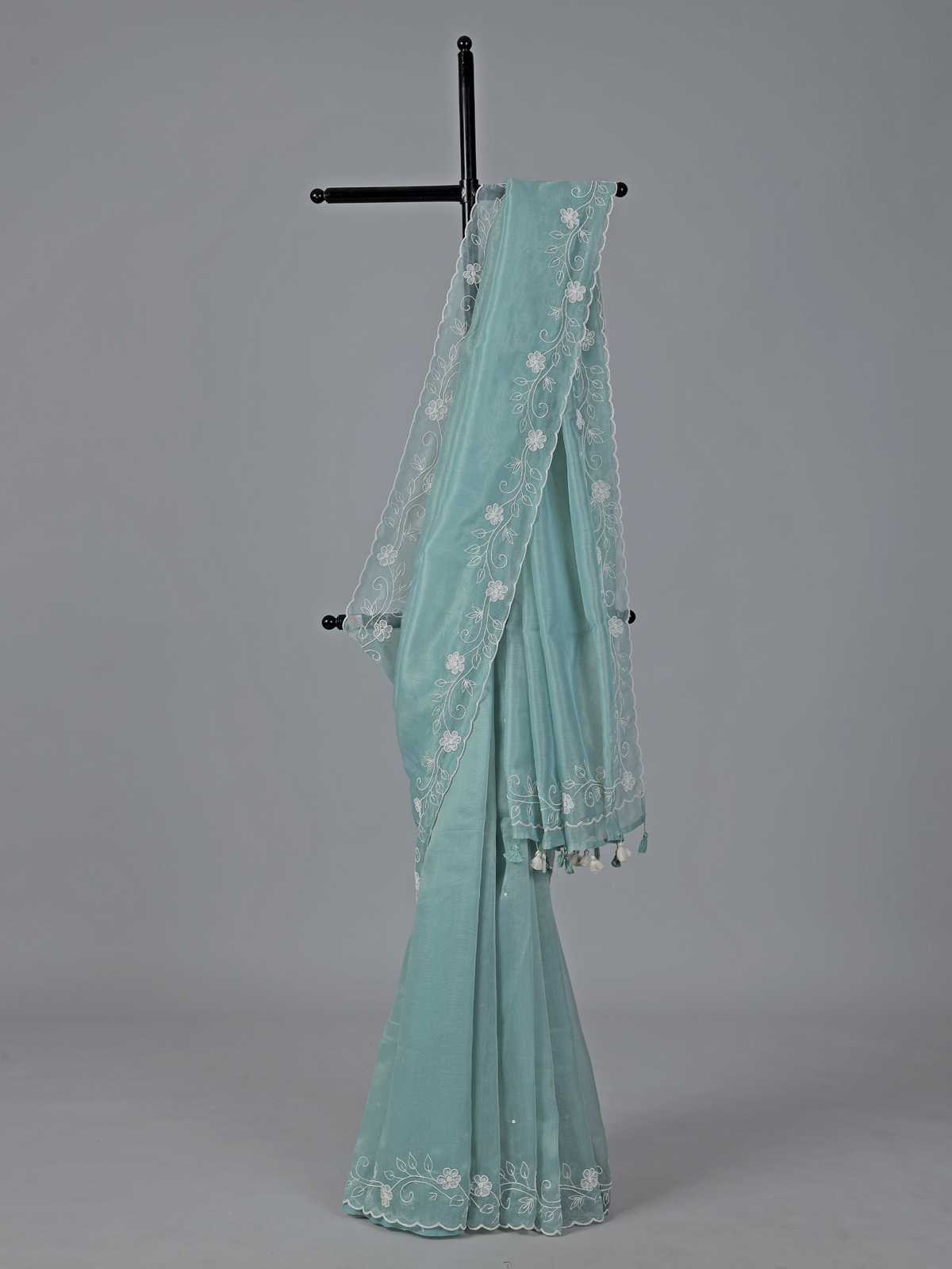 Mint Blue Organza Thread Work Festive Saree Elegance