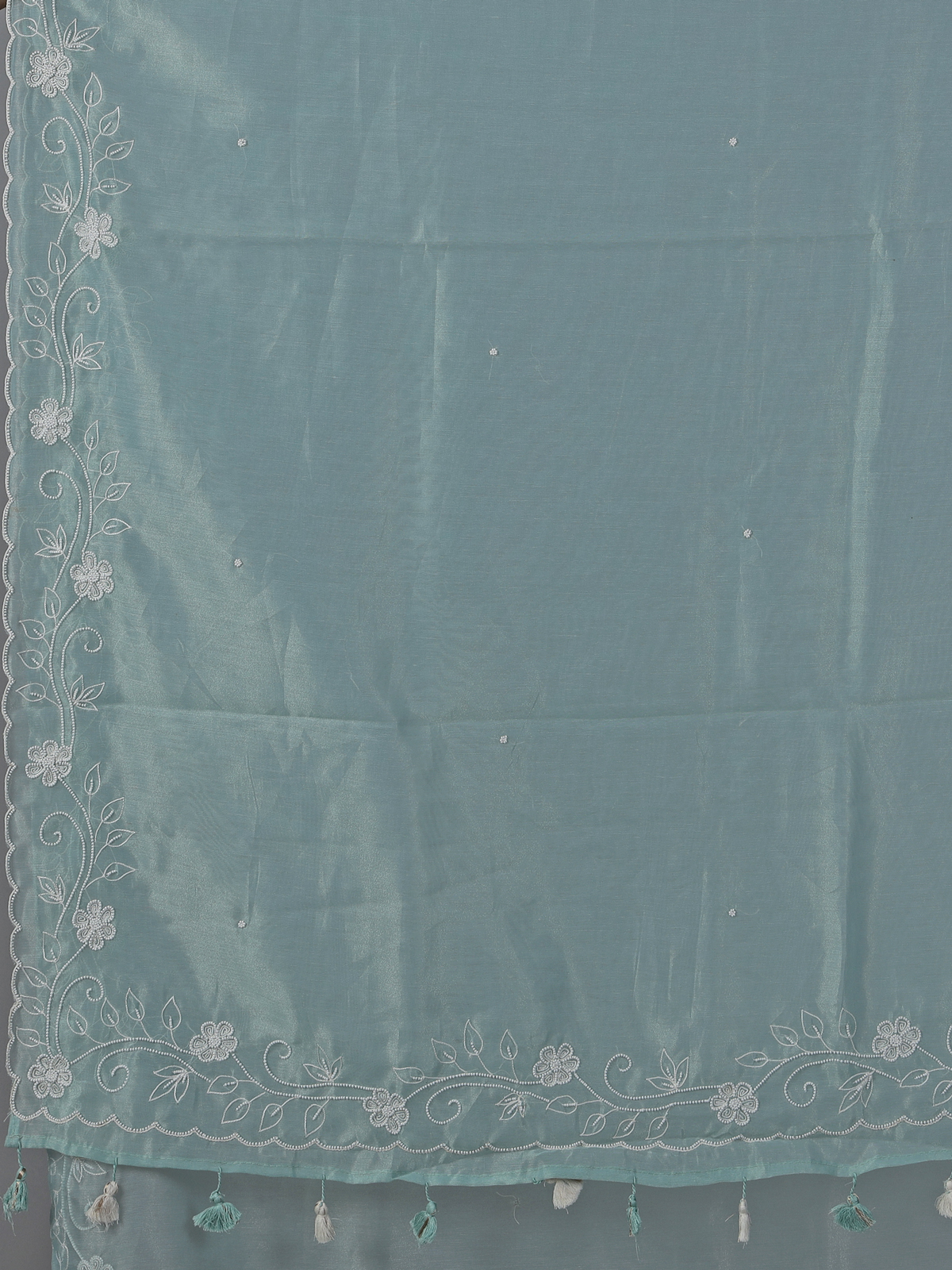 Refreshing mint blue organza saree. Featuring delicate thread and bead work that adds subtle sparkle. The lightweight silhouette enhances its graceful festive appeal. Comes with an unstitched blouse piece for personalized styling.